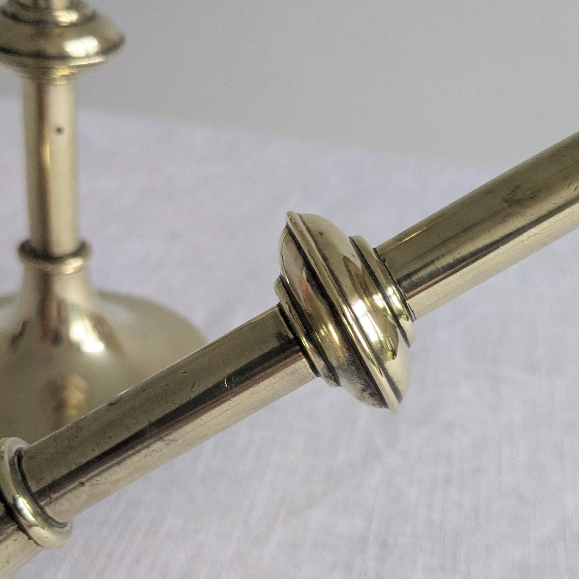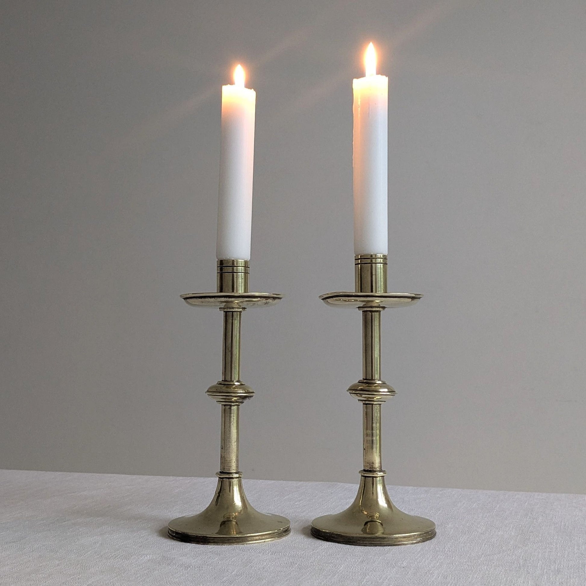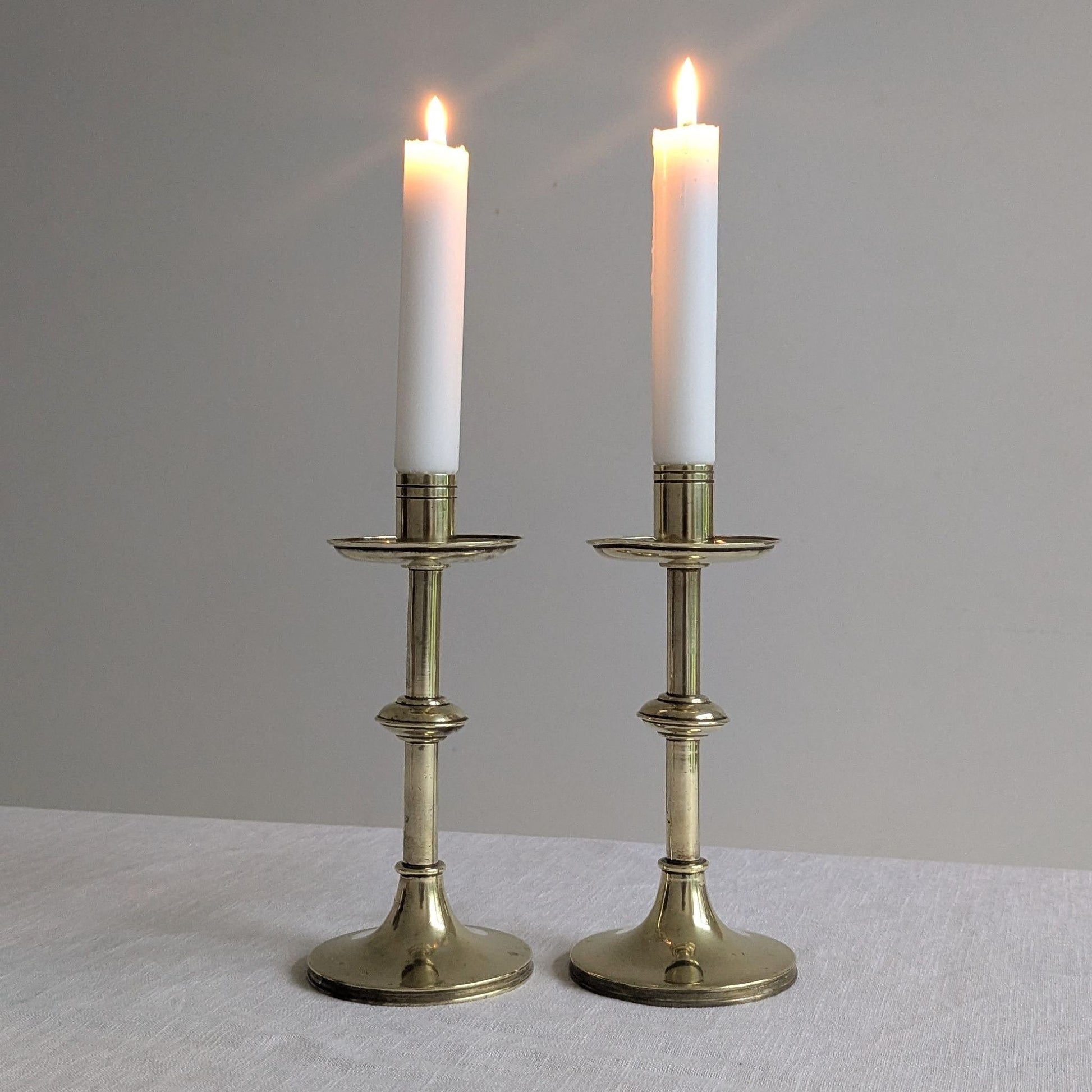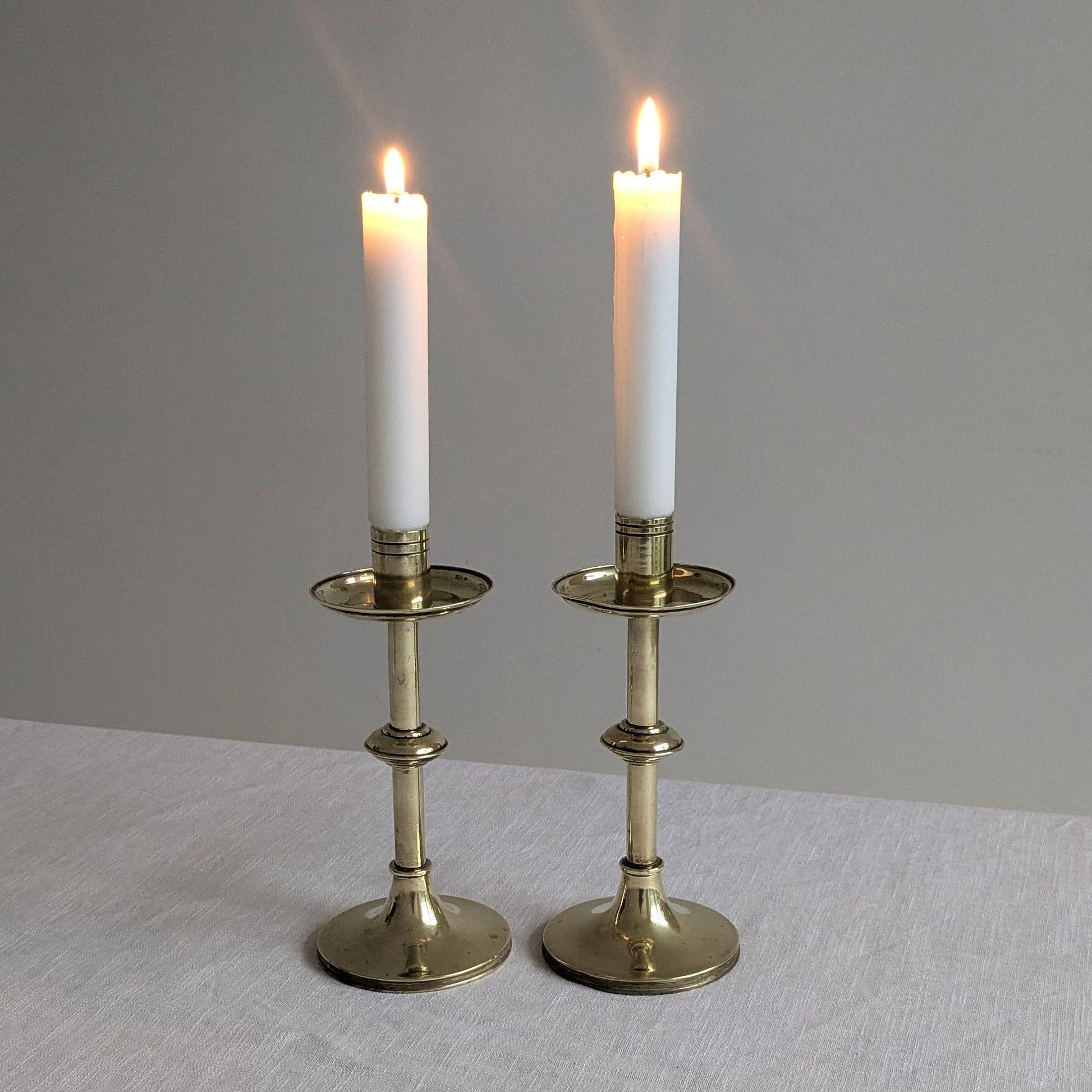 Very good antique condition with small scratches, knocks and imperfections to the bras. Warping due to knocks to both bases and the wax drip tray of one as photographed. Slightly different heights.
