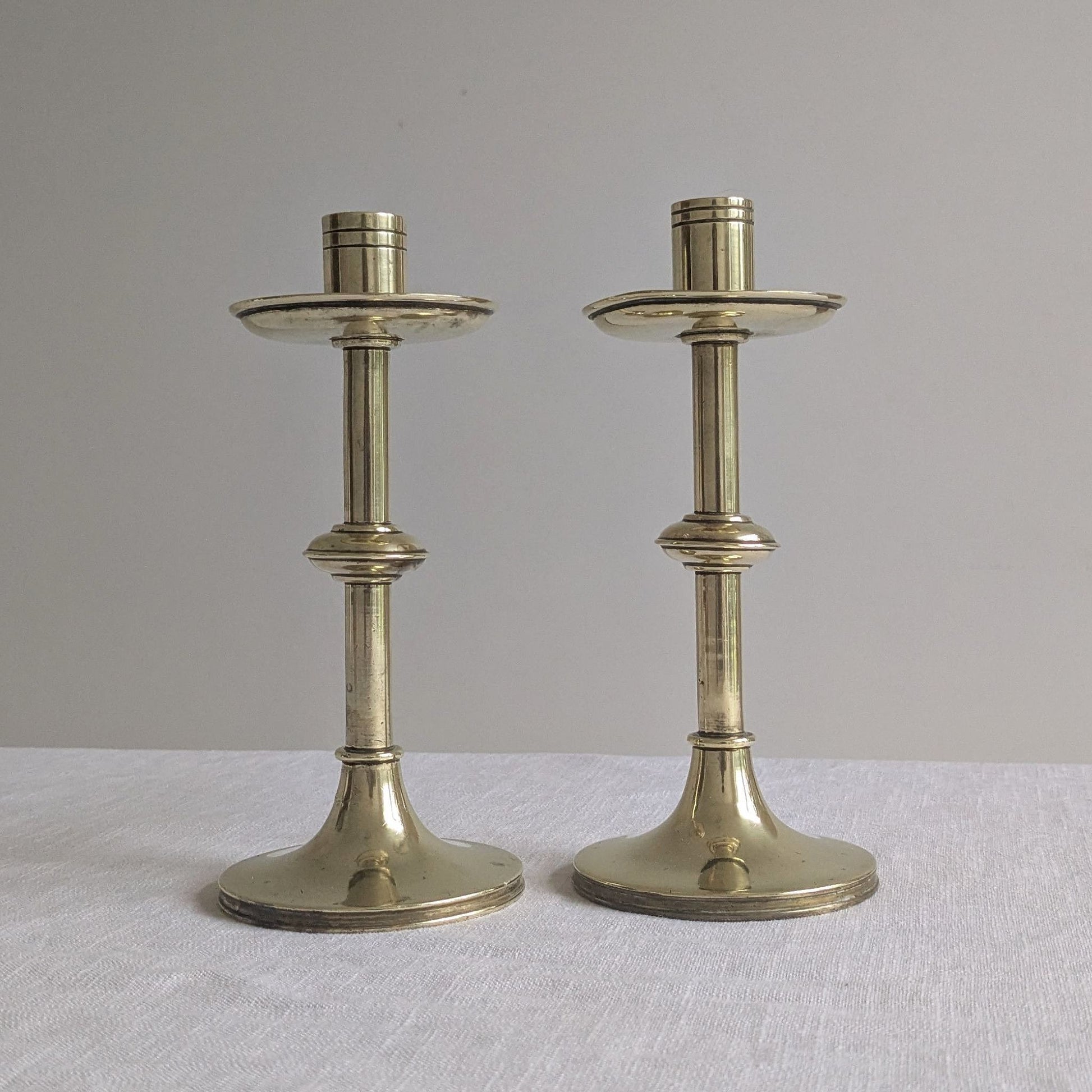 Beautiful pair of Arts & Crafts brass candlesticks with knopped stems and wide circular drip trays.