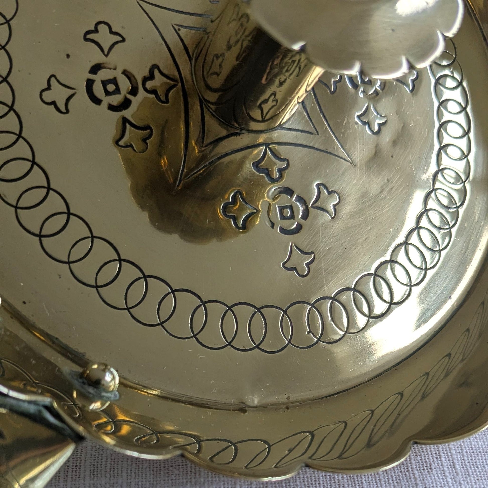 Aged antique condition with time-worn patina, scratches and marks. A little warping to the scallop trim around the candle opening.