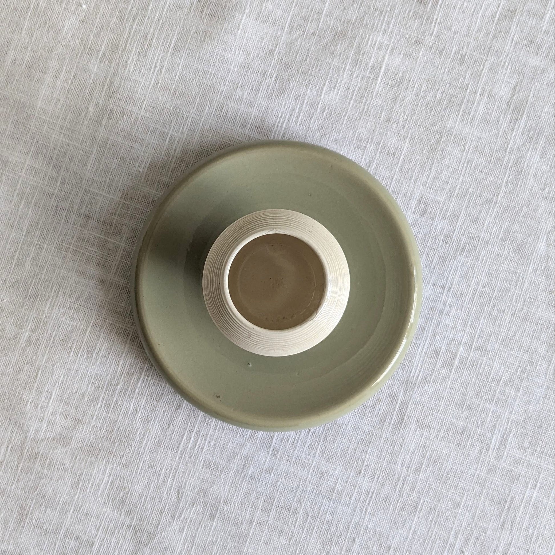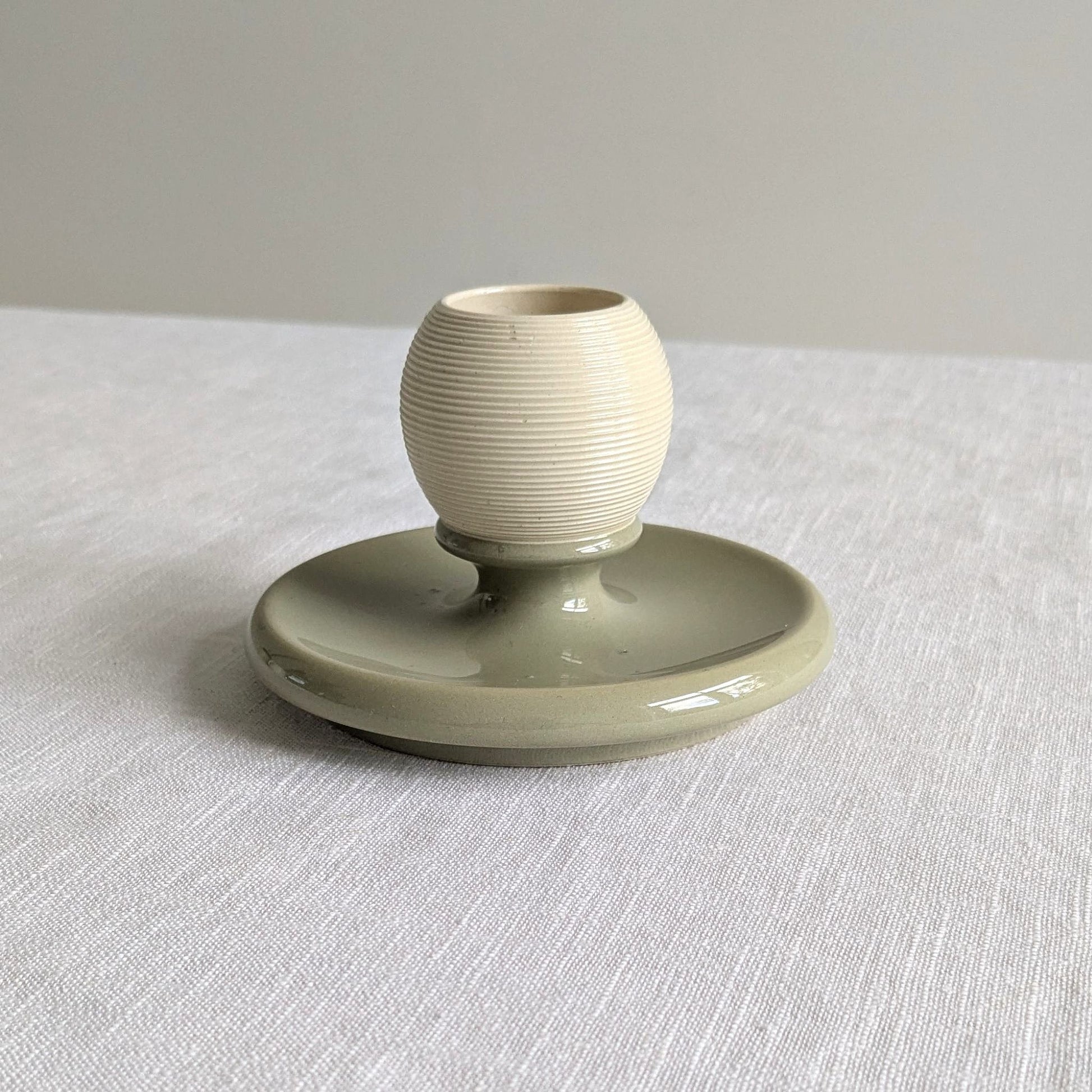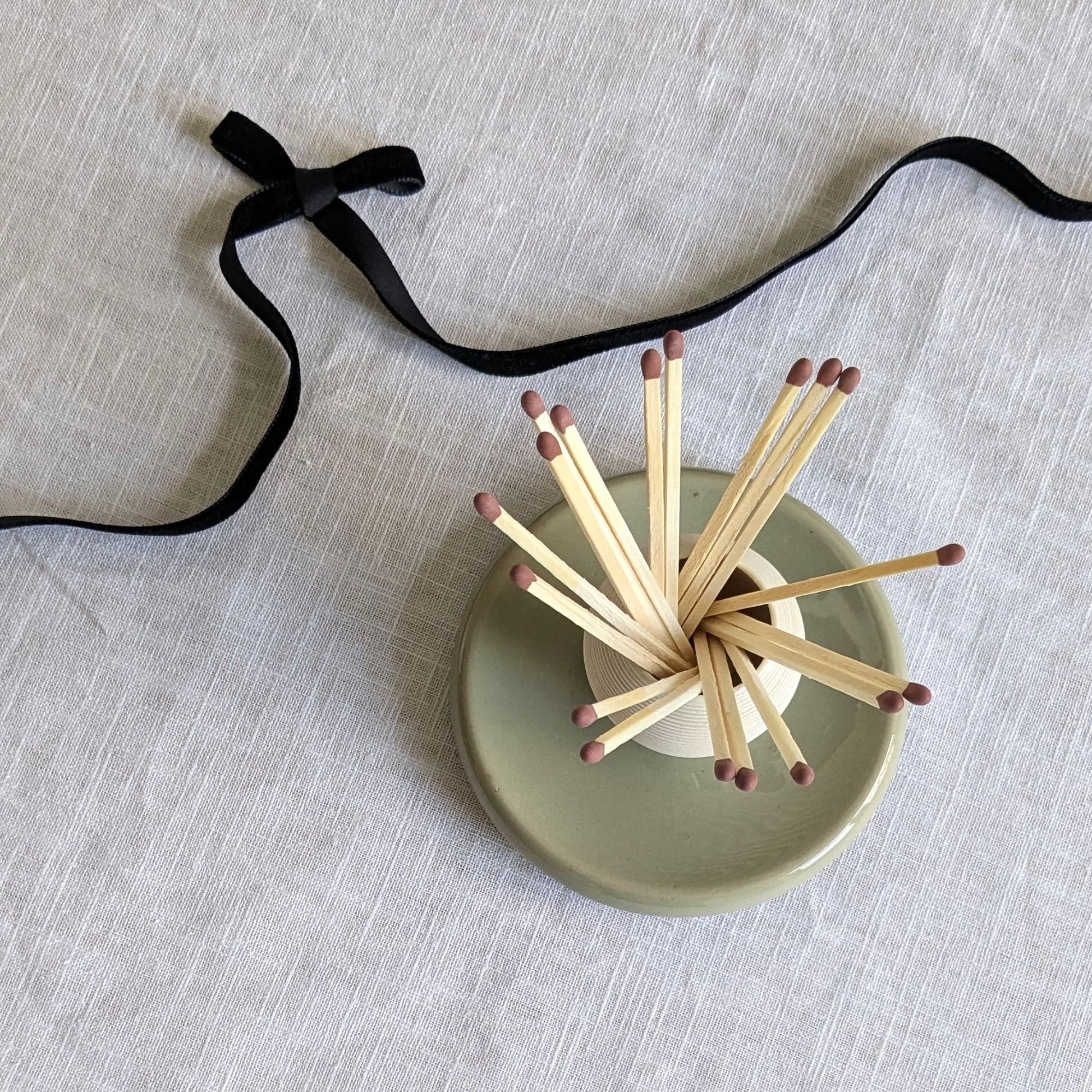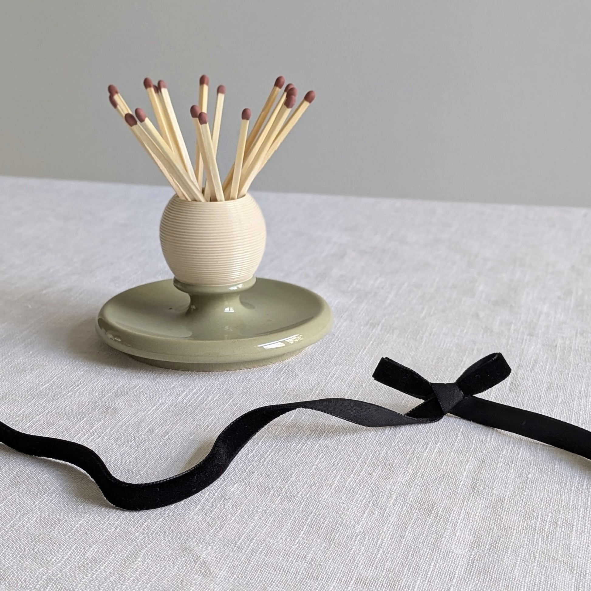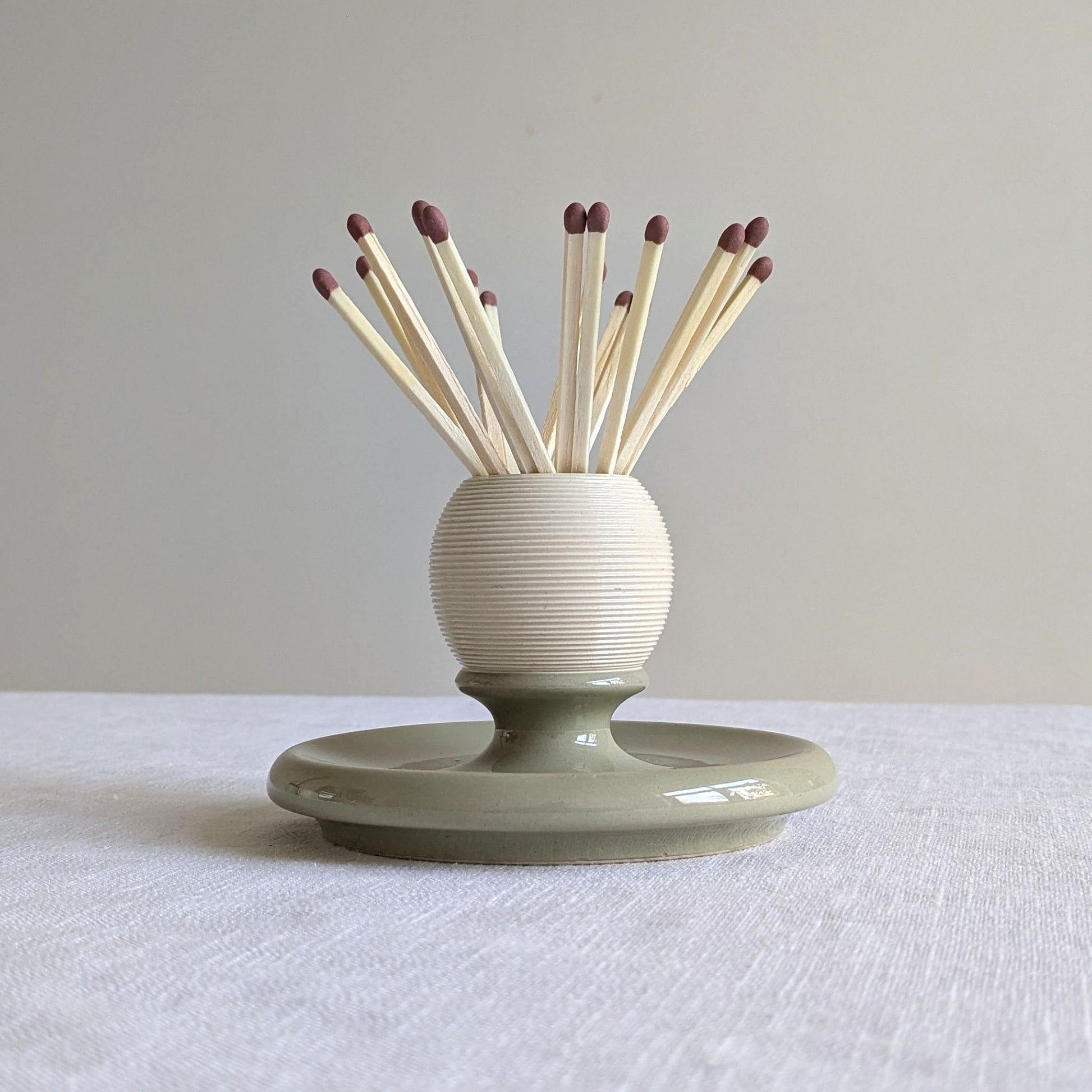 White ribbed striker with cavity to hold matches and a sage green base / dish for spent matches.