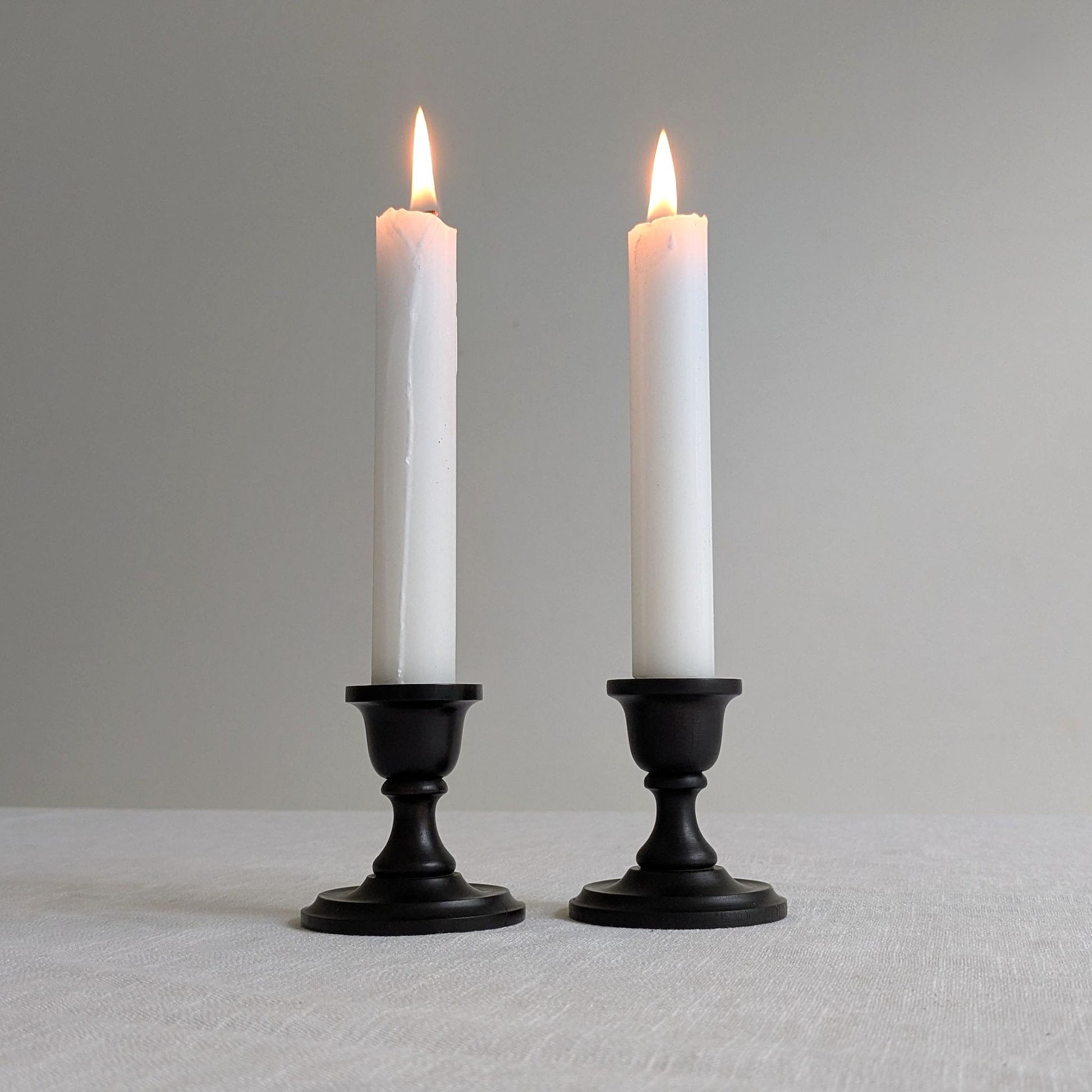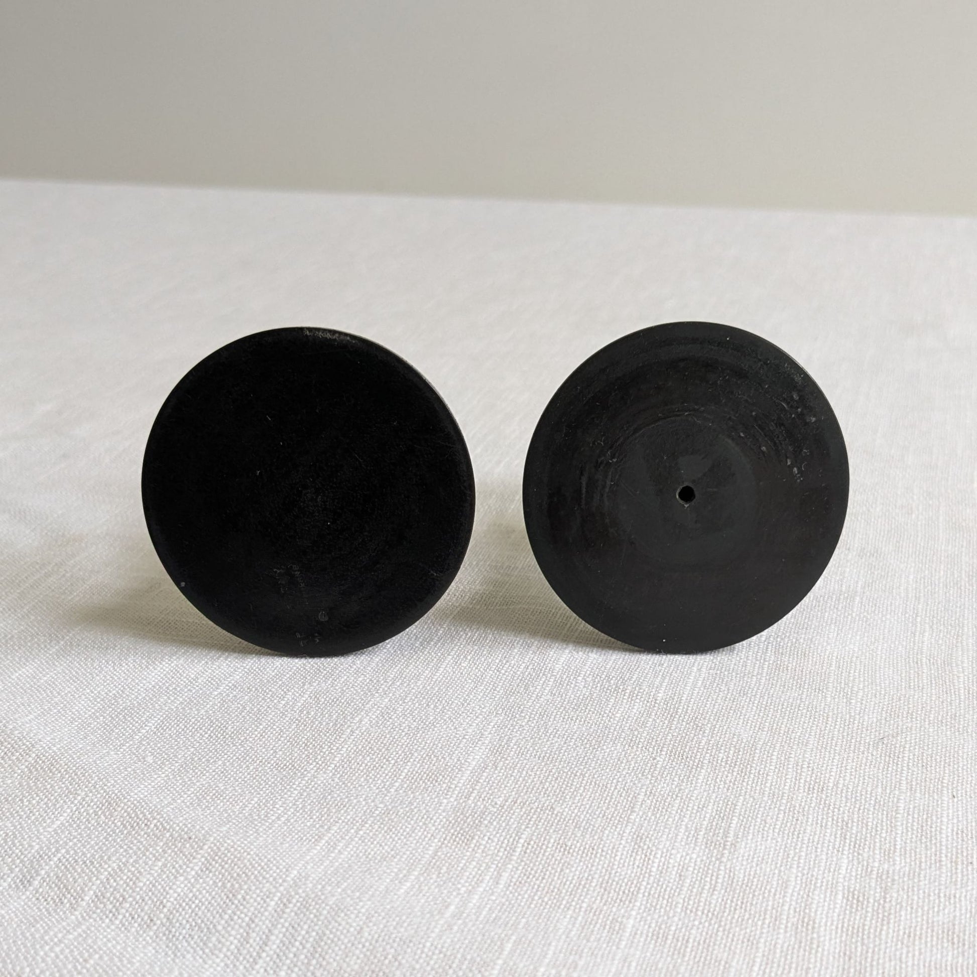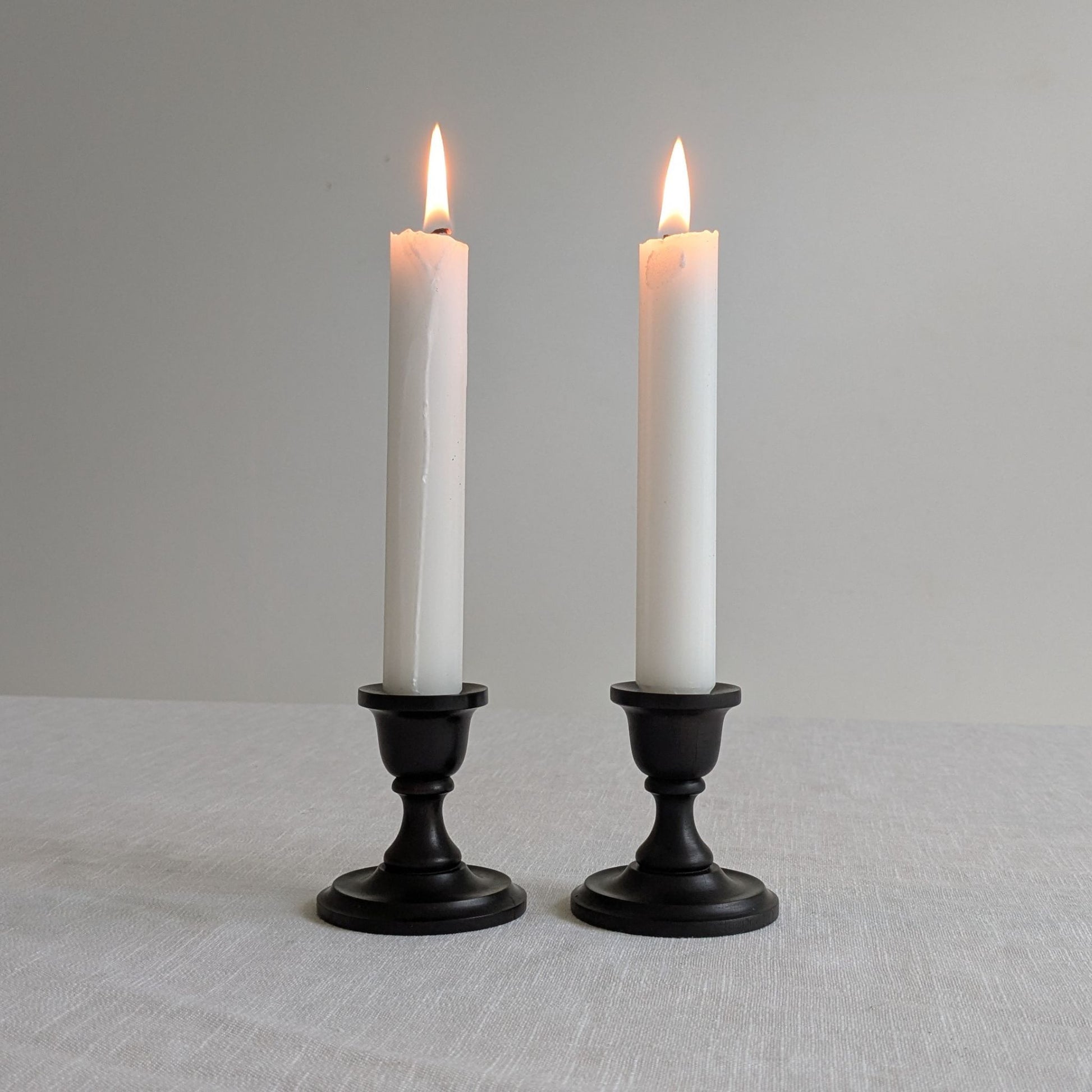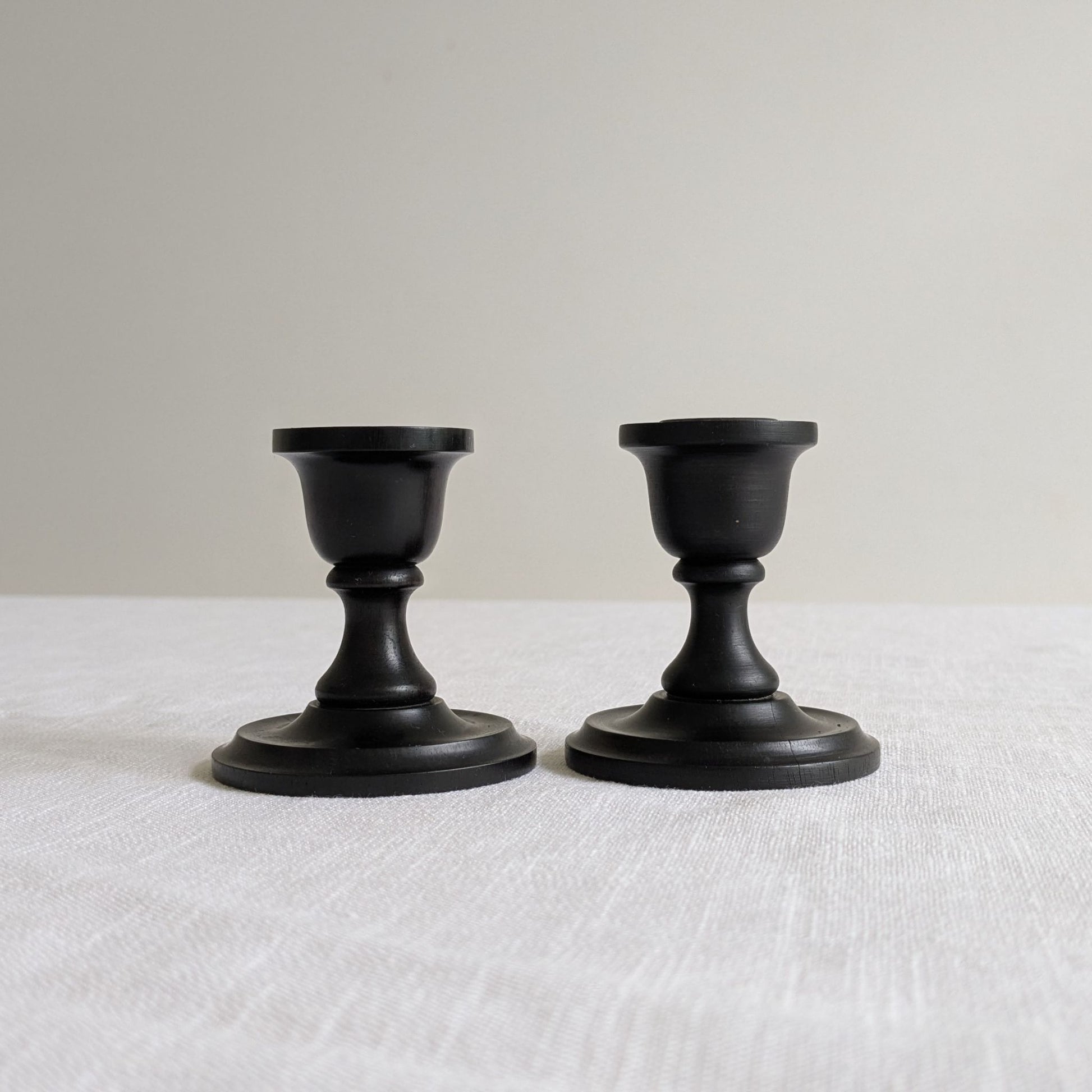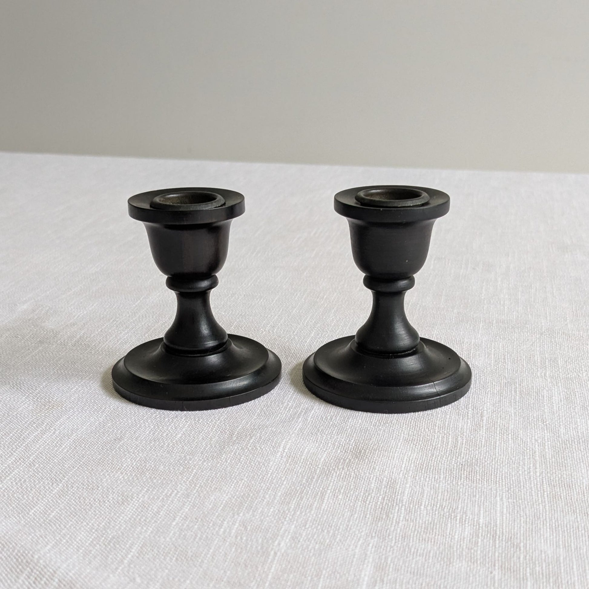 A beautiful pair of short candle holders in dark ebony wood with stepped bases delicate narrow stems. Likely date to the Edwardian era.
