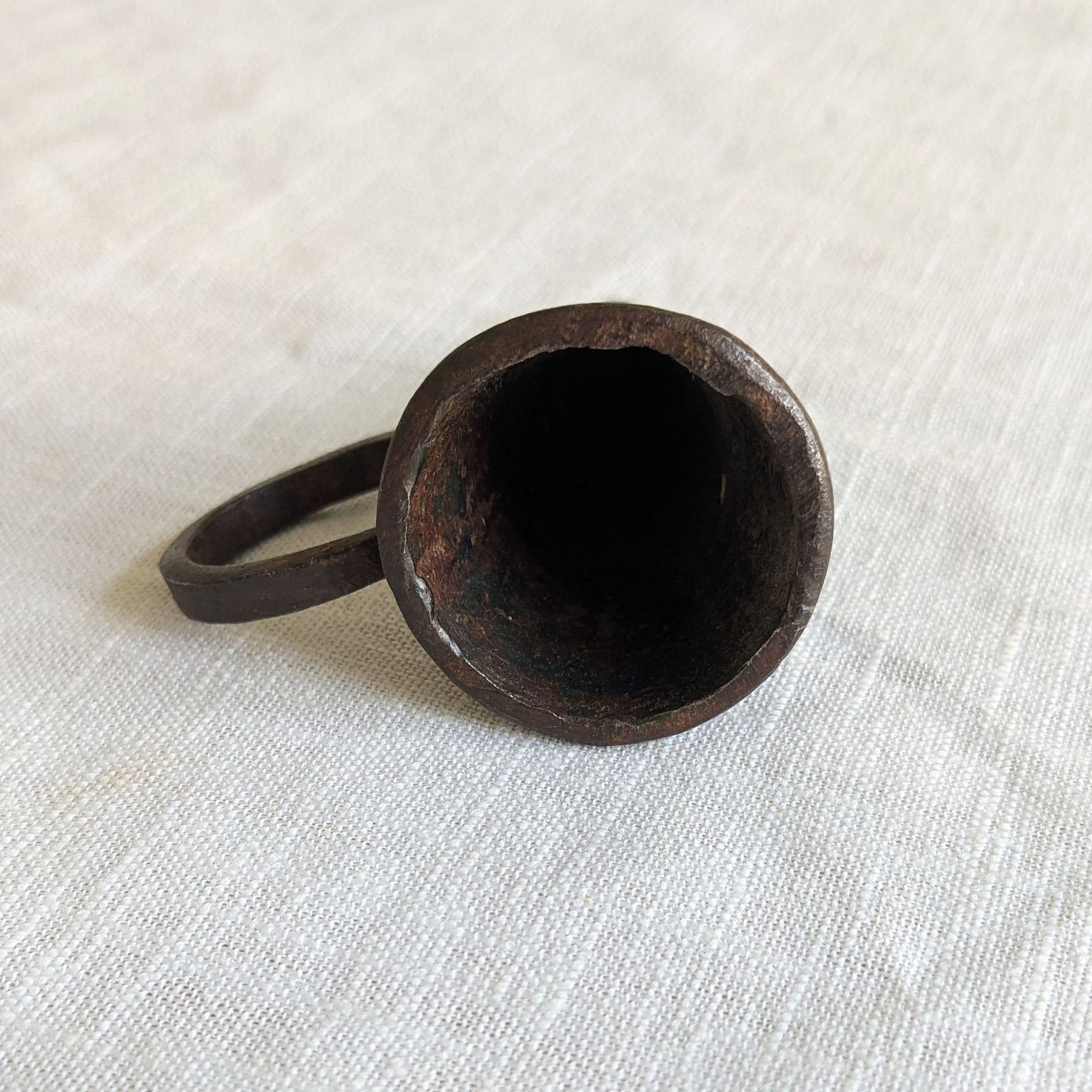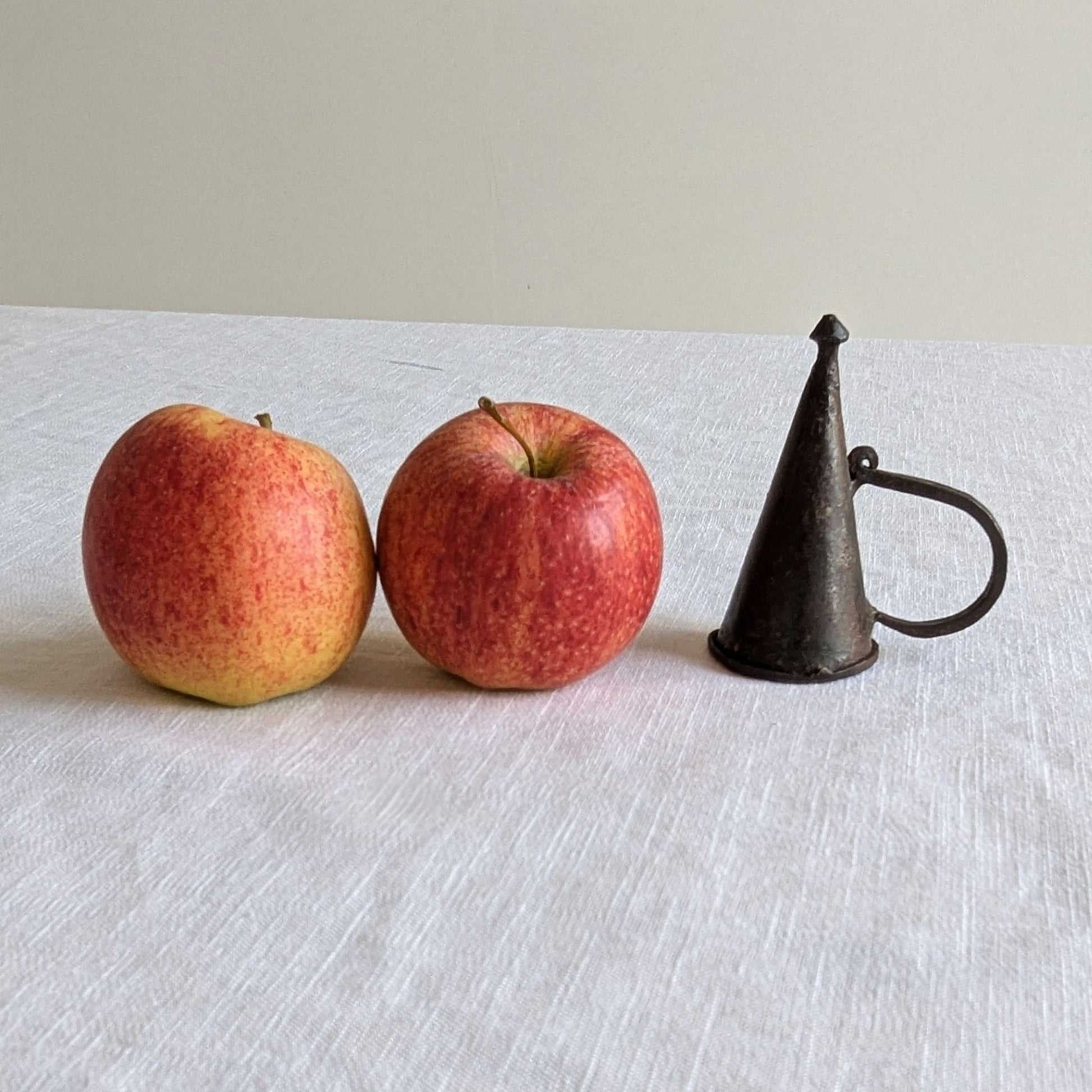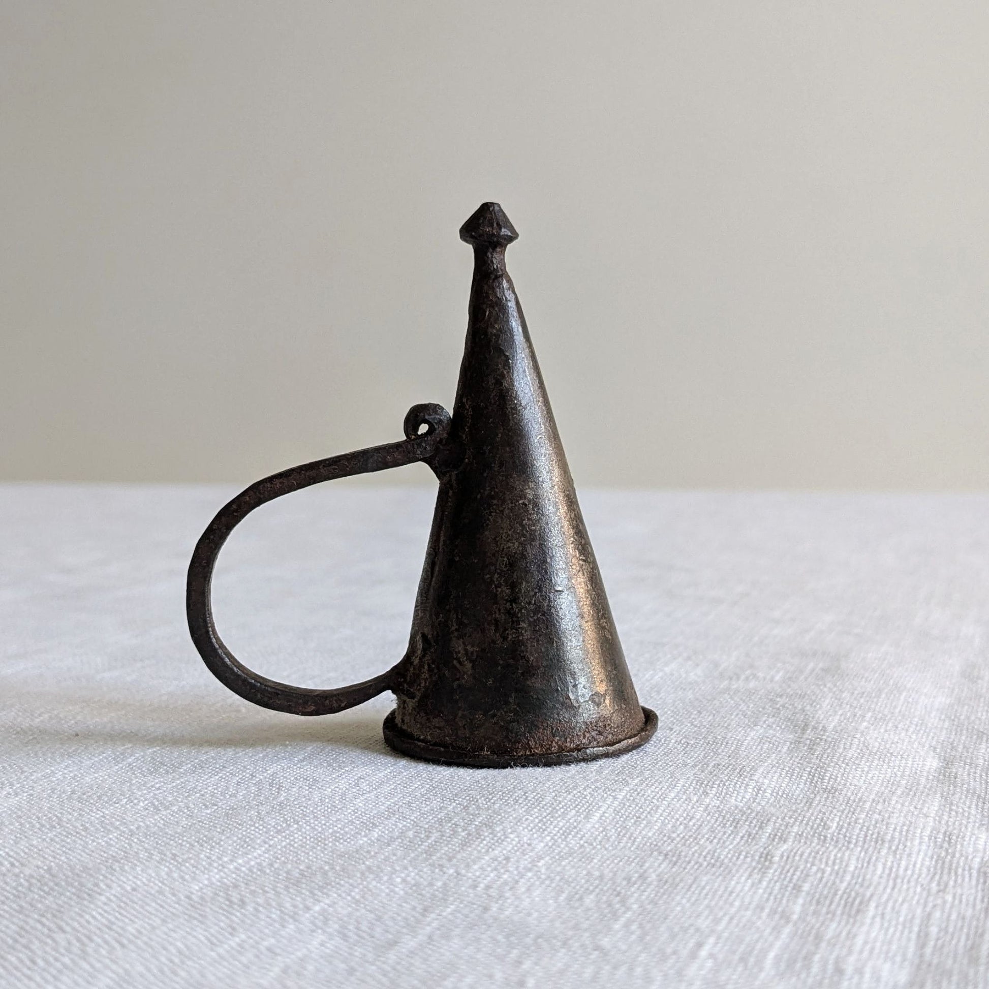 Hand-forged metal candle snuffer in a 'witch's hat' shape with finial to the point. Large arching handle with a lovely looped detail to the top.