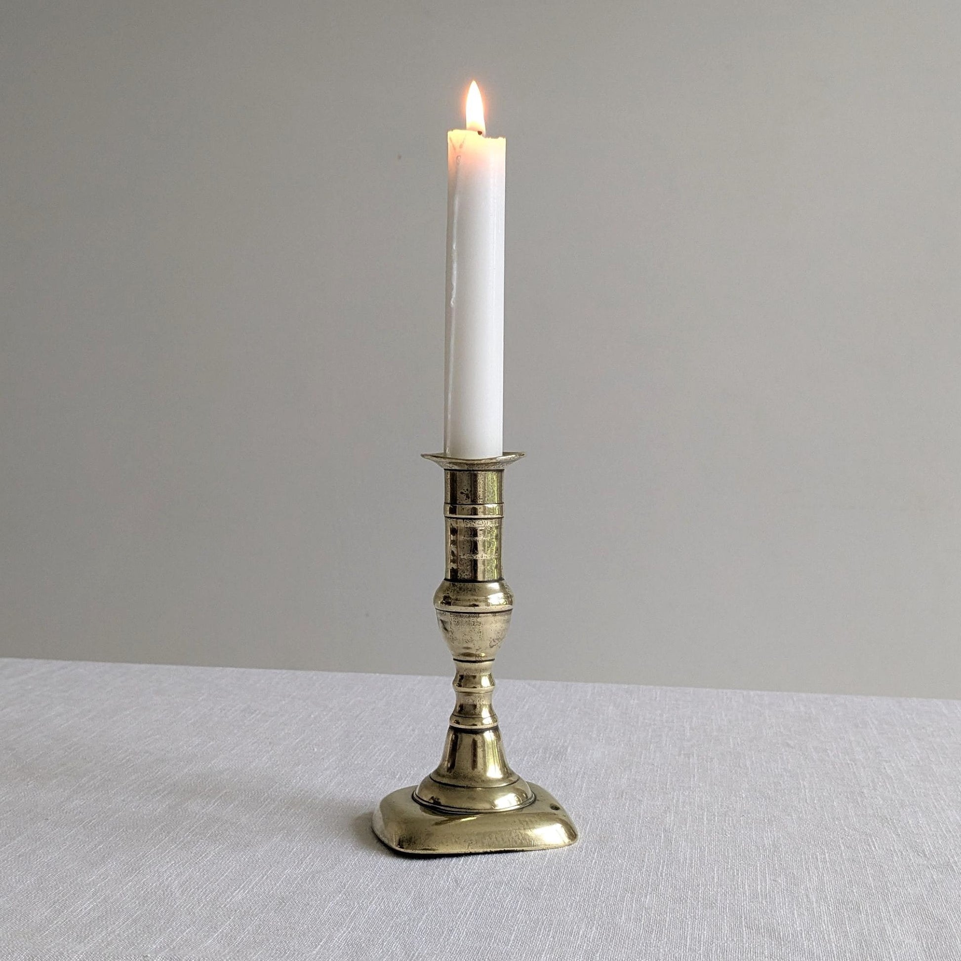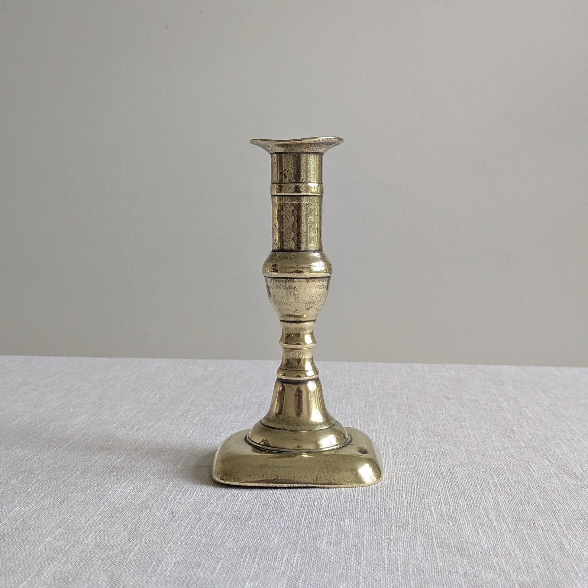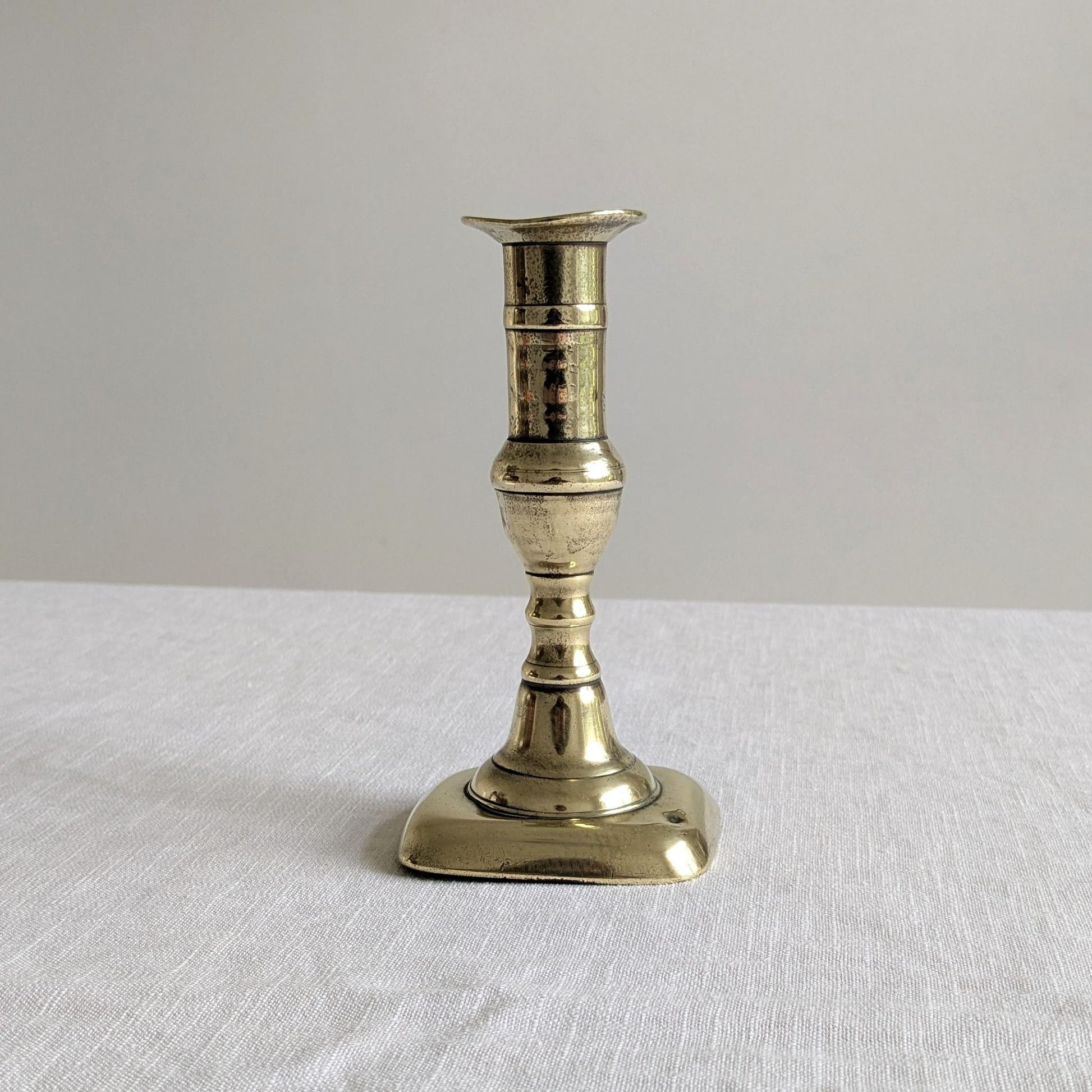 Formed in hollow brass with a candle ejector that is currently frozen (likely stuck due to wax accumulation inside the candlestick).