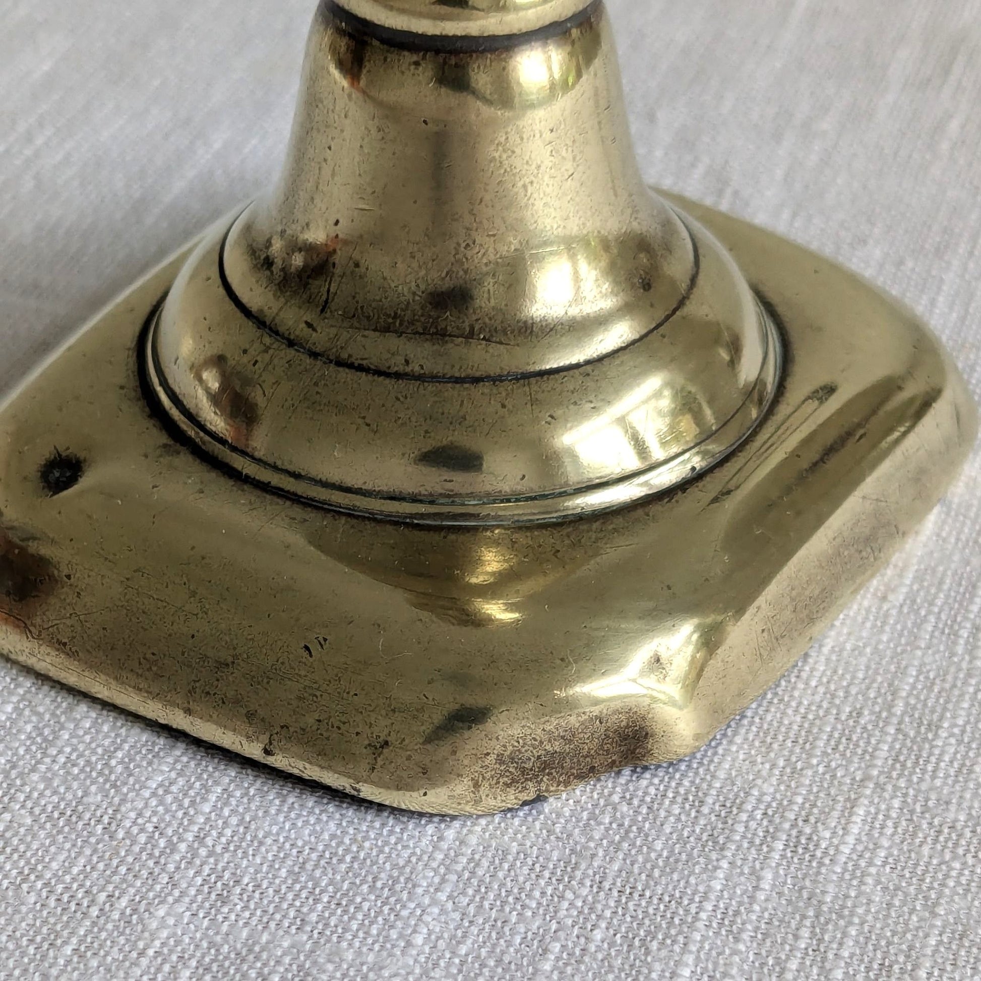 Aged, time-worn and wobbly brass candlestick with a low platform base, ball detail stem and flared opening.