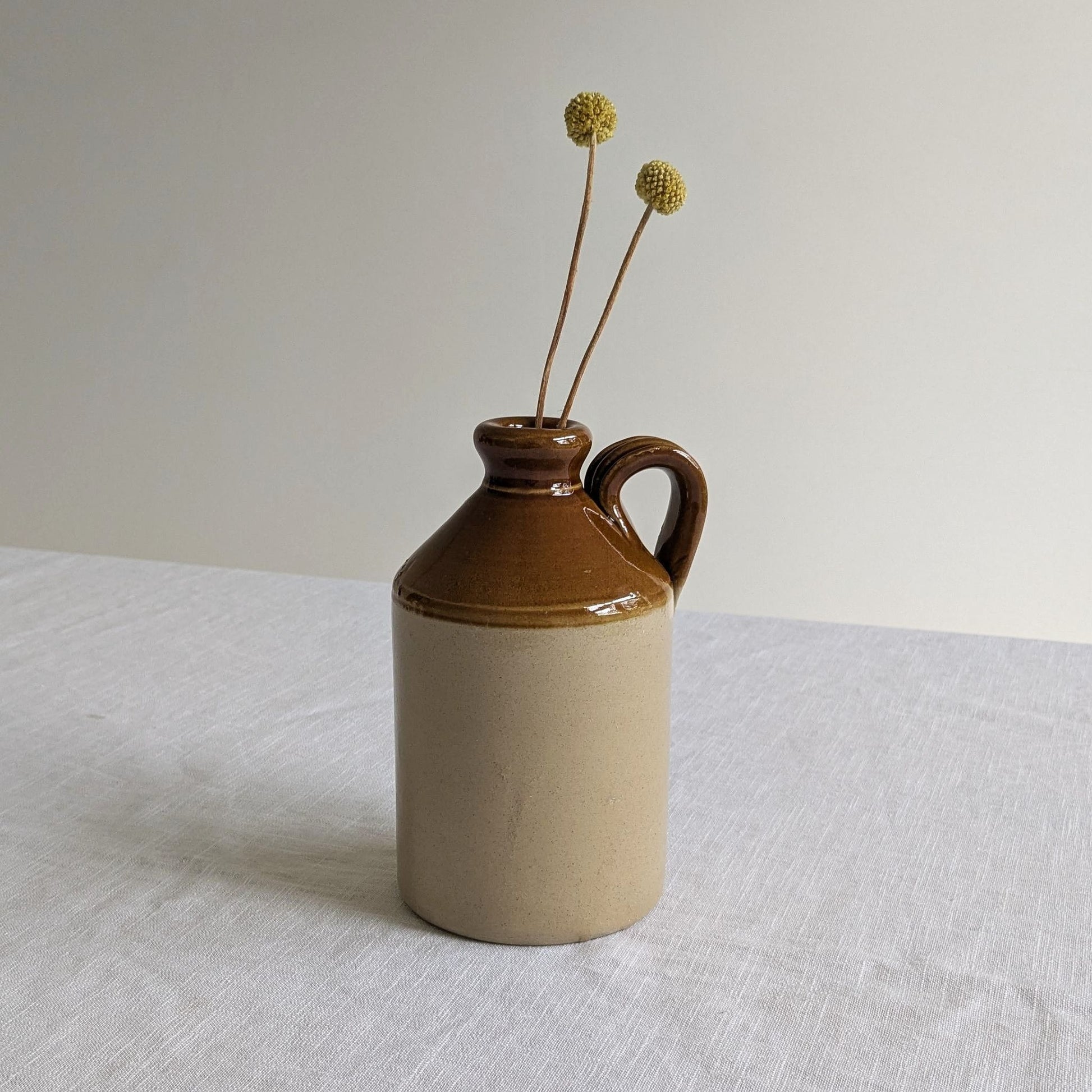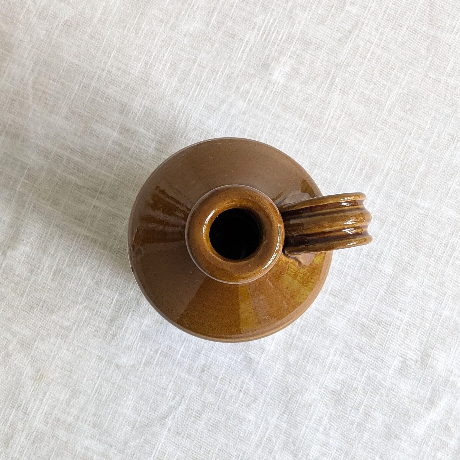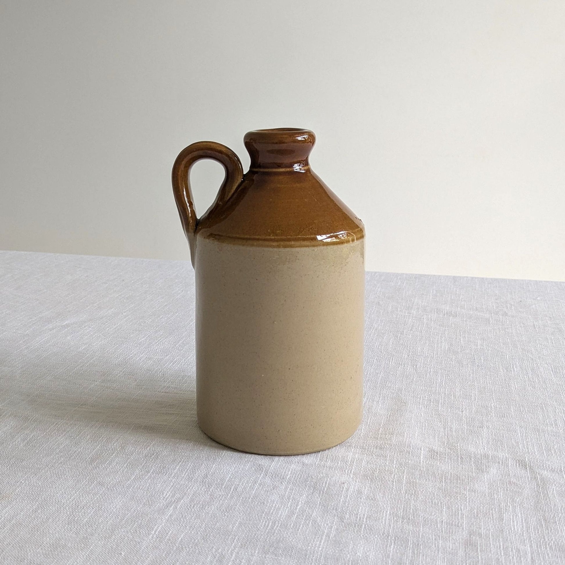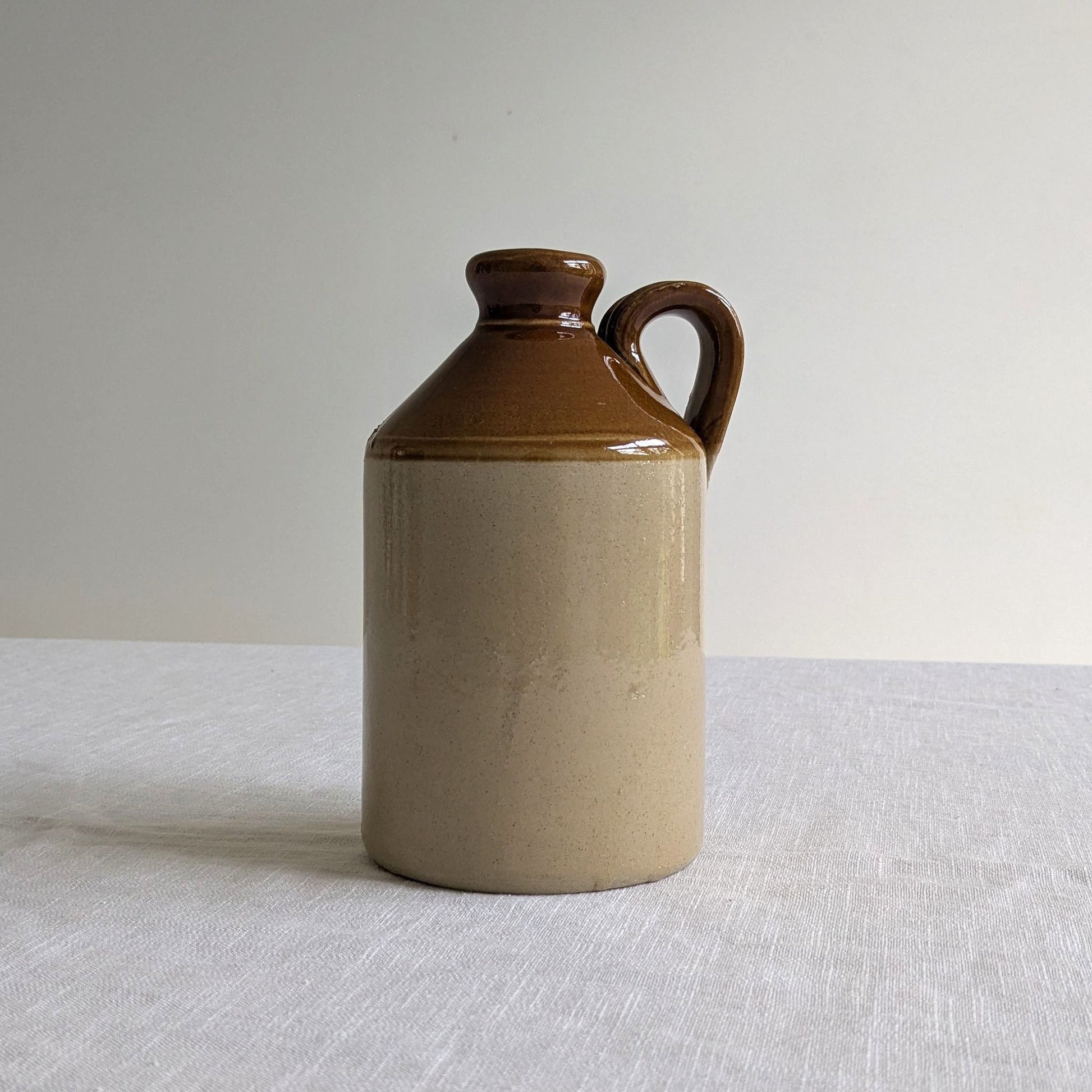 Glossy glaze with a brown neck, small ridged handle and a beige coloured body.