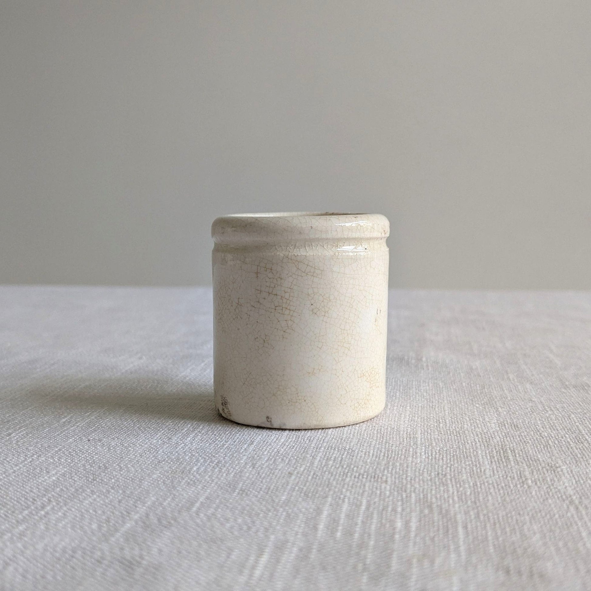 Small antique stoneware pot with lovely and characterful grey crazing to the glaze. Ideal size to store long matches or to use as a tiny vase.