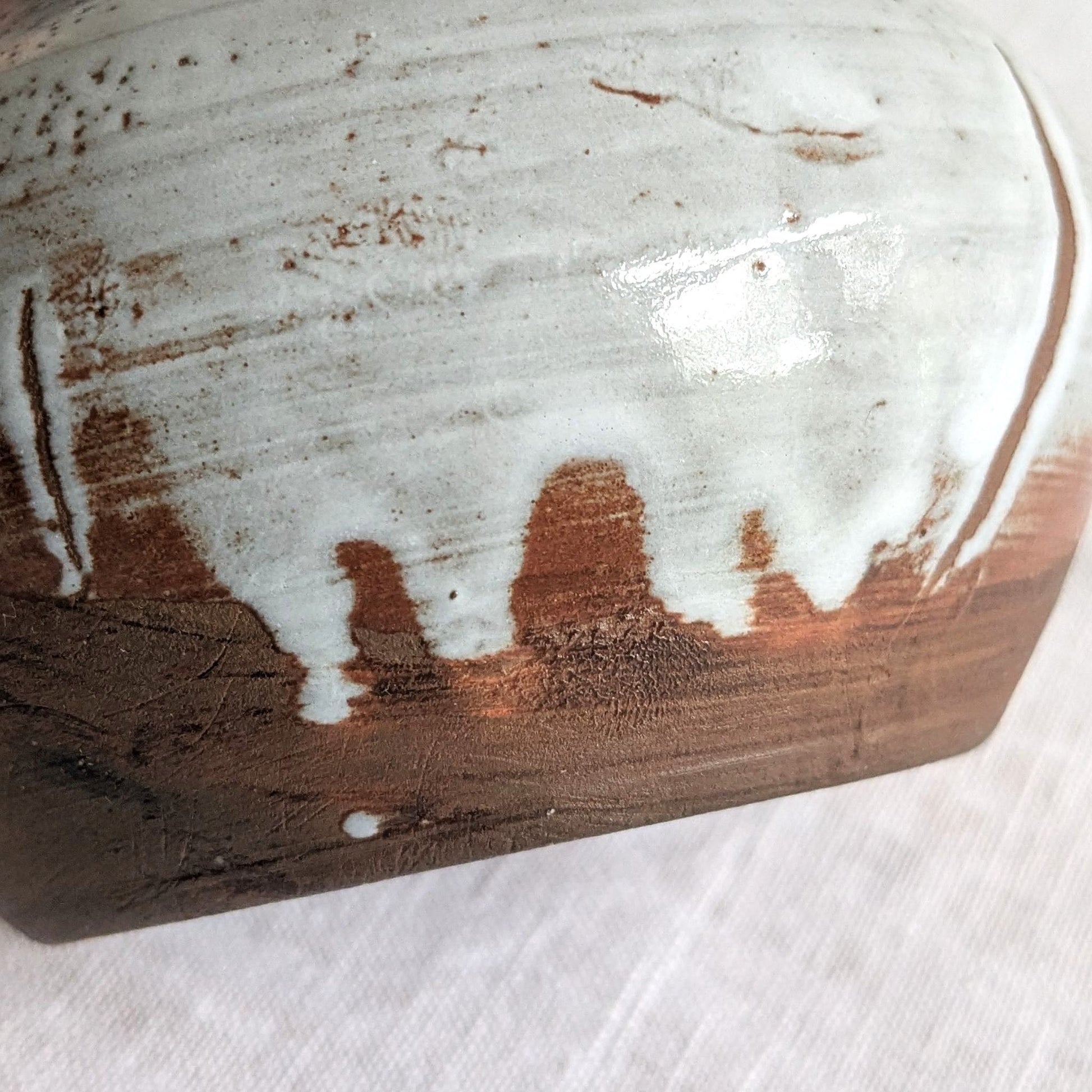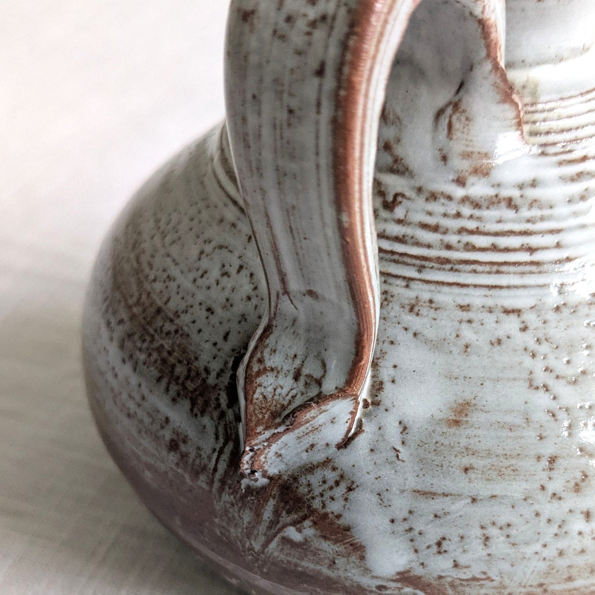 Mid century hand-formed pitcher in rich brown clay with a roughly applied and dribbled milk-grey glaze.