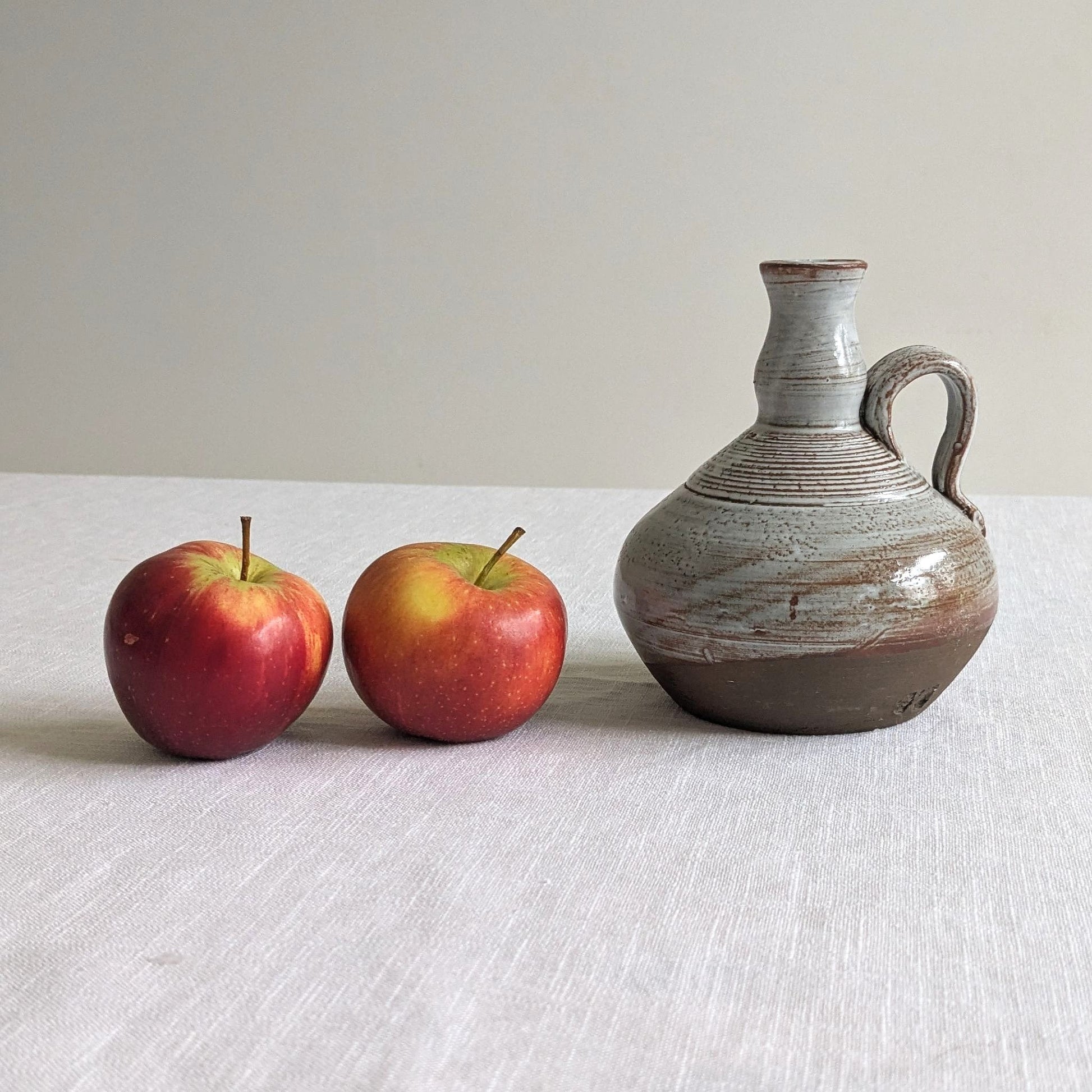 Small piece with ribbed detail around the base of a tall neck and a simple arched handle.