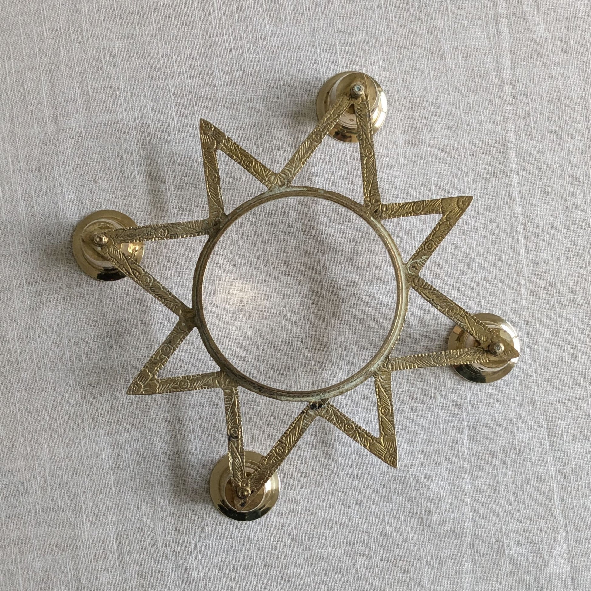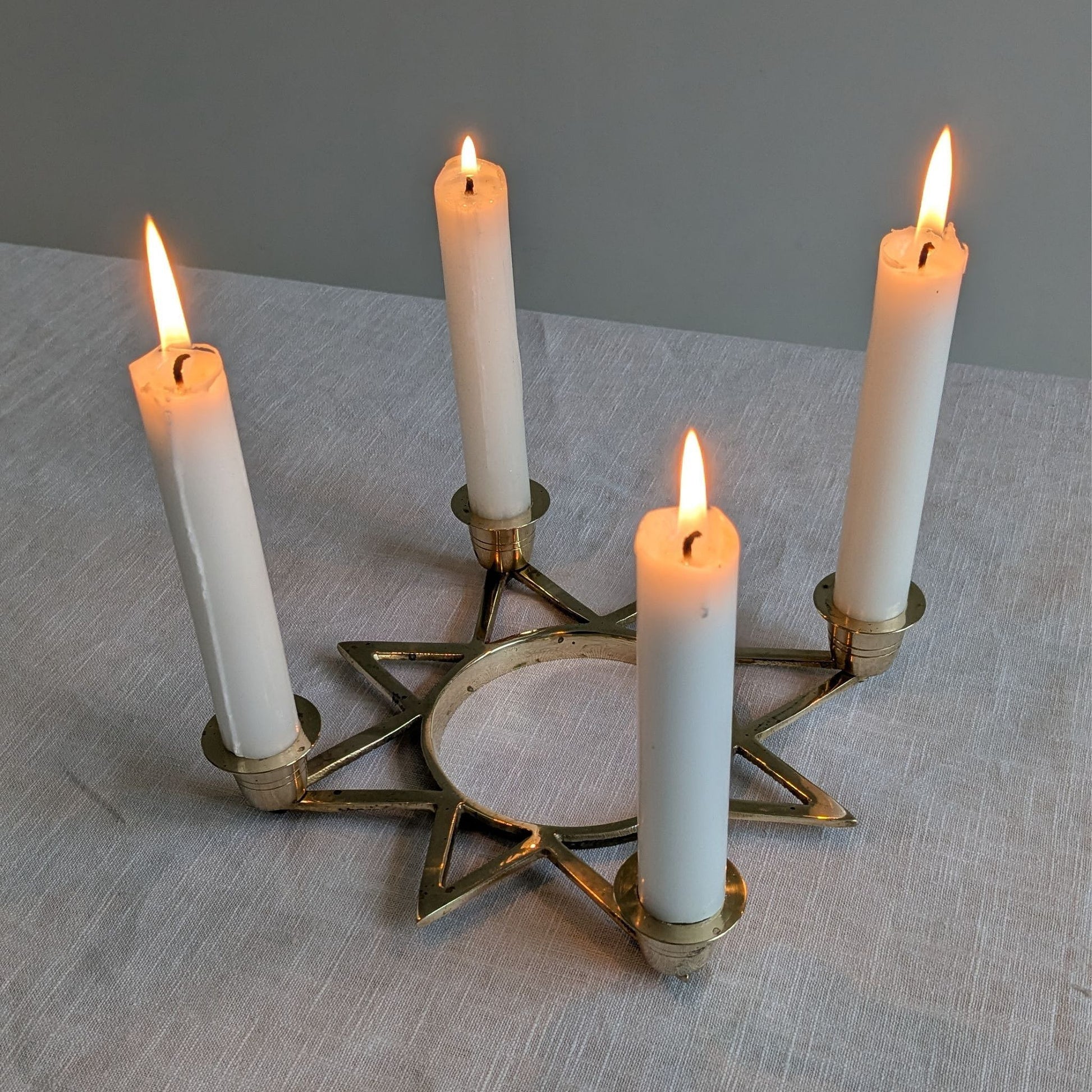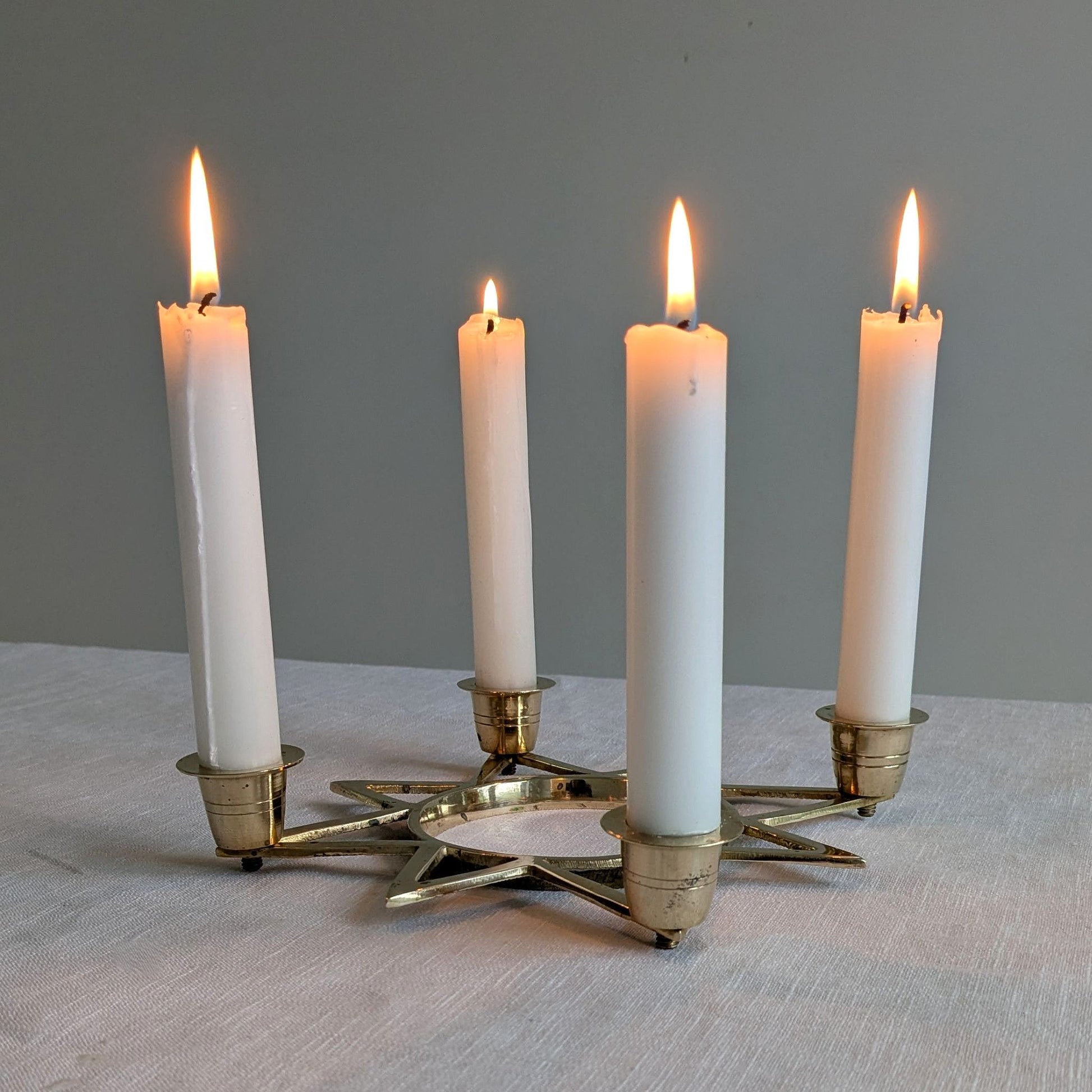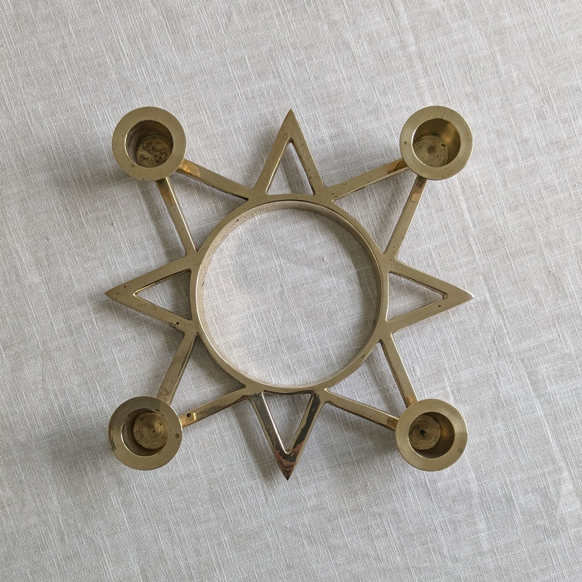 Beautiful vintage brass candle holder in the shape of an eight pointed star which holds four taper candles.