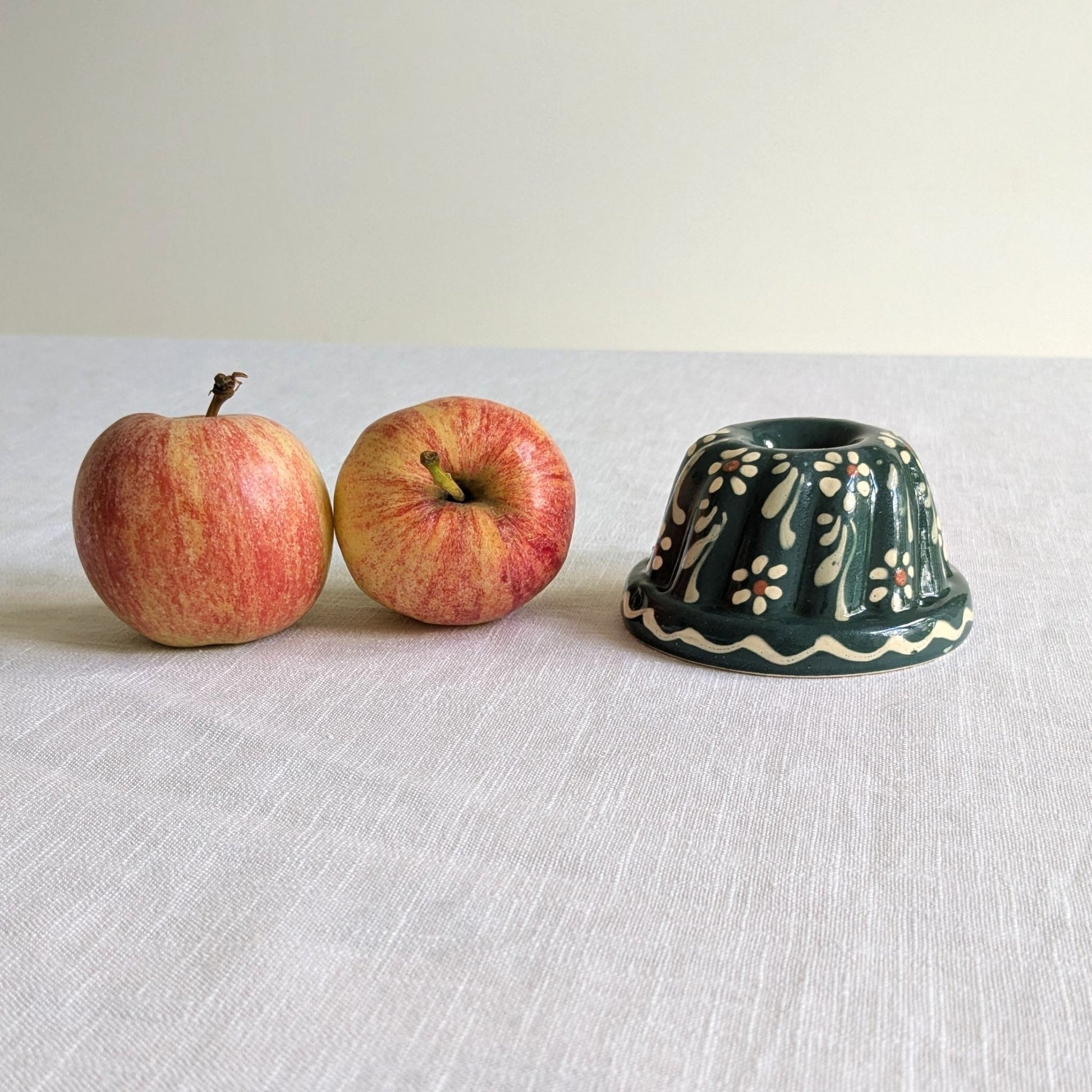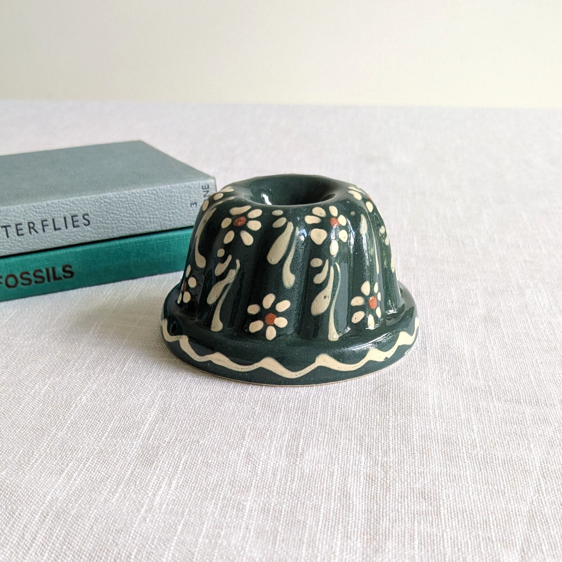 Adorable little French cake mould in dark turquoise-green with a hand painted design of flowers and leaves with decorative borders.