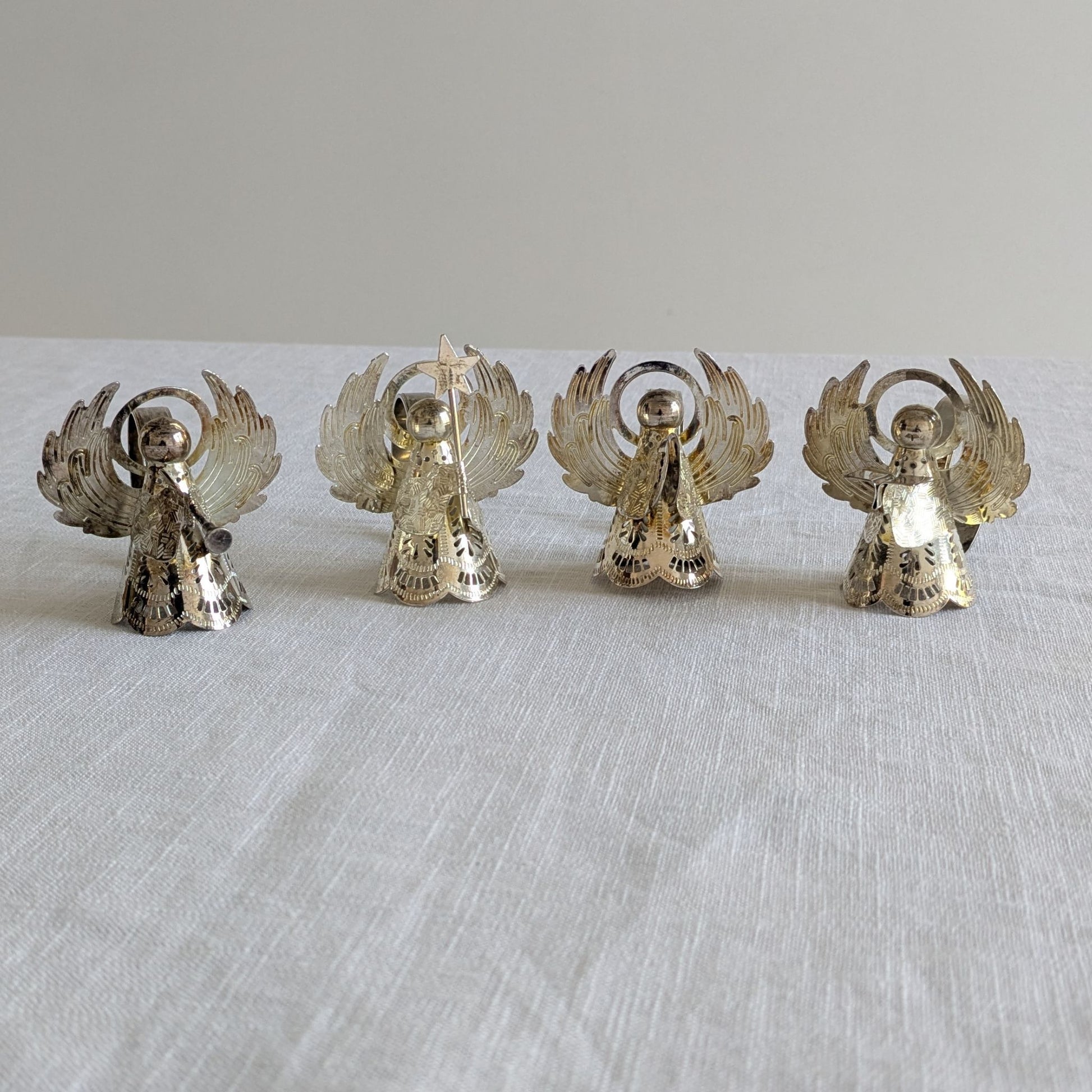 A set of four pretty festive napkin rings in the shape of angels formed in brass and silver plated. They each carry a different item - a star, a hymn book, cymbals and a horn.