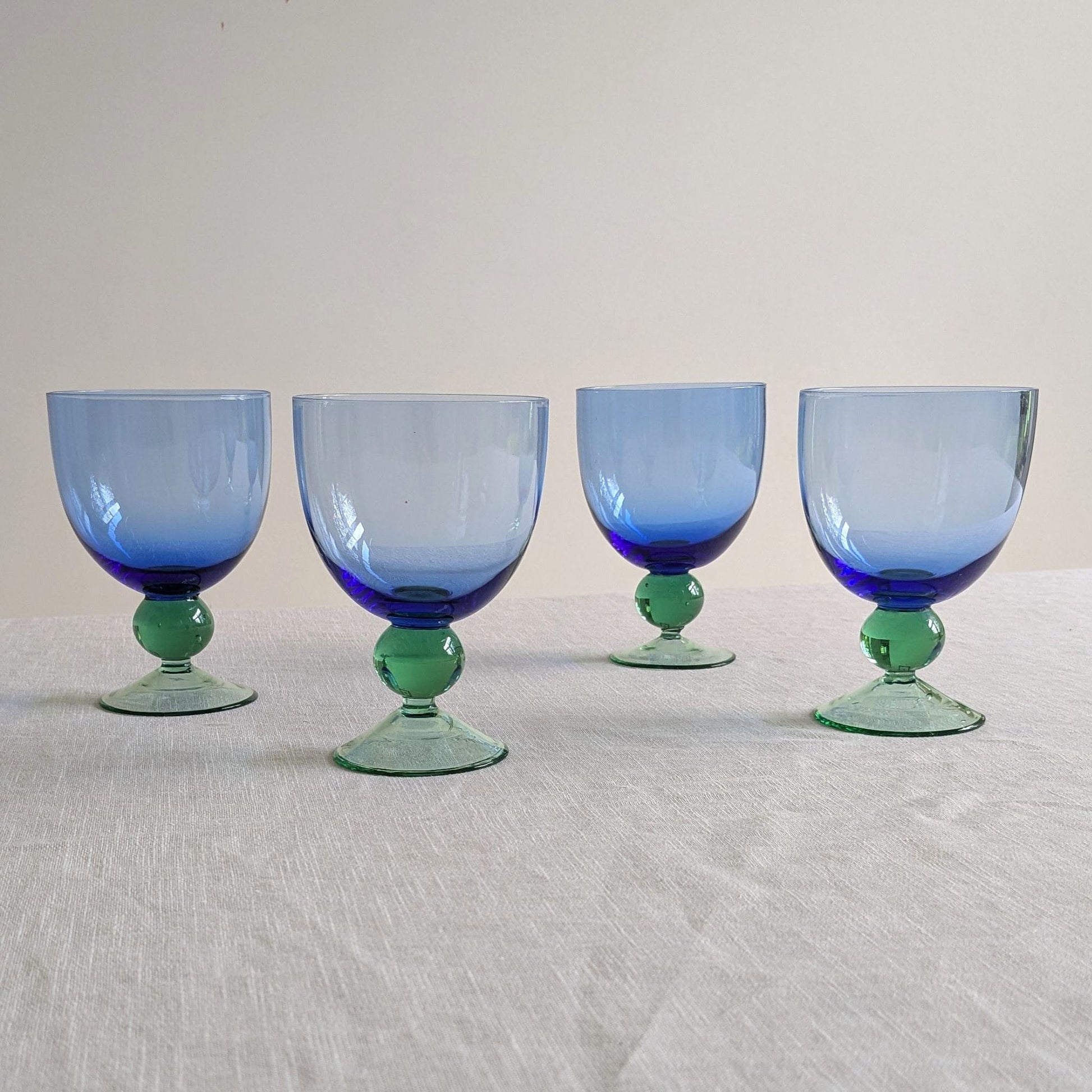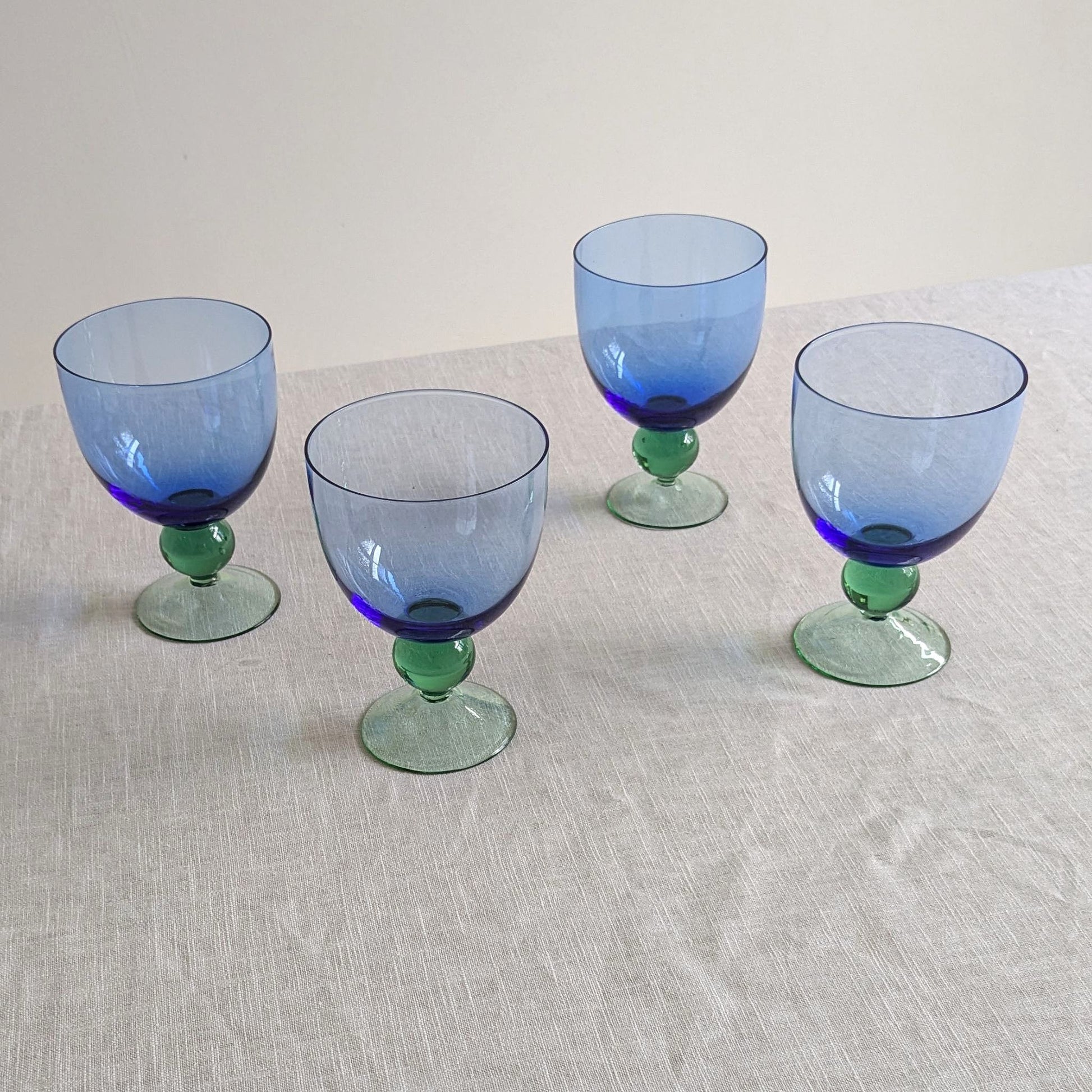 Set of four vintage cobalt blue wine or water glasses with green ball-shaped stems and domed bases.