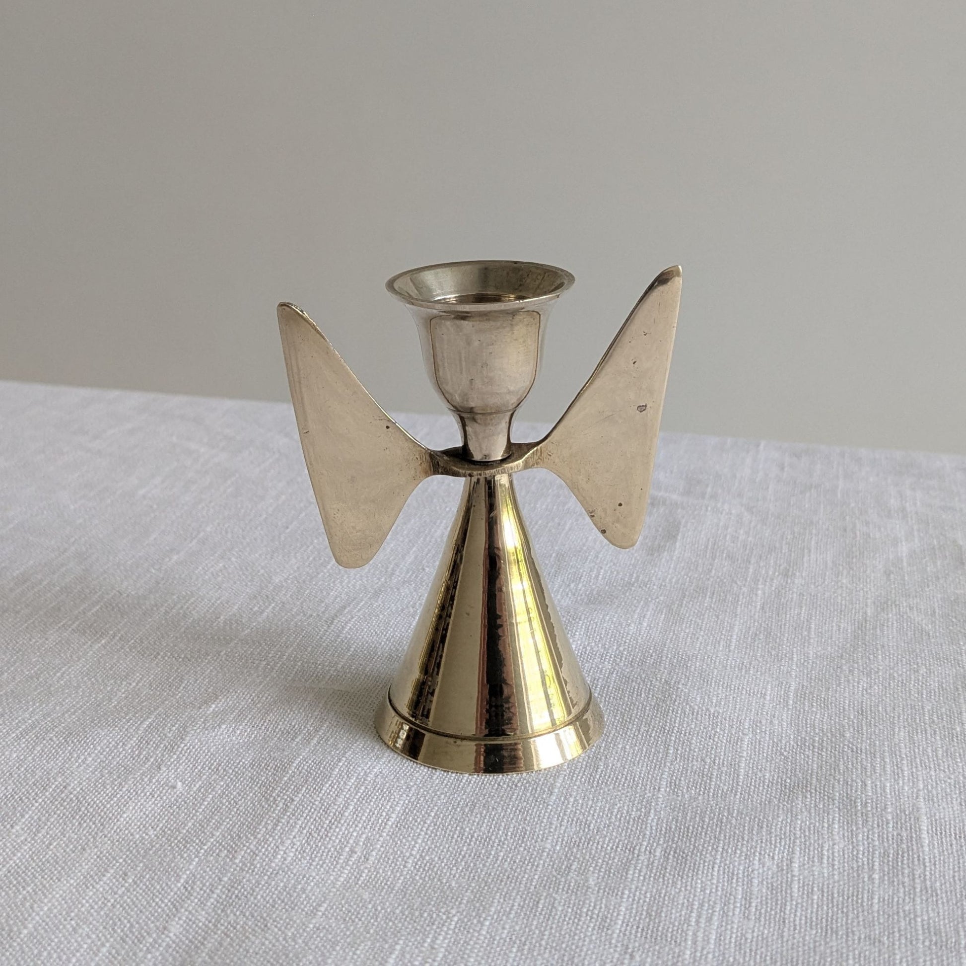 Festive golden brass candle holder in the shape of an angel with shaped brass wings and combined candle snuffer.