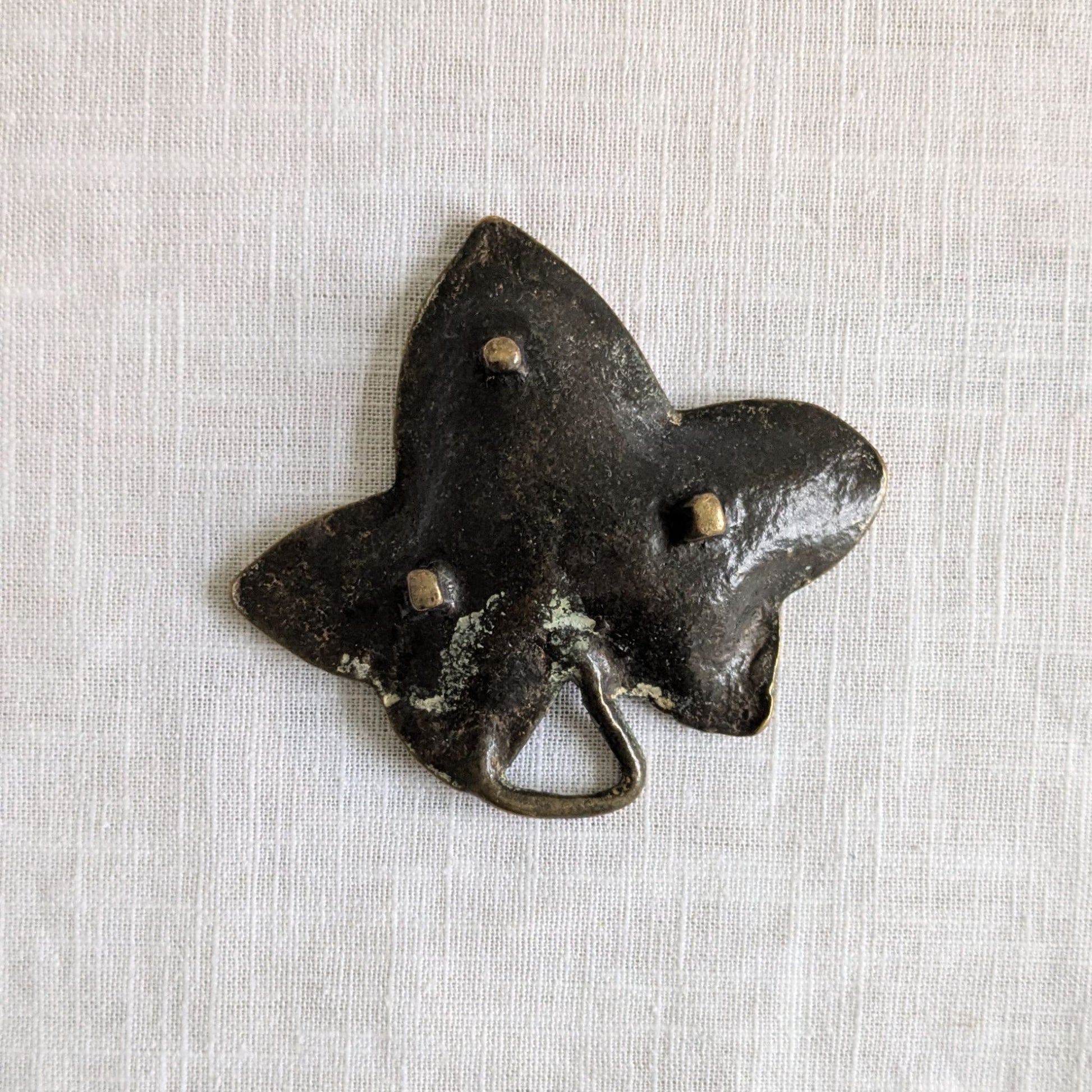Pretty vintage brass pin dish in the shape of an ivy leaf with vein details and a curling stem. Dates to the c1960s and stands on three tiny feet.
