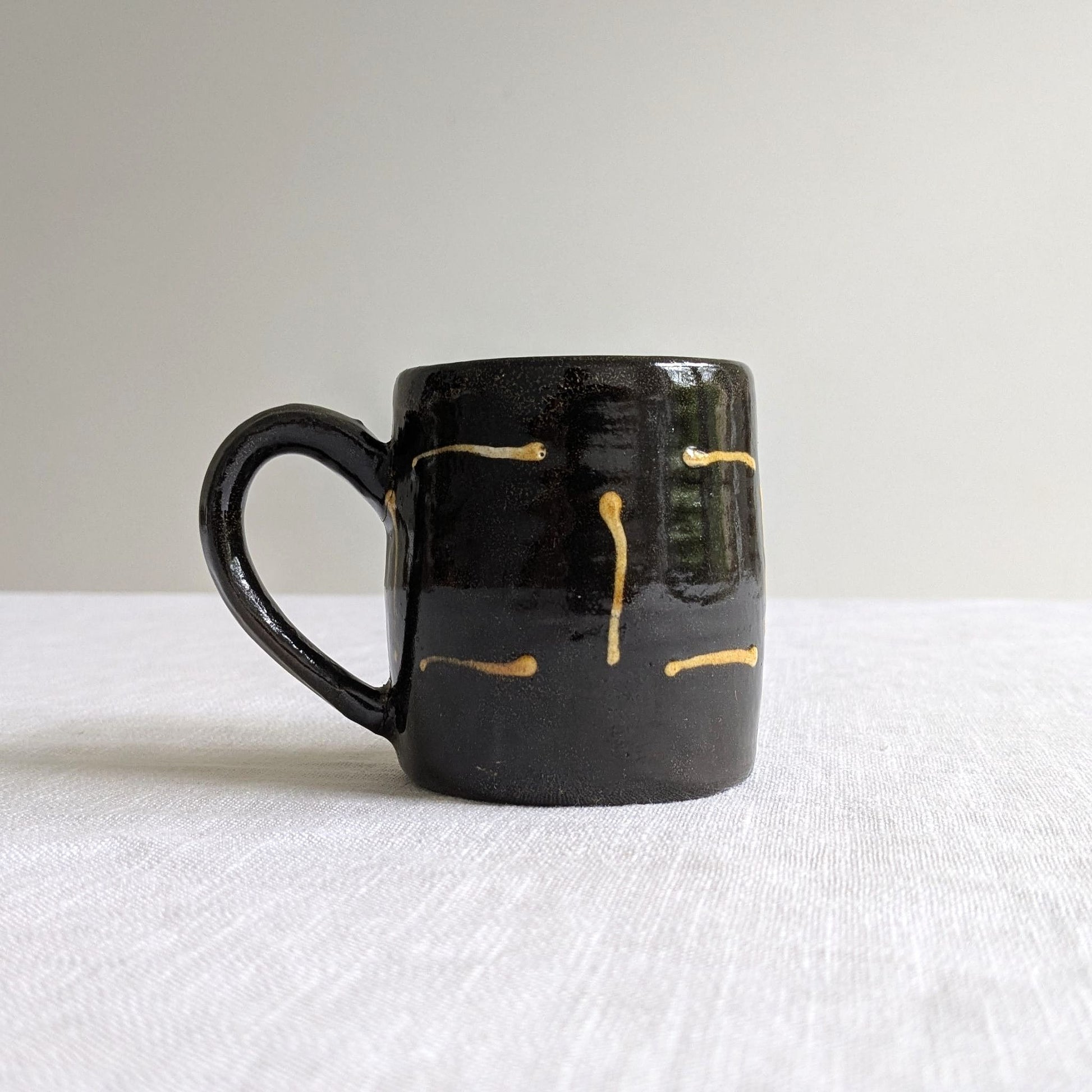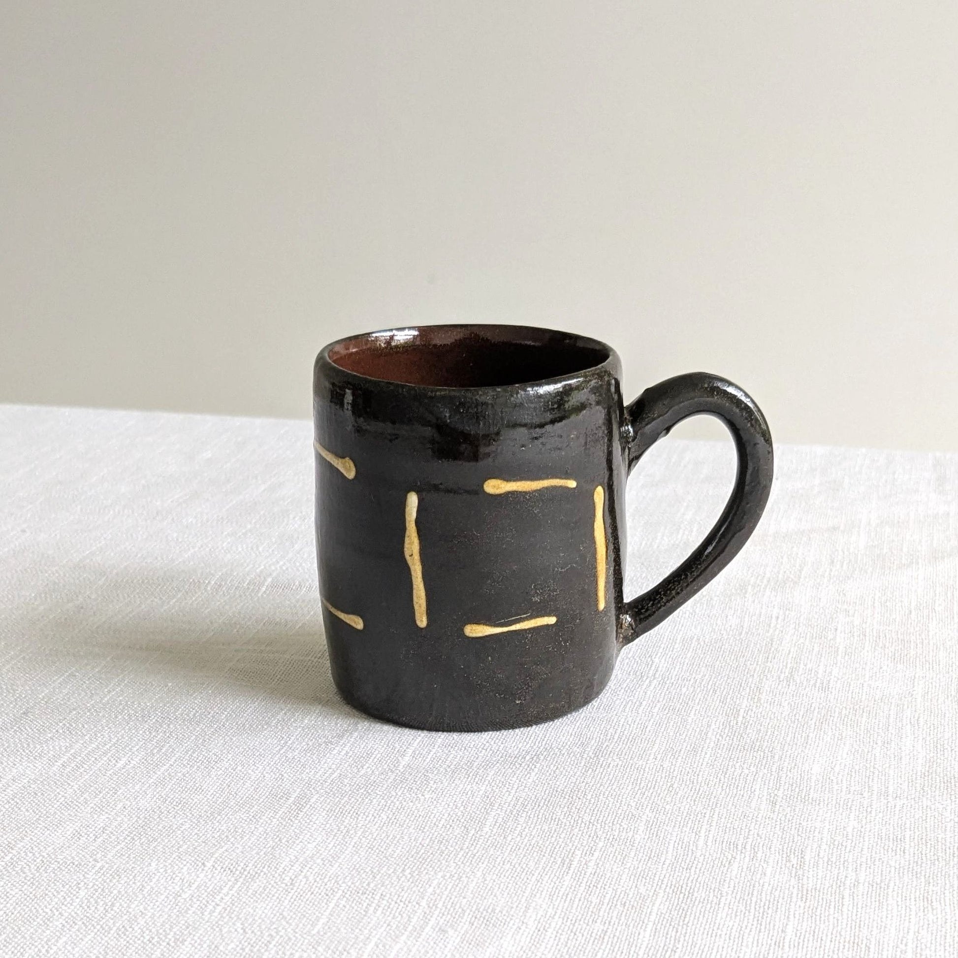 Small rustic brown glazed mug with a linear slipware design in yellow.