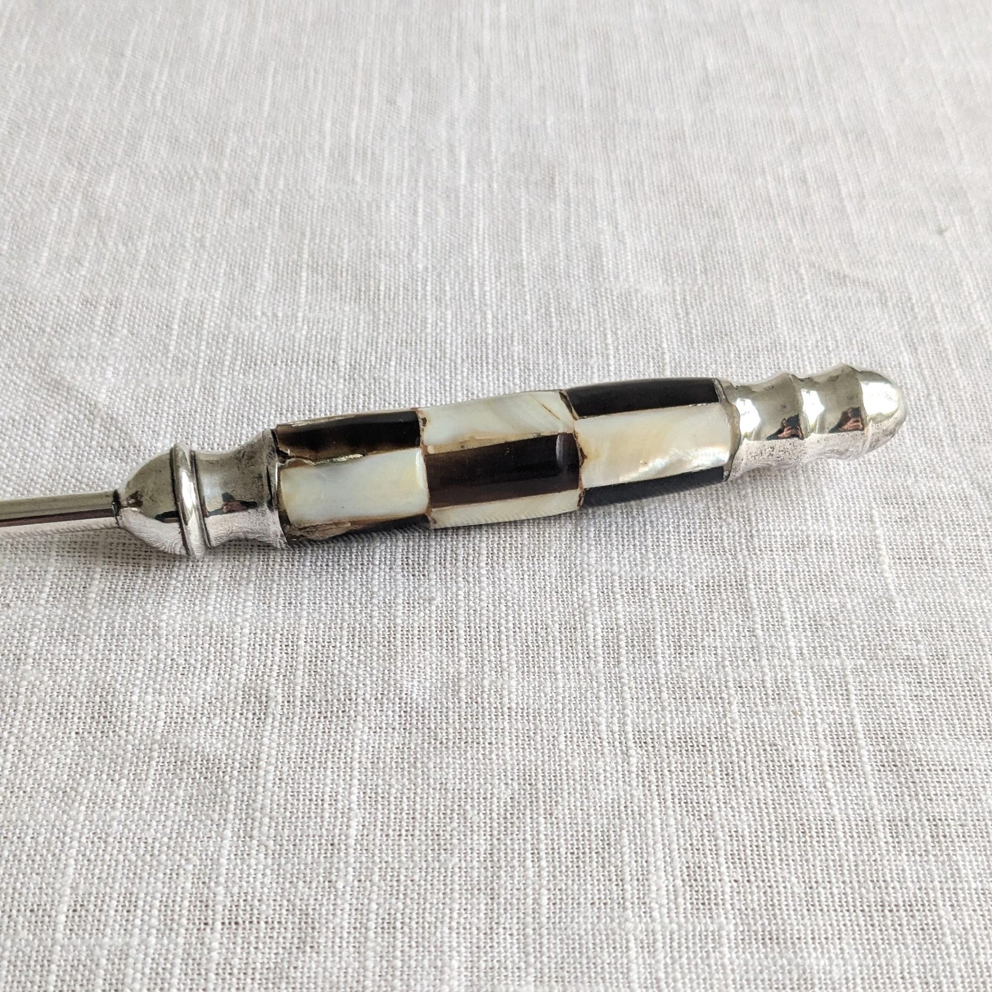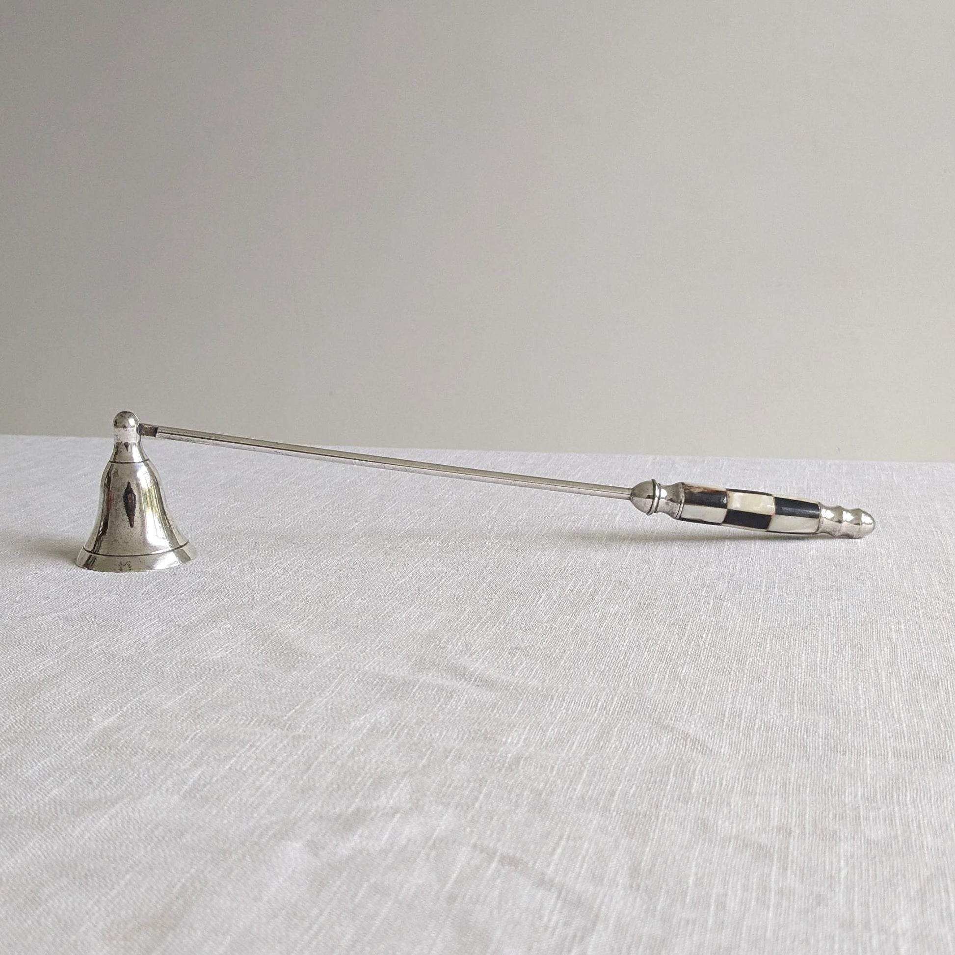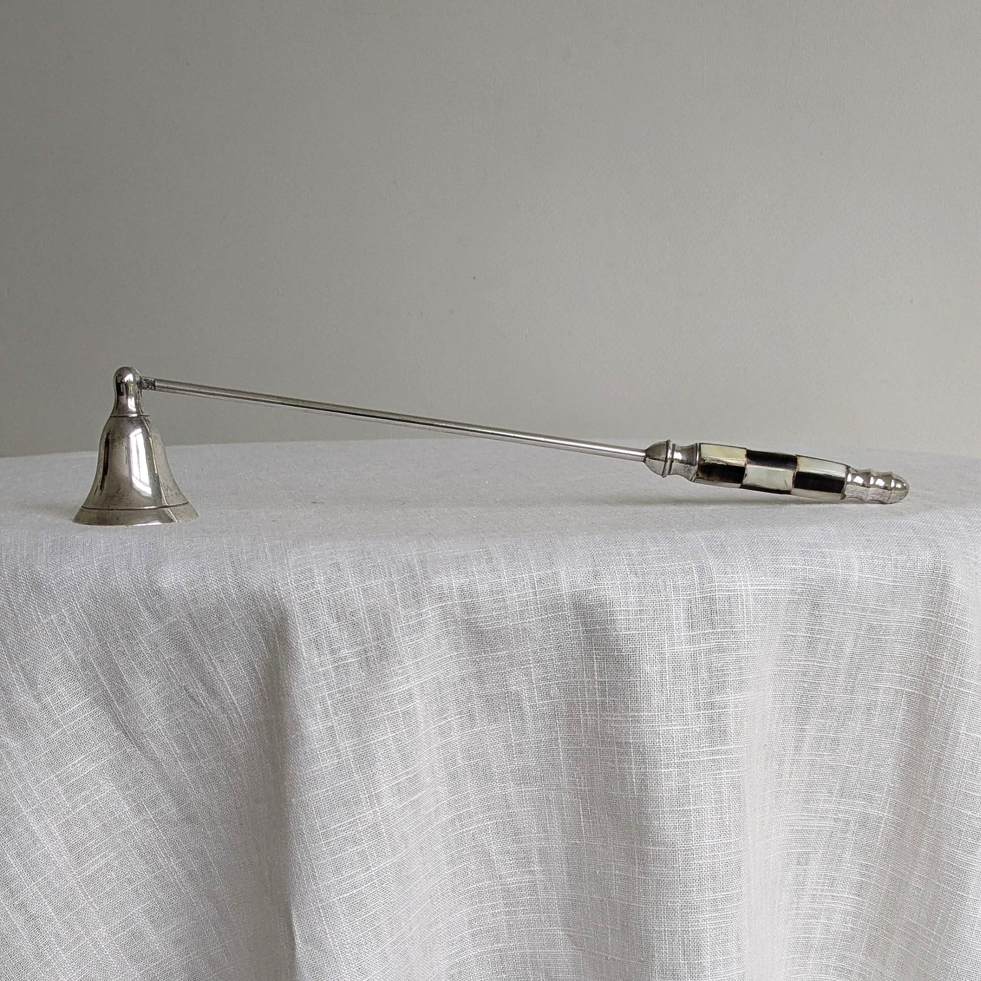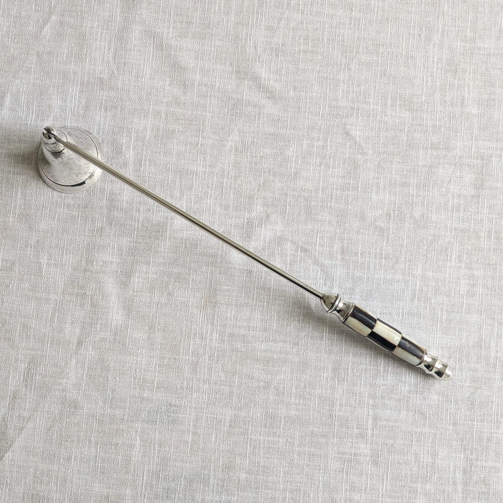 Rare mid century candle snuffer with a mother of pearl inlaid handle in a black and white checked design.