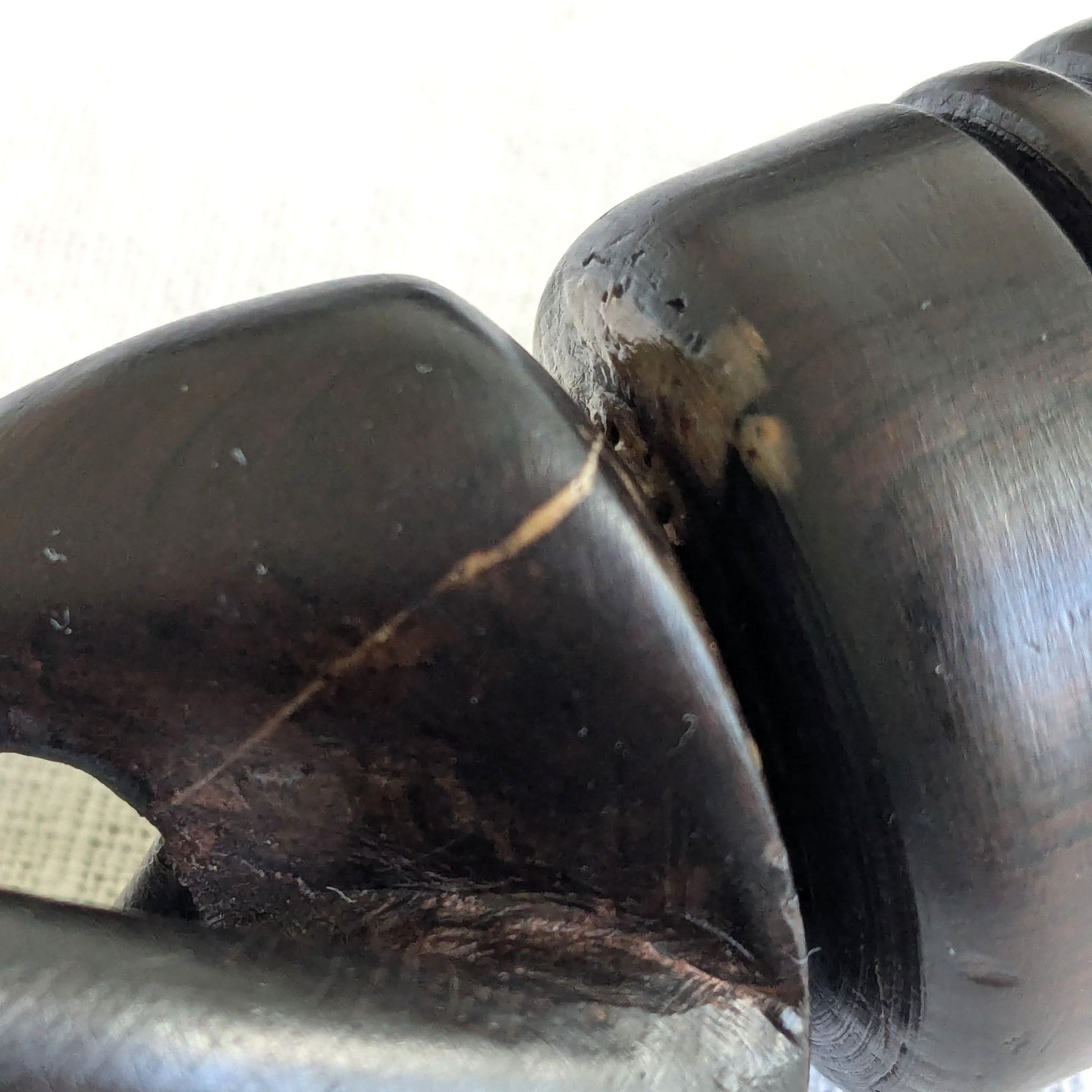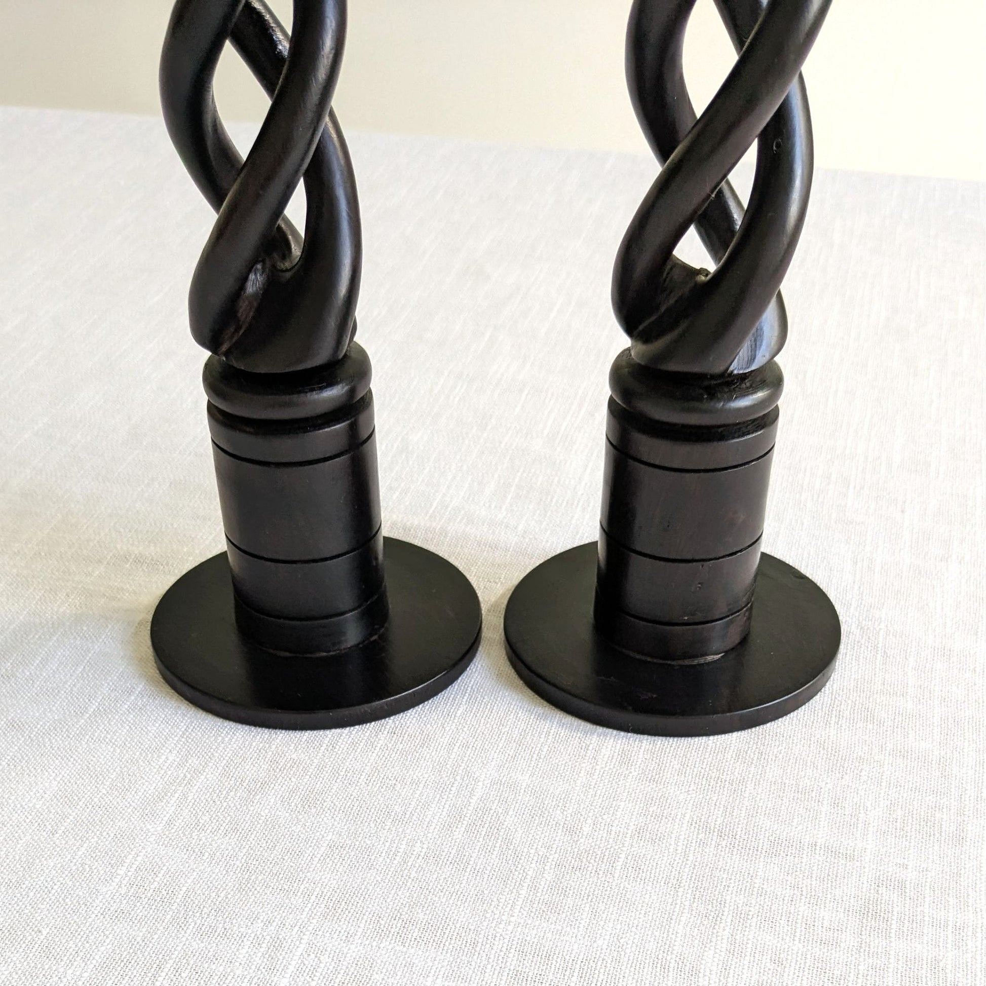 Hand-carved in dark wood (possibly ebony), each candlestick has three twisting wood strands with flat circular bases.