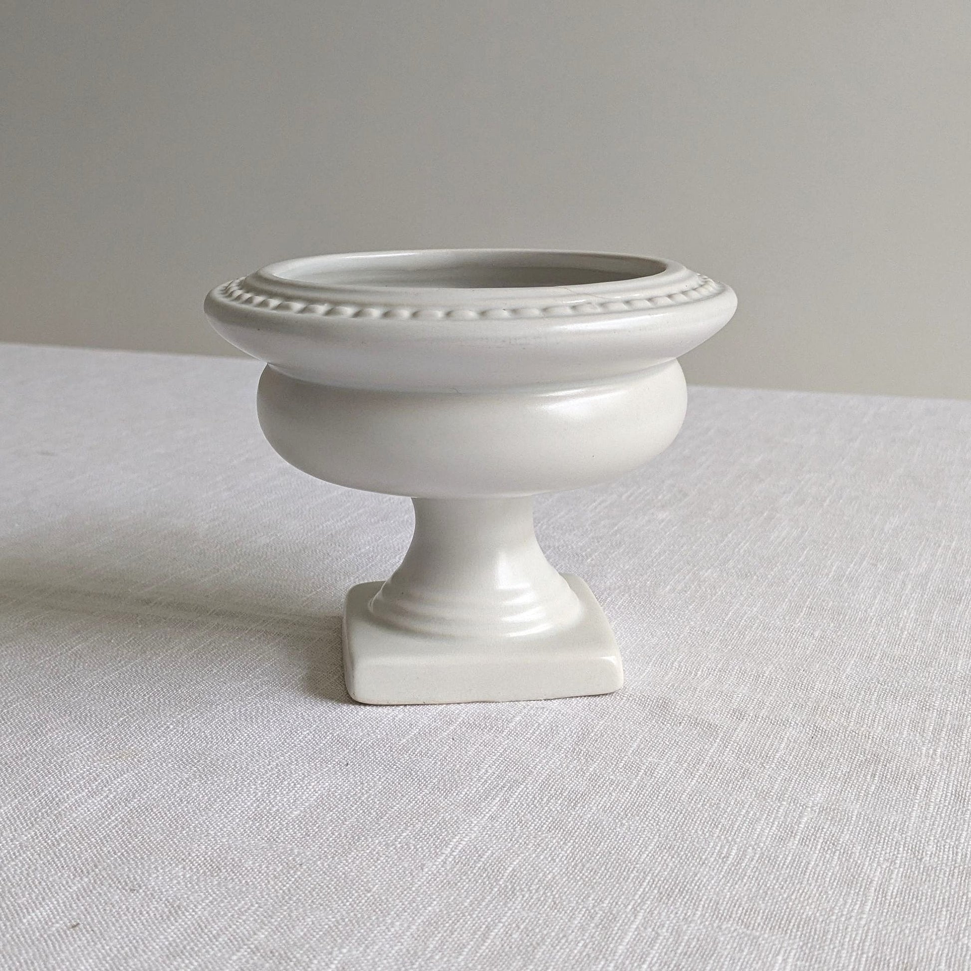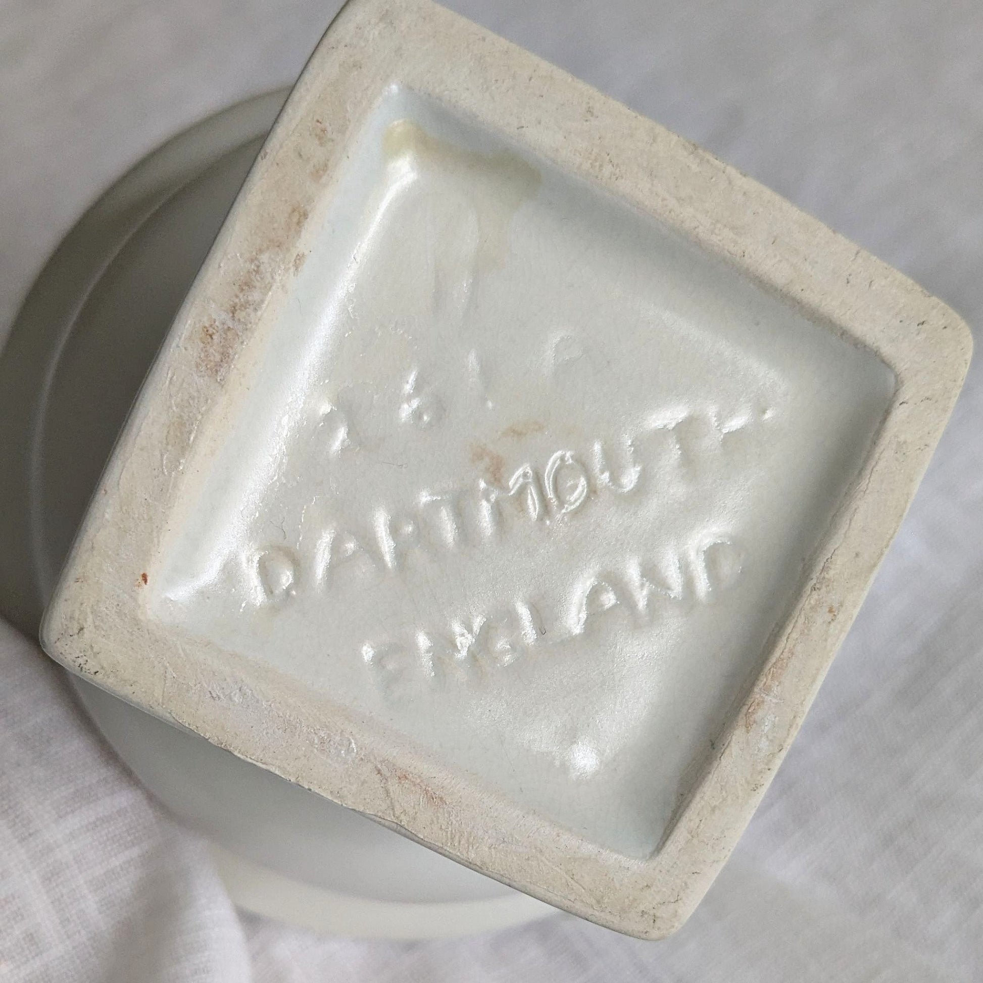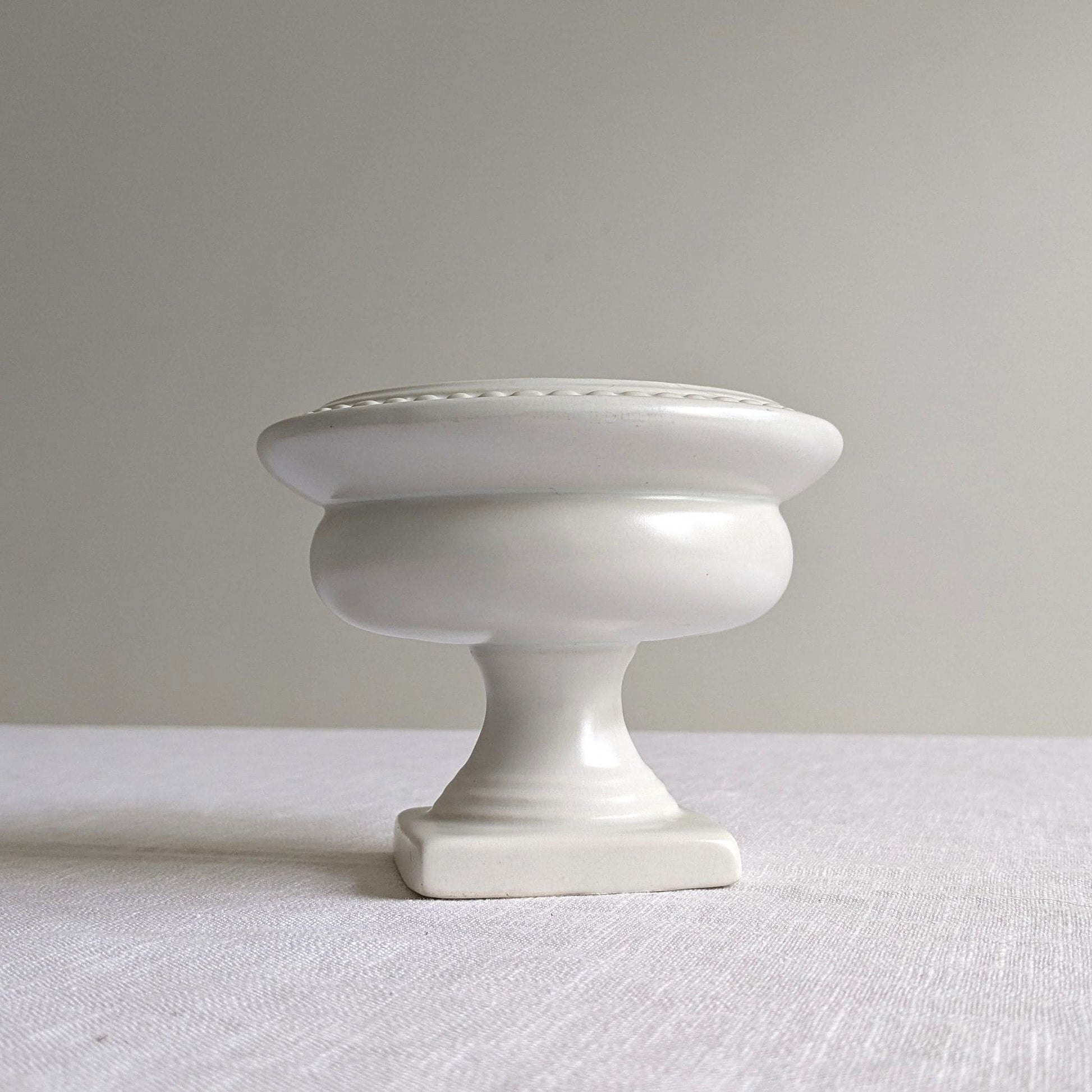Circular vintage urn-style vase by Dartmouth Pottery of Devon with a square pedestal base and chalk-white glaze.