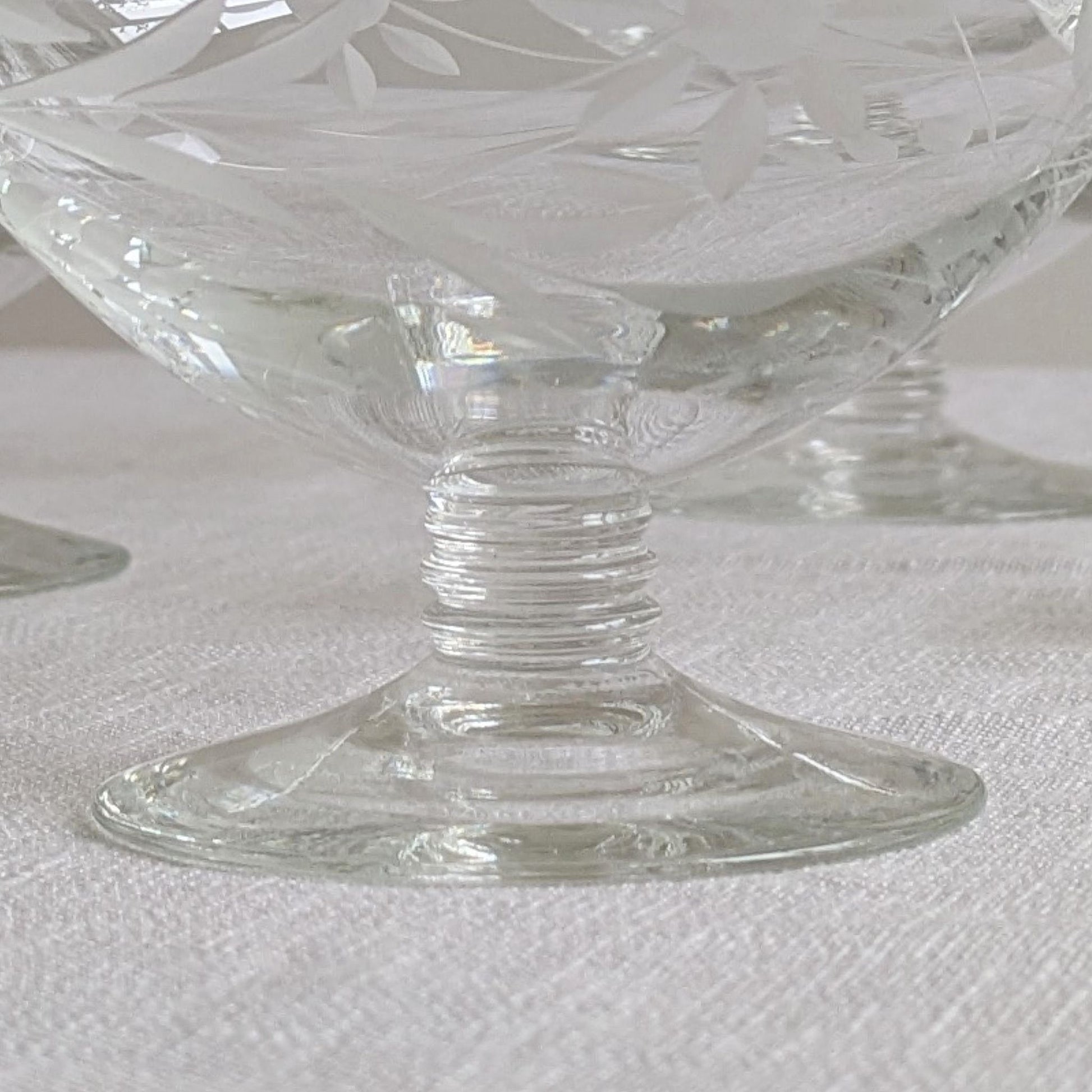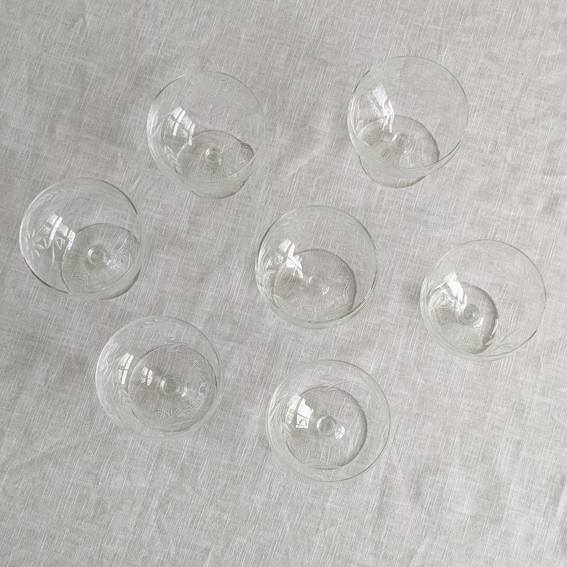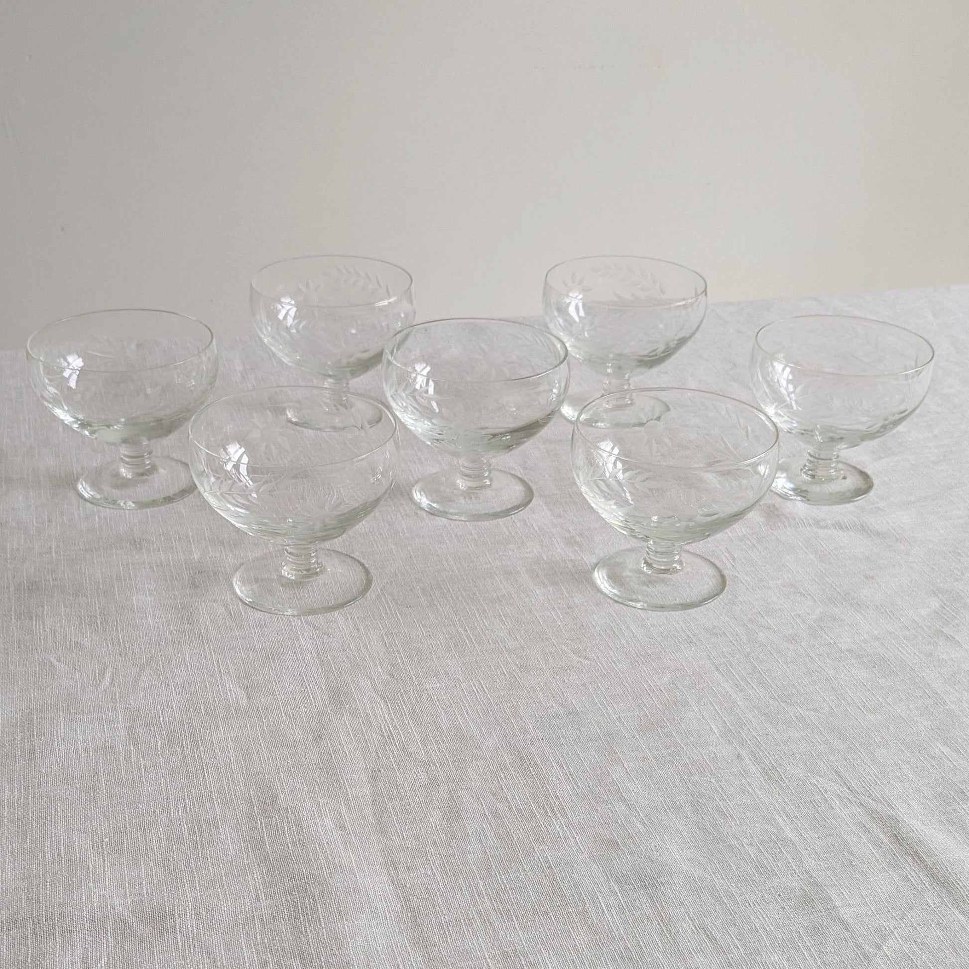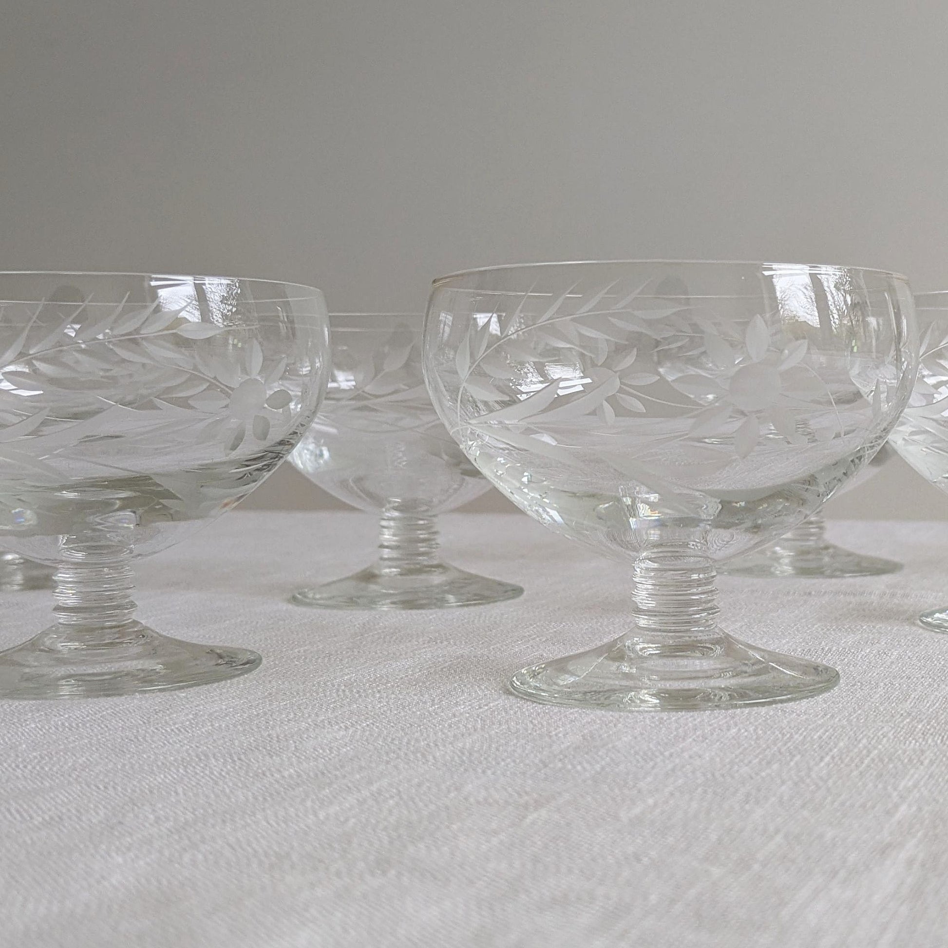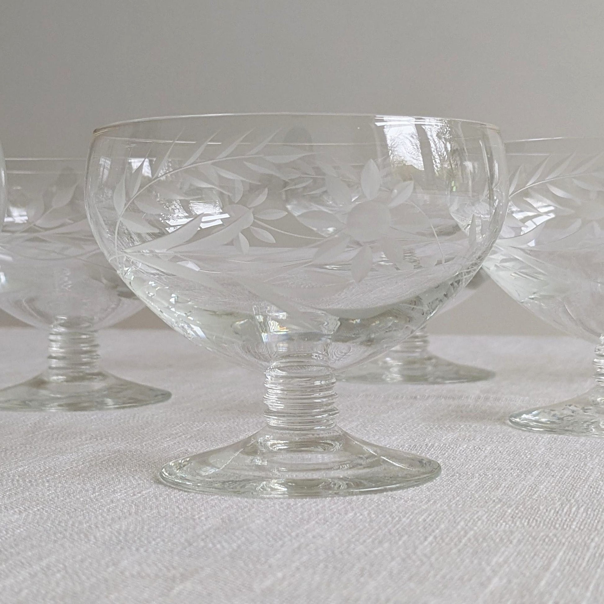 Delicate glasses in a low sherbet style with a short stem and etched bowl. Ideal to serve champagne or a chilled dessert such as sorbet.