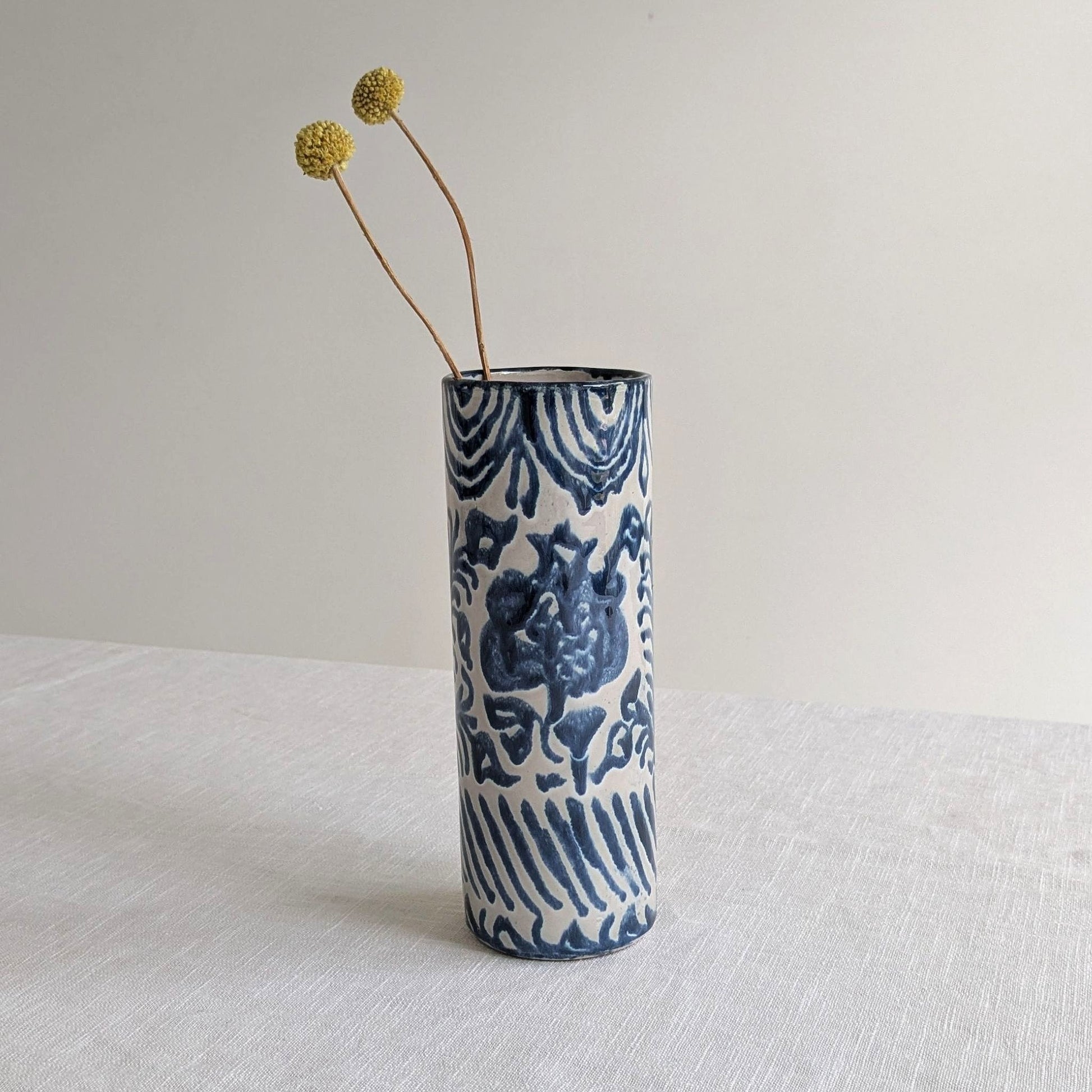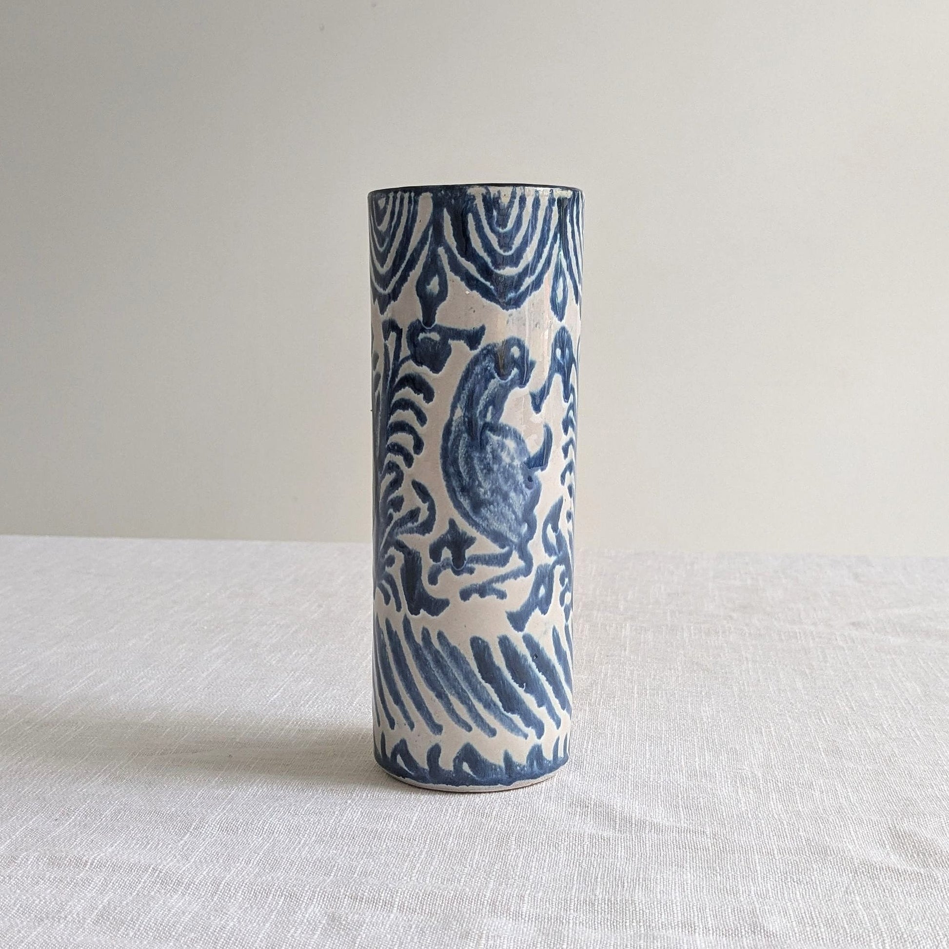Vintage Spanish vase with a narrow cylindrical form. Hand painted with motifs of a pomegranate, bird, feathers and flowers in cornflower blue against a white background.