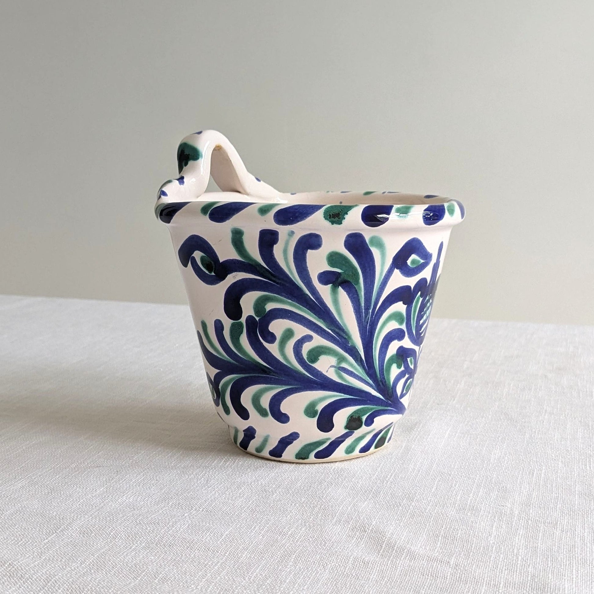 Vintage hanging plant pot from Granada in Spain with hand-painted floral motifs in cobalt blue and emerald green against a white background.