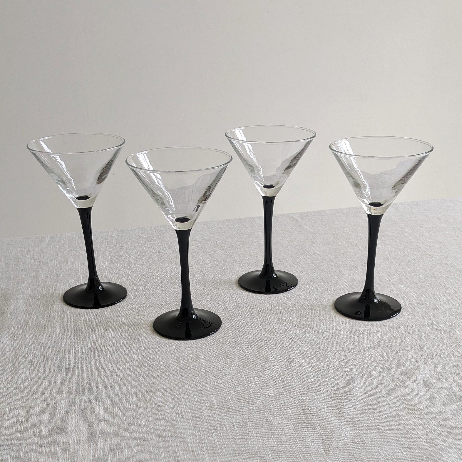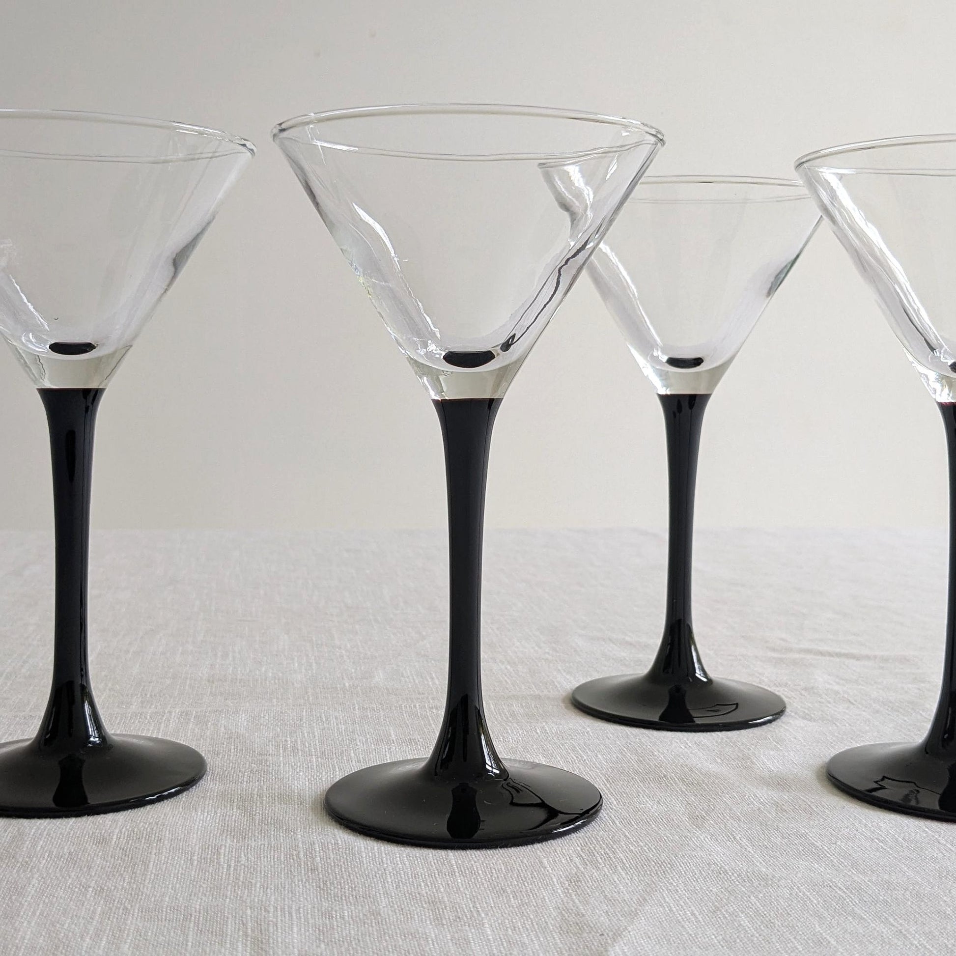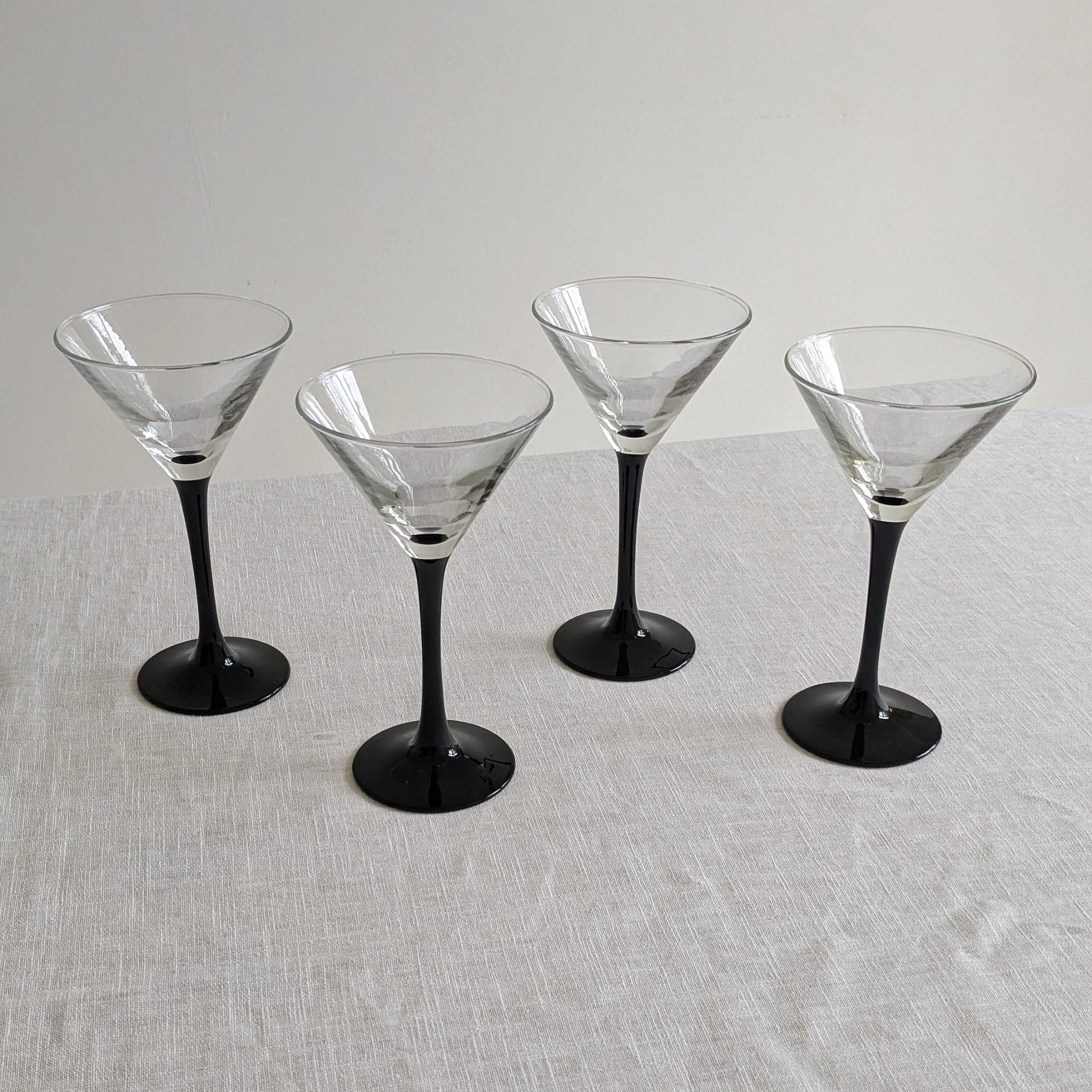 A set of four glossy-black stemmed martini glasses with a v-line bowl. Designed by ARC of France from the Domino glassware range, c1980s.