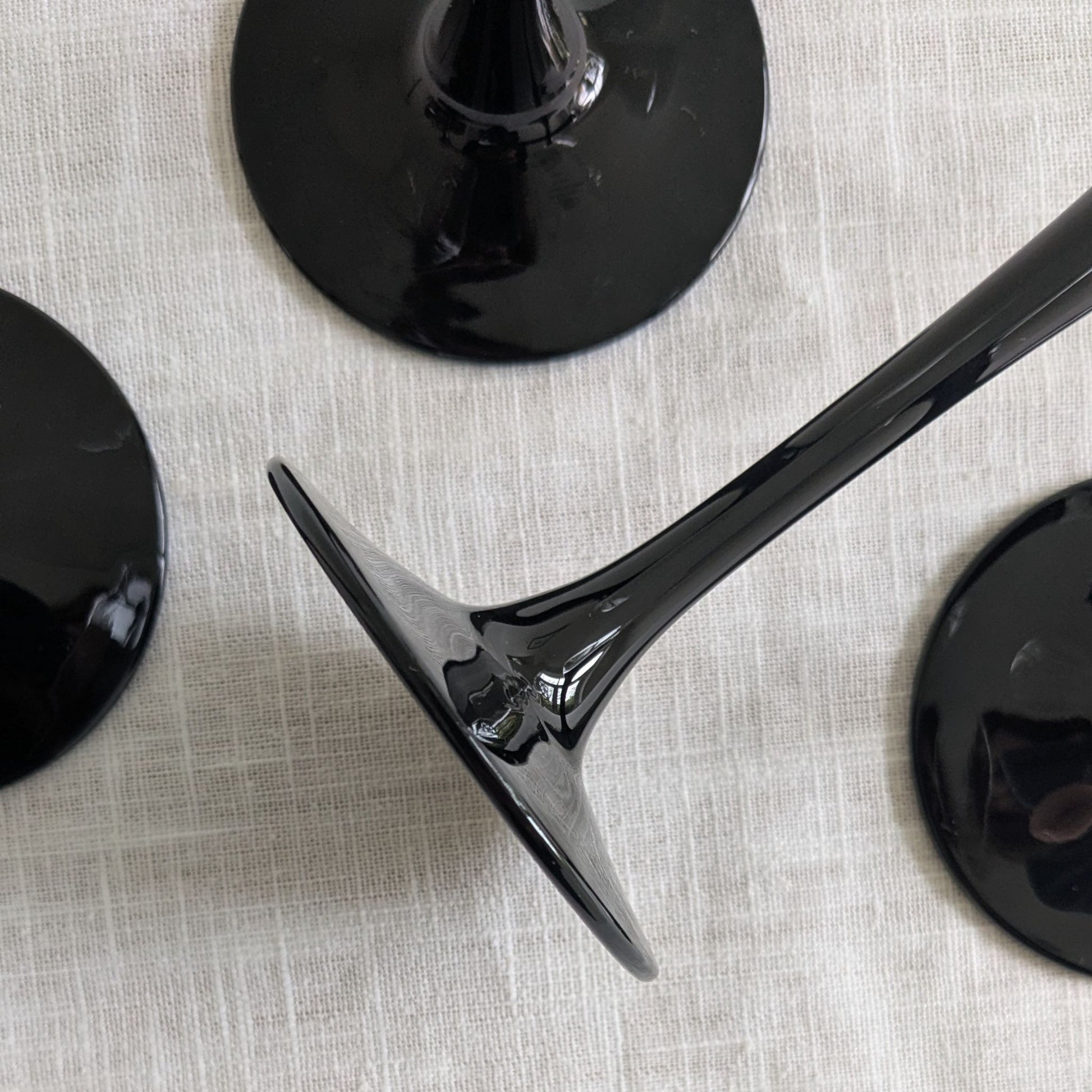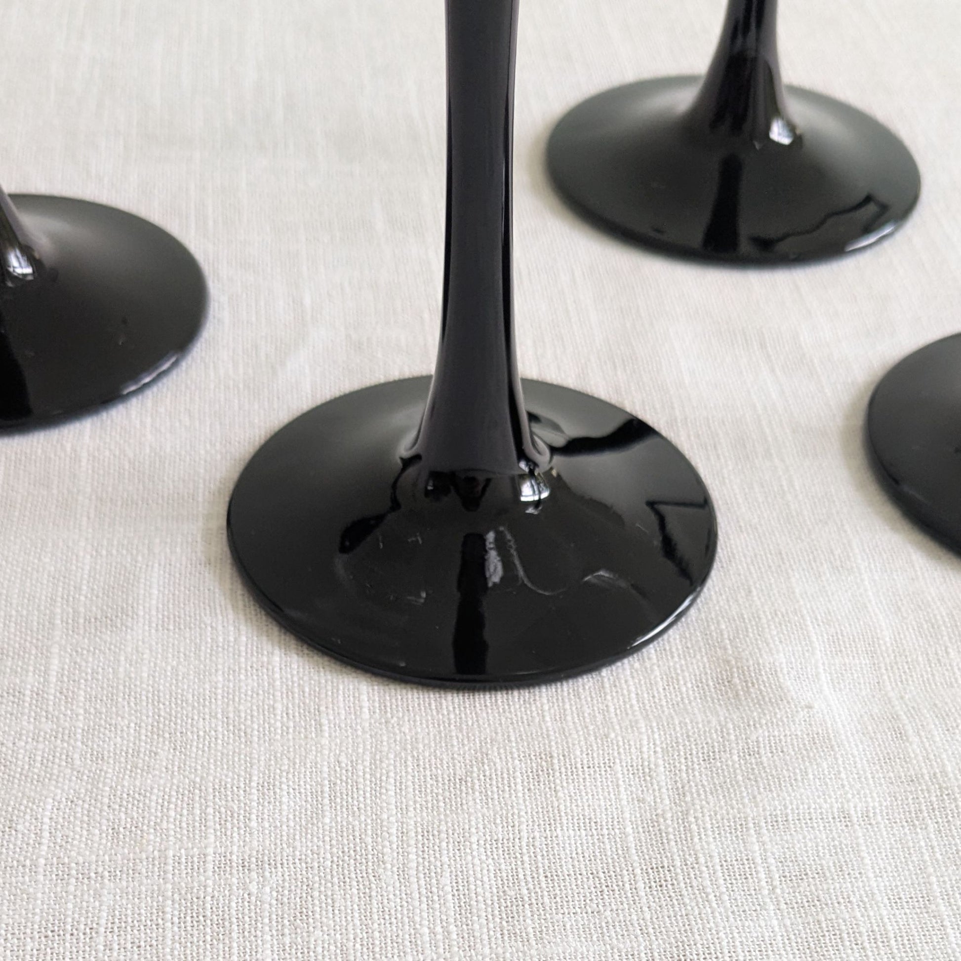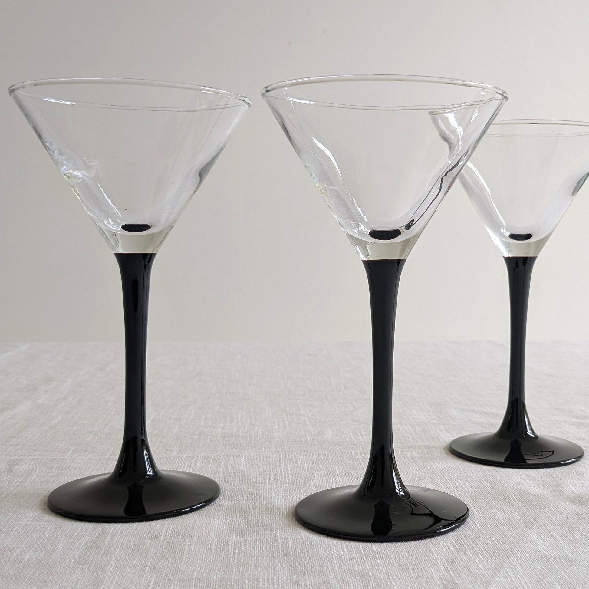 A set of four glossy-black stemmed martini glasses with a v-line bowl. Designed by ARC of France from the Domino glassware range, c1980s.