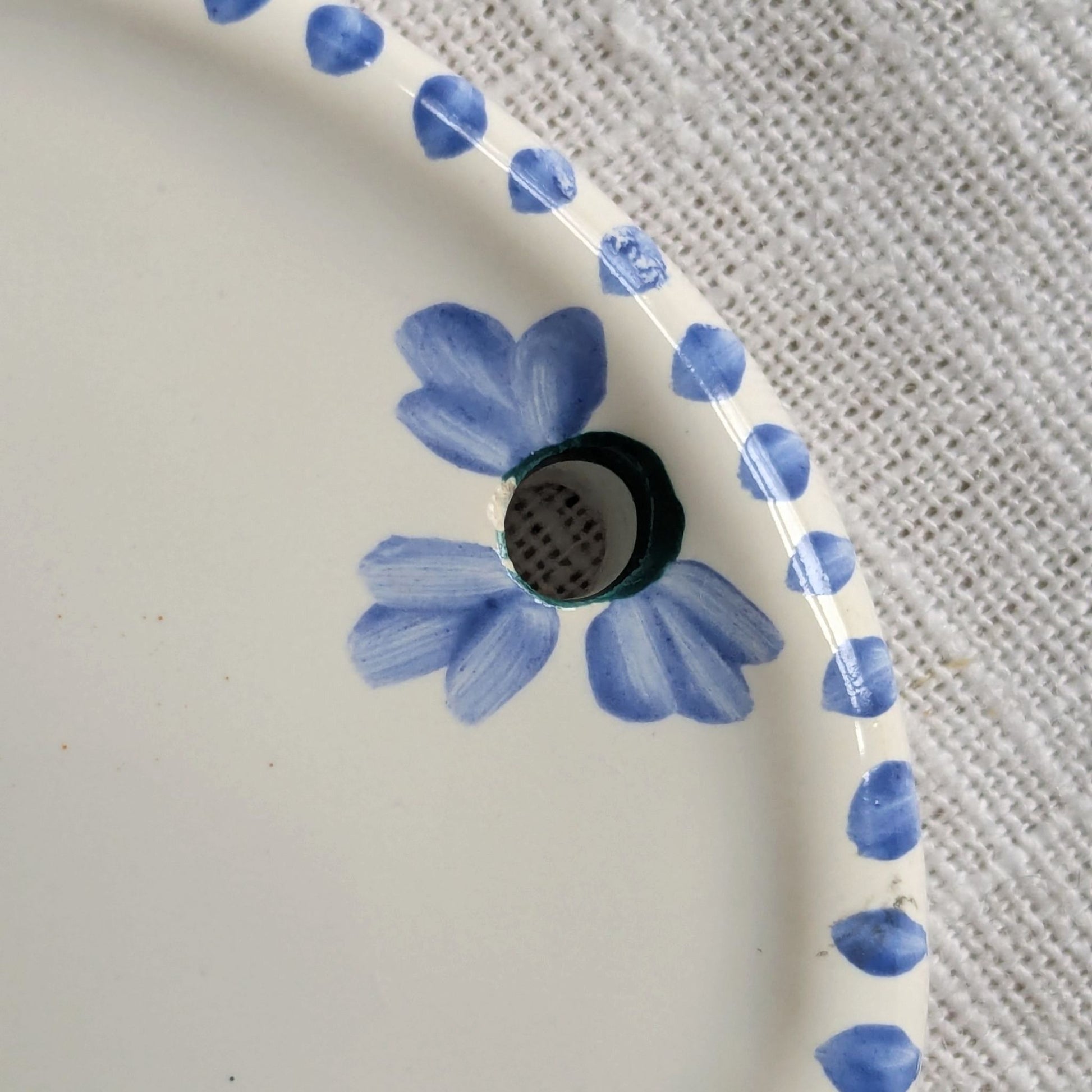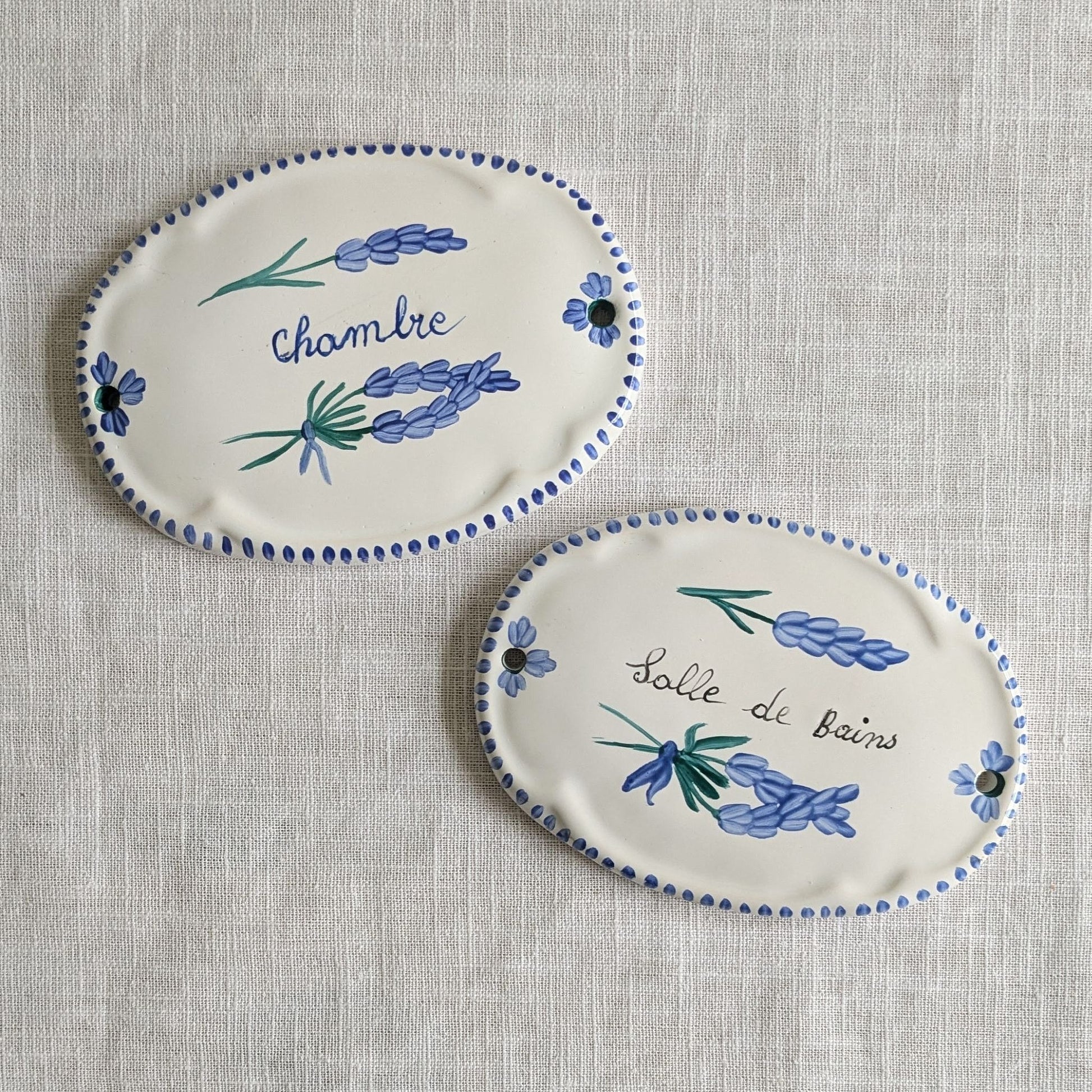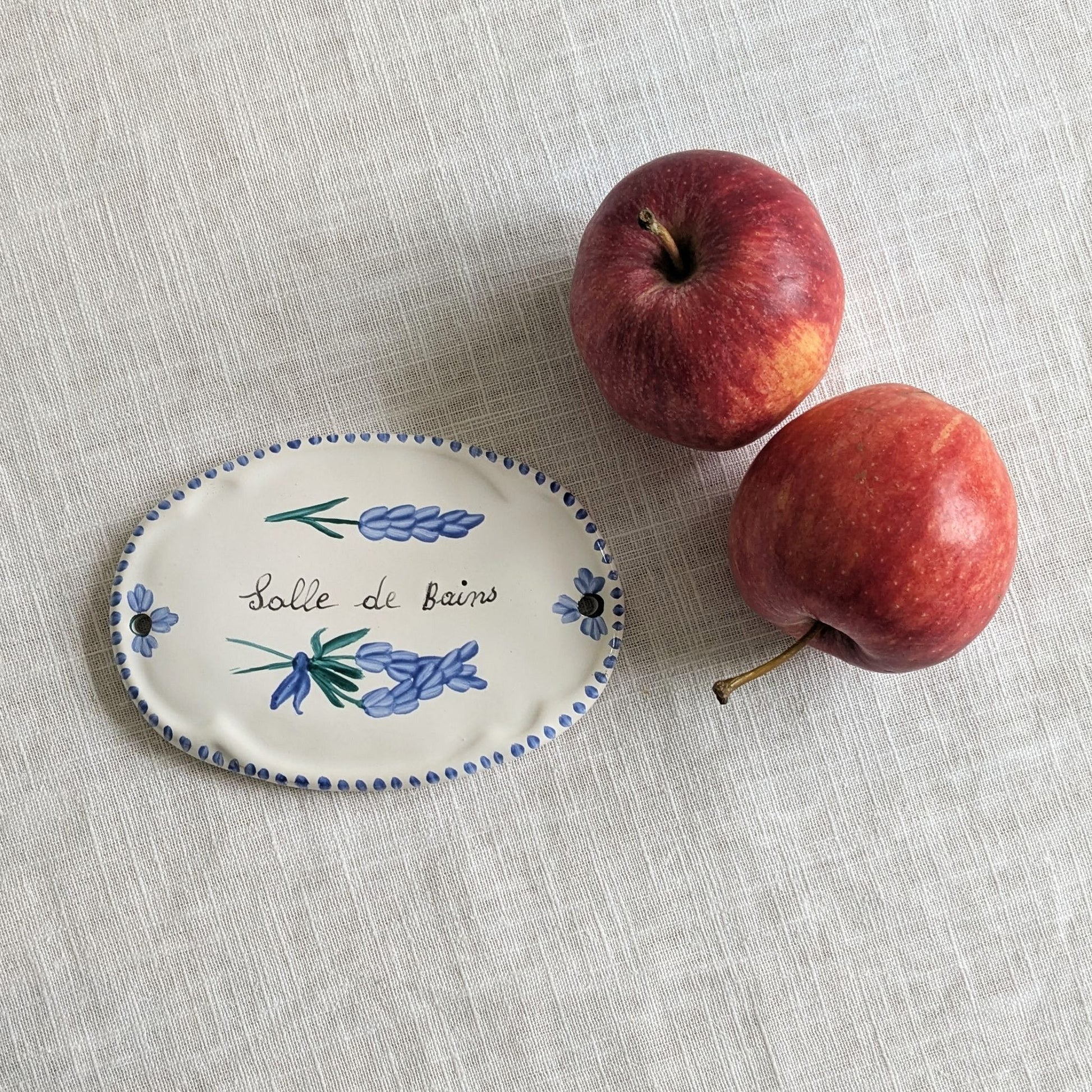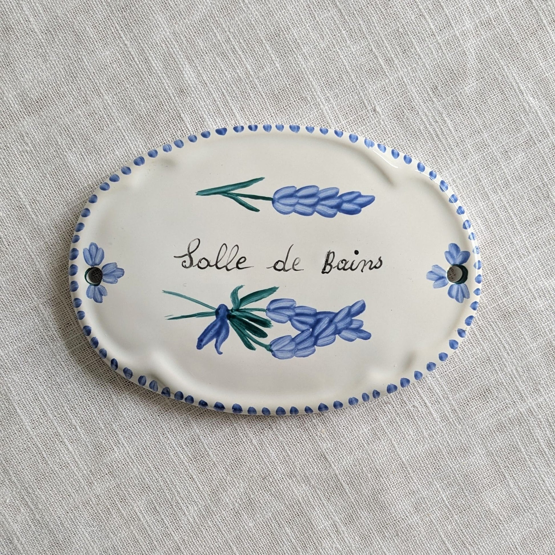 Very pretty and rare faience ceramic Salle de Bains door sign from France. The sign is hand-painted with stems of blue lavender and a sweet dotted border.