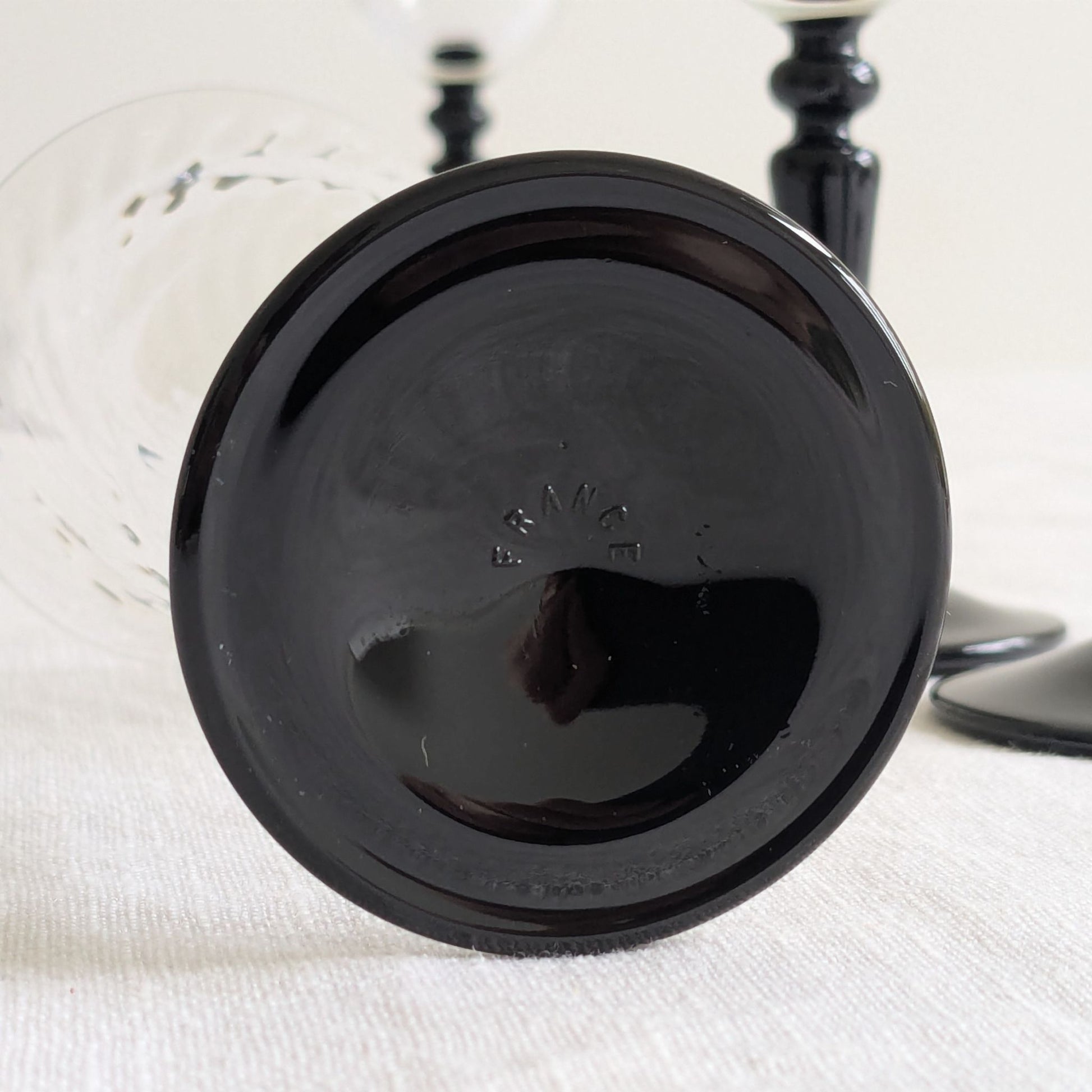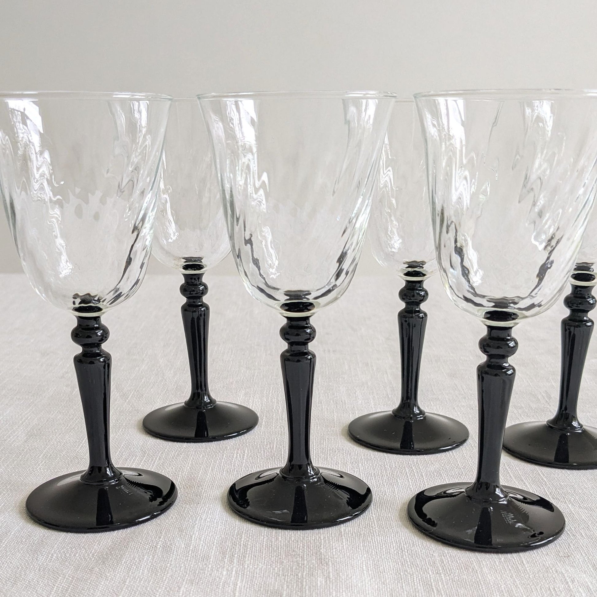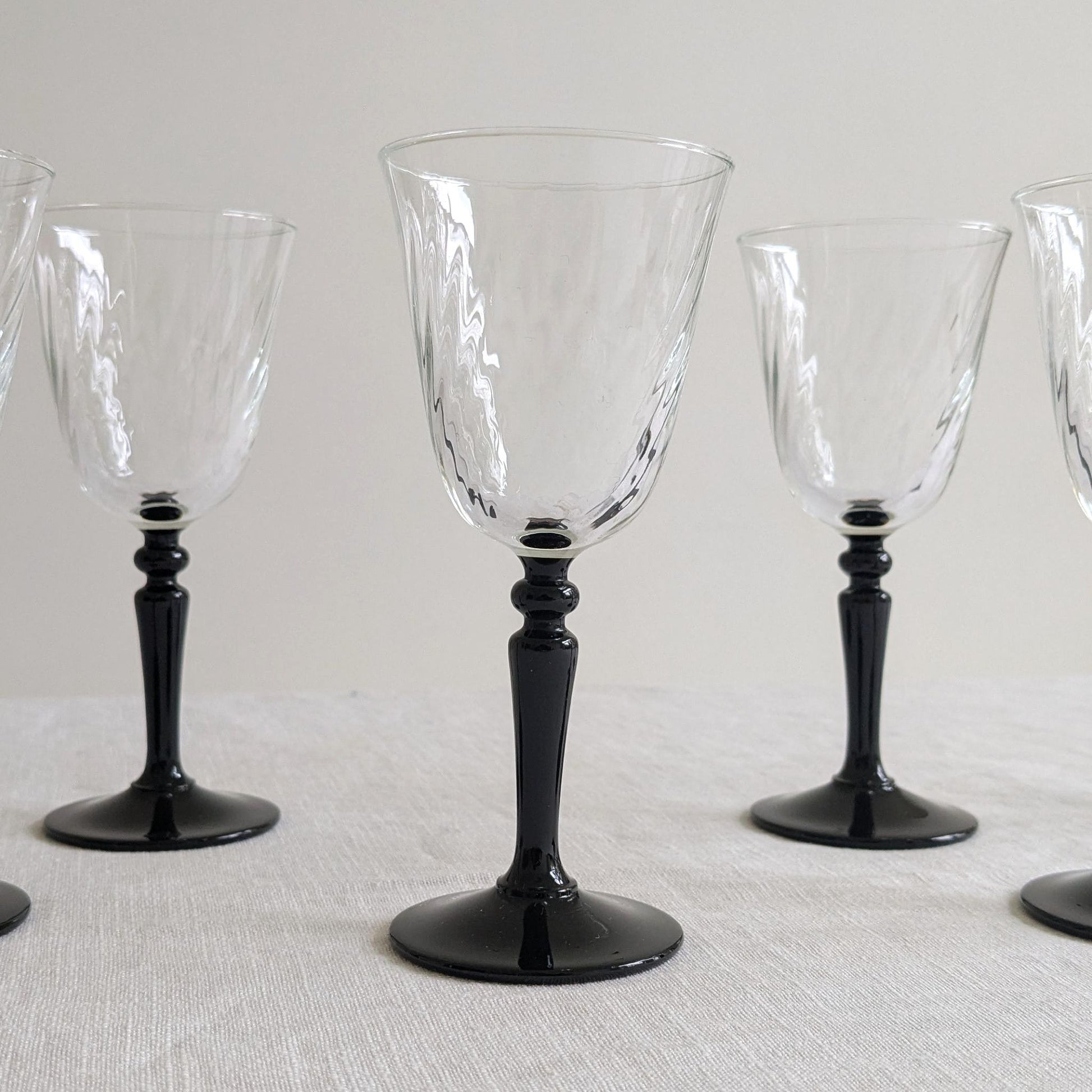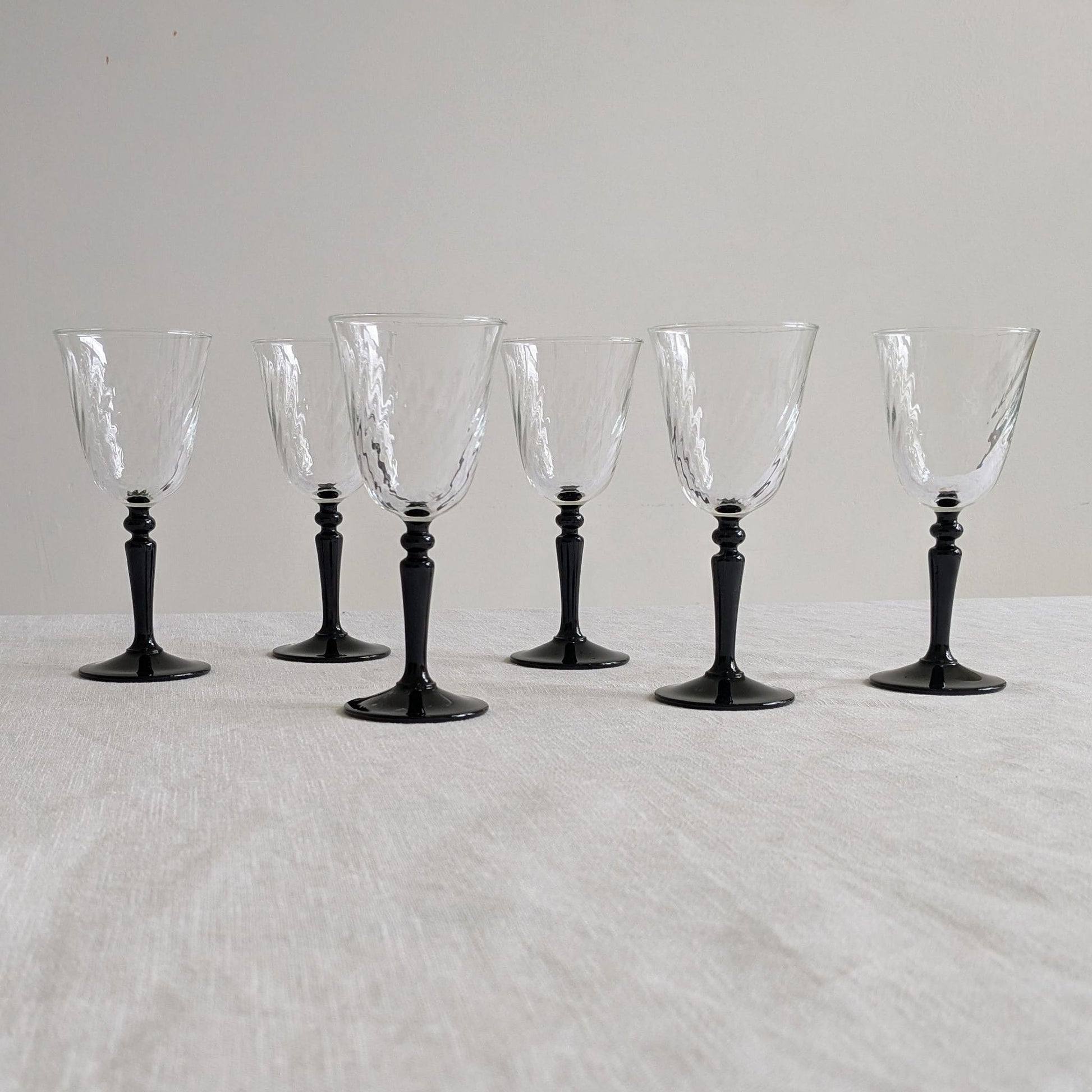 A set of six small glasses by Luminarc of France with jet black stems and bases and a twisted, swirling effect to the glass cups.