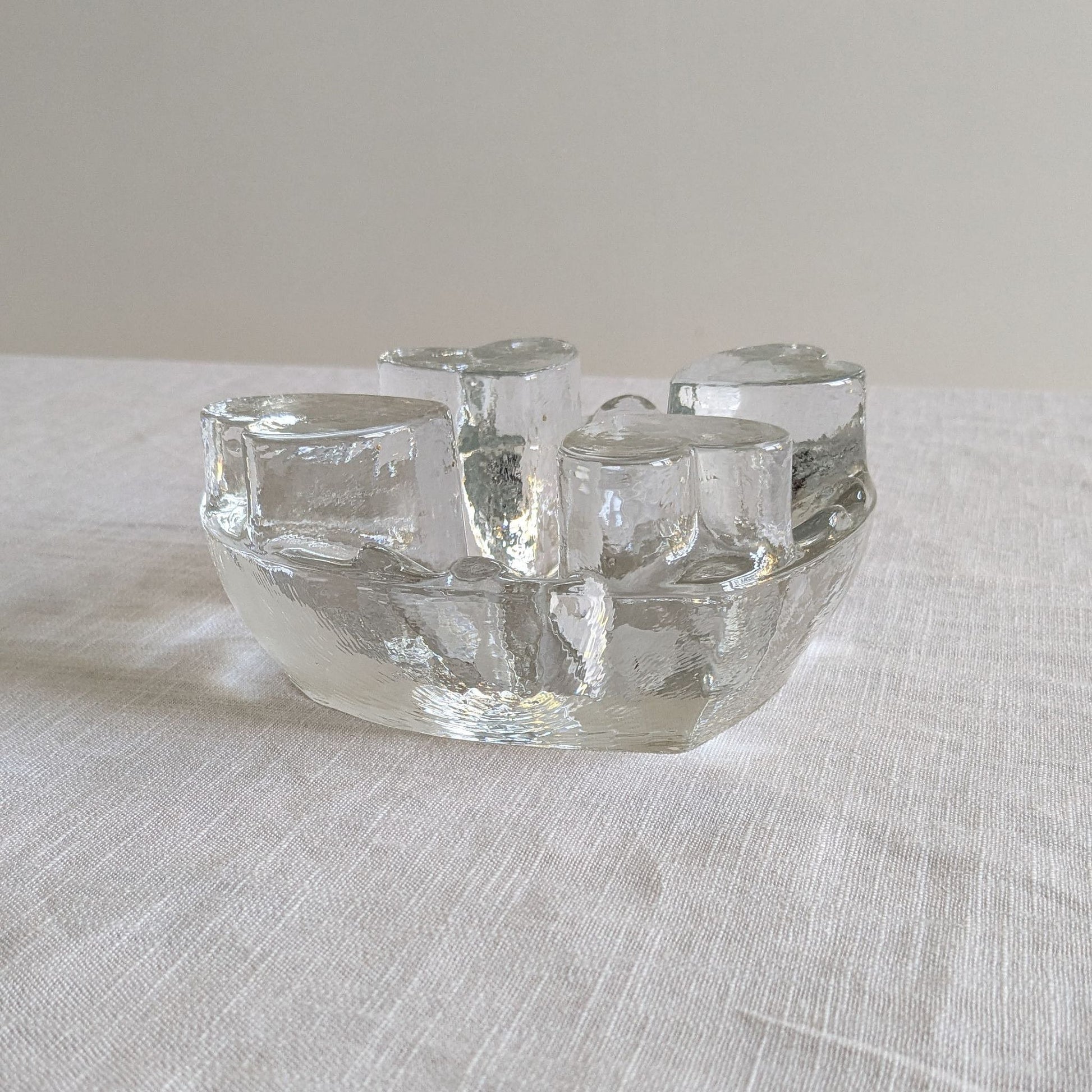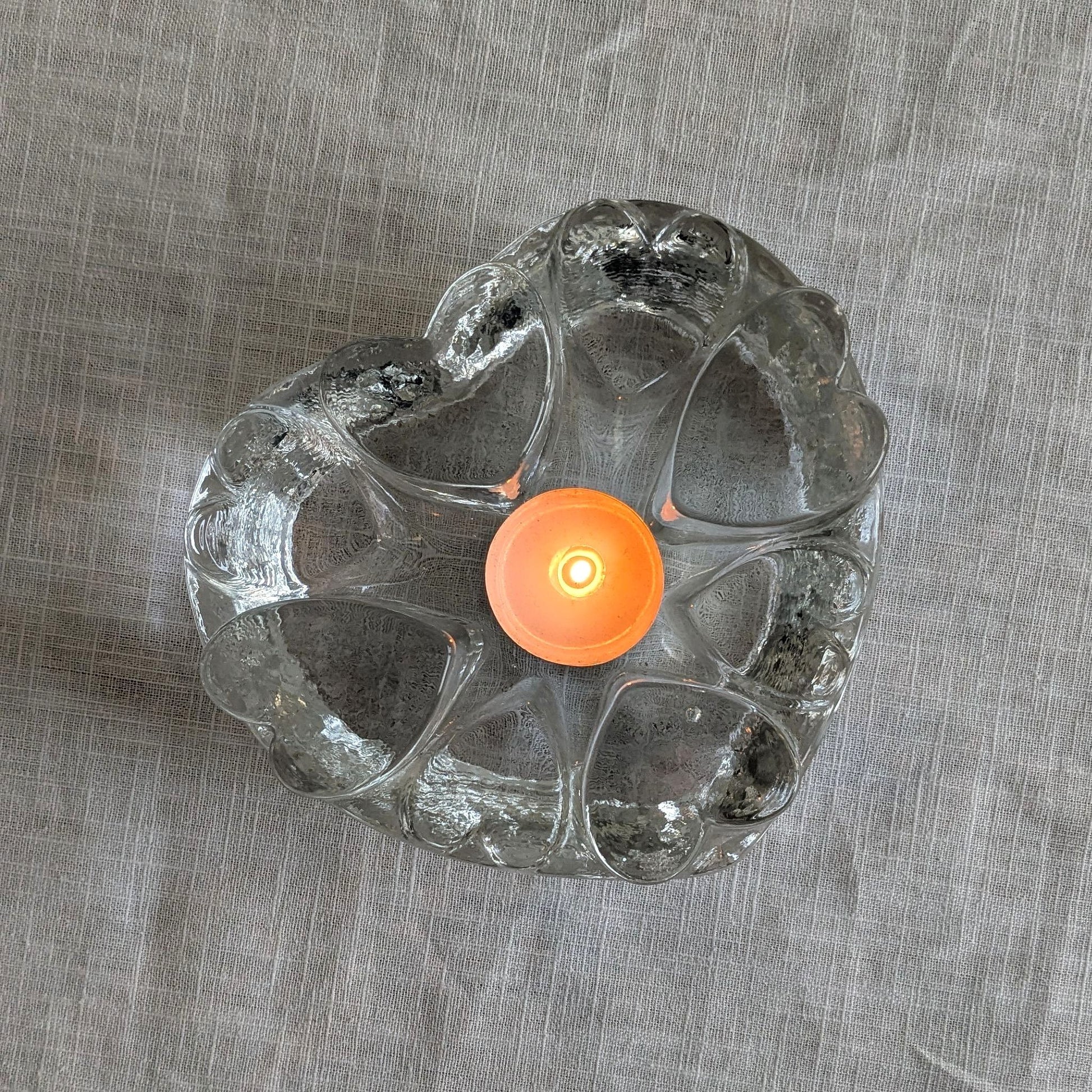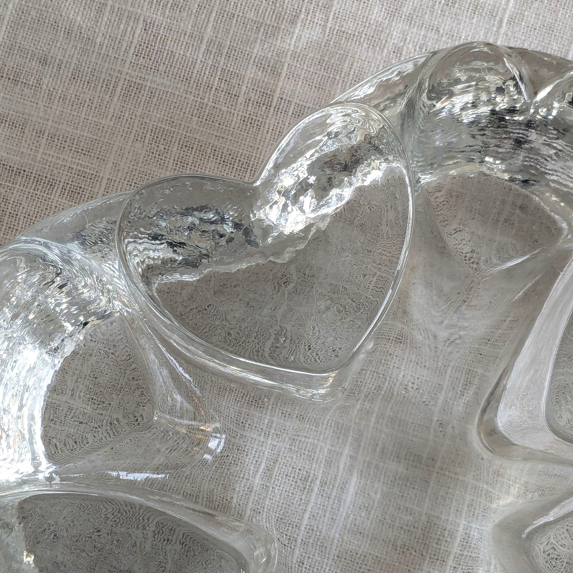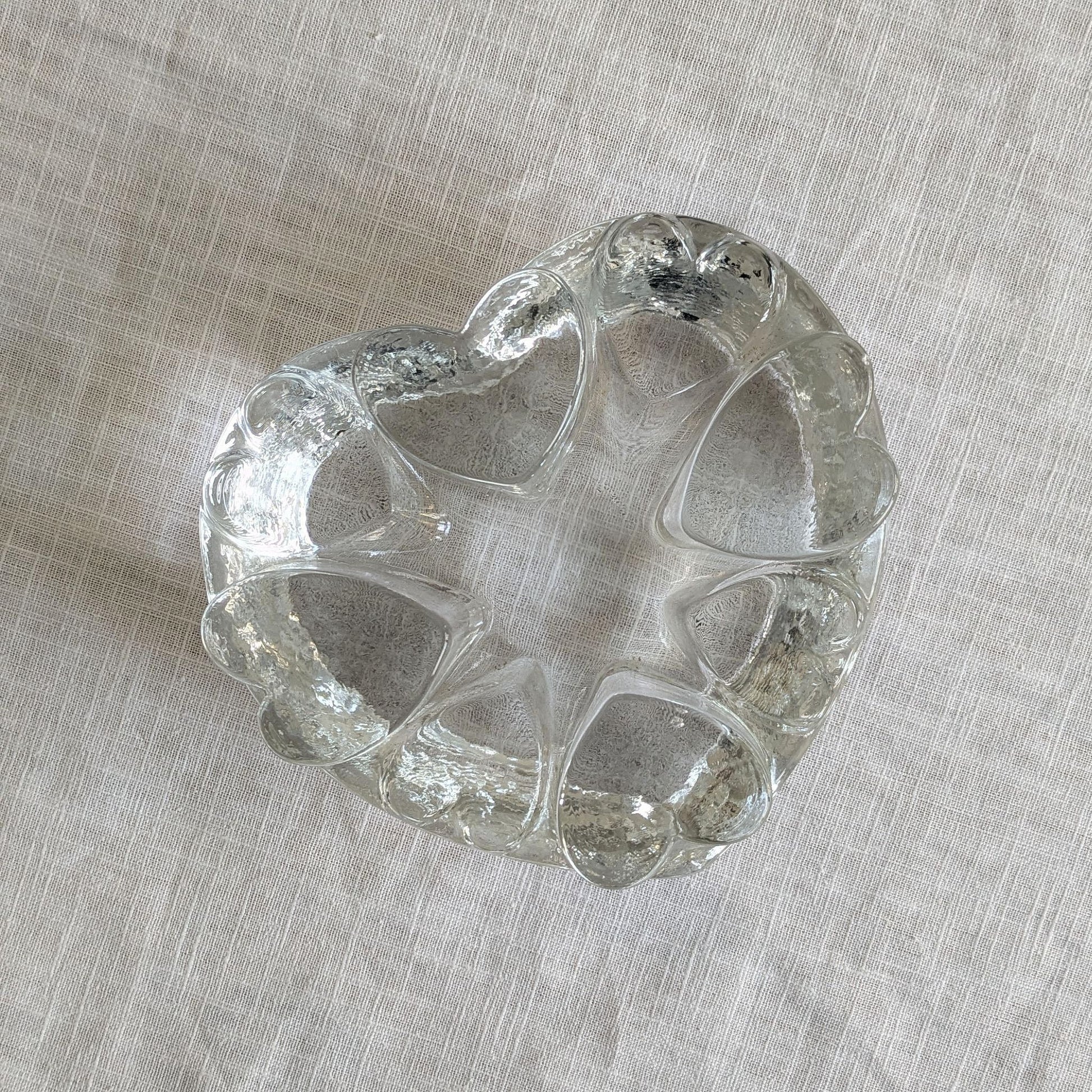 Vintage German ice glass candle holder in the shape of a heart and with a series of chunky hearts to the edge.