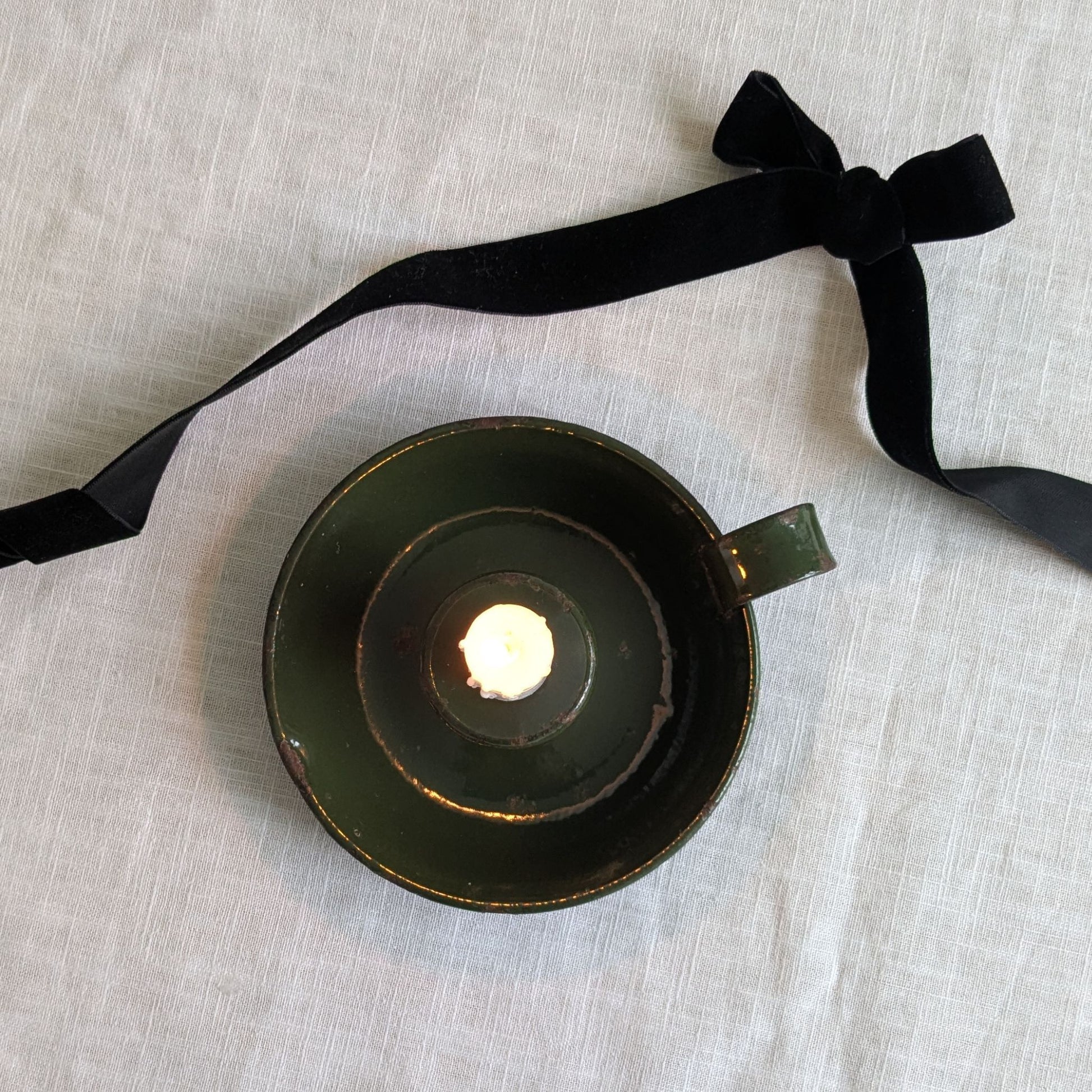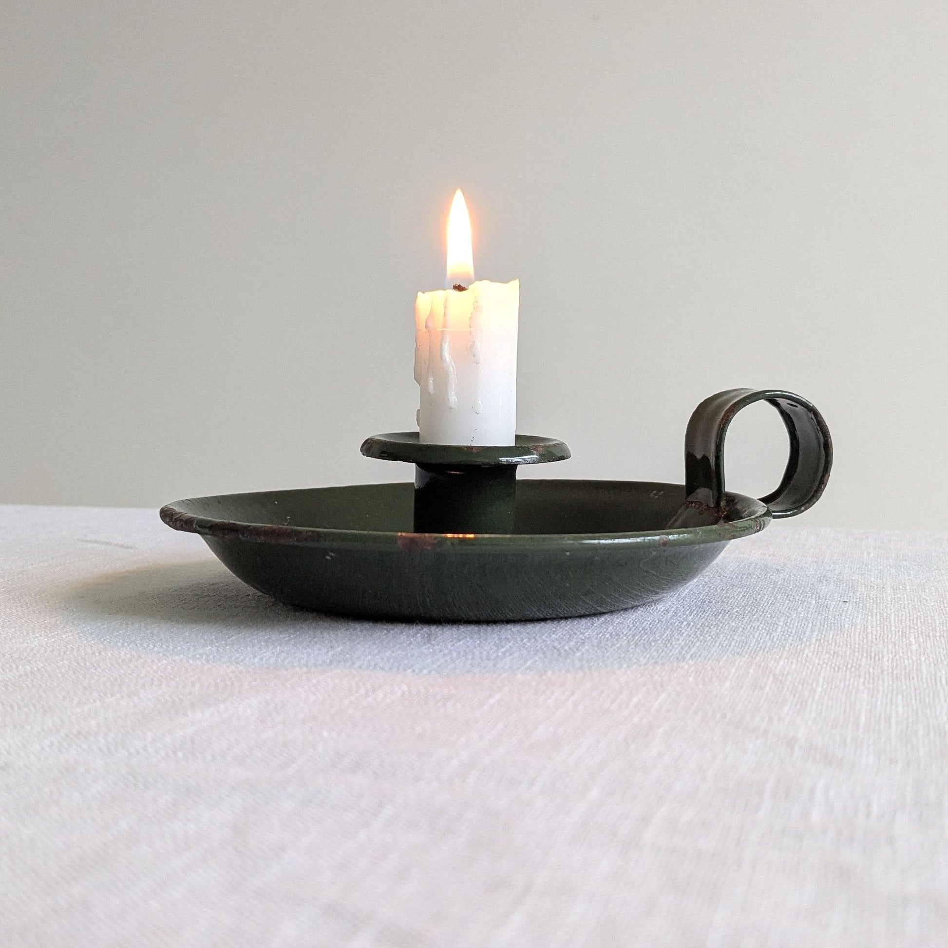 Aged metal chamberstick with forest green enamel paint and a flared candle socket. Wide drip tray and fitted with a circular looped handle.