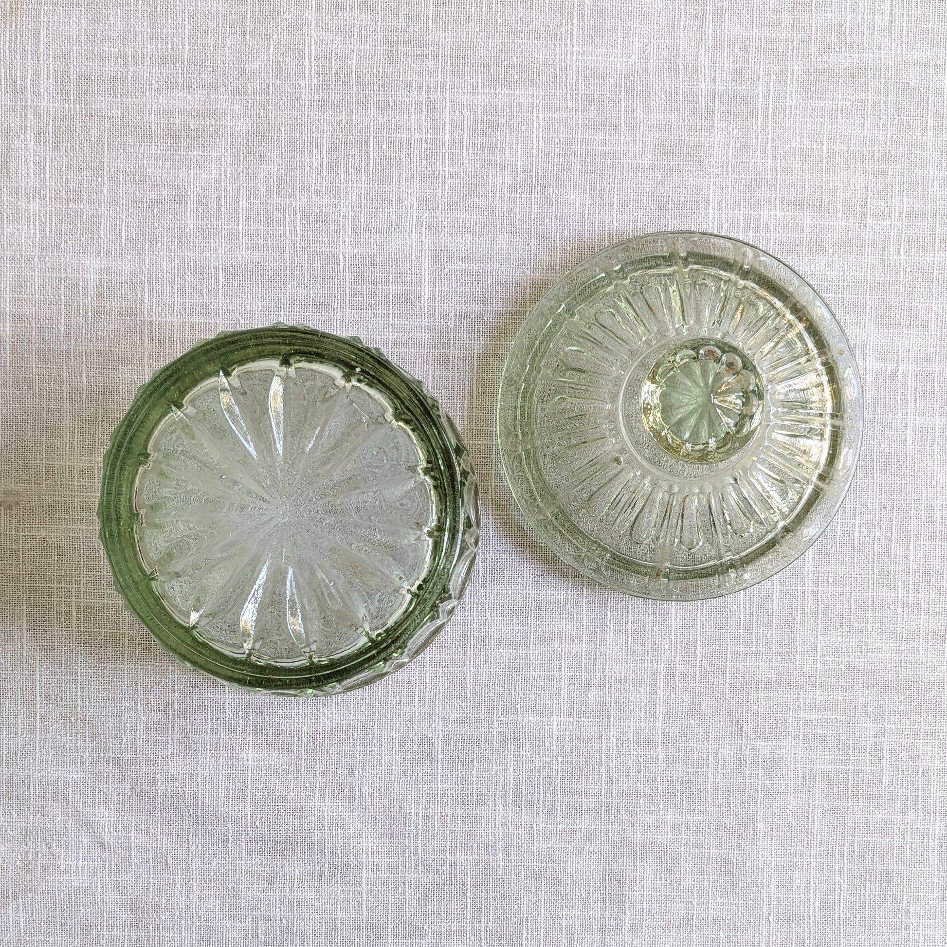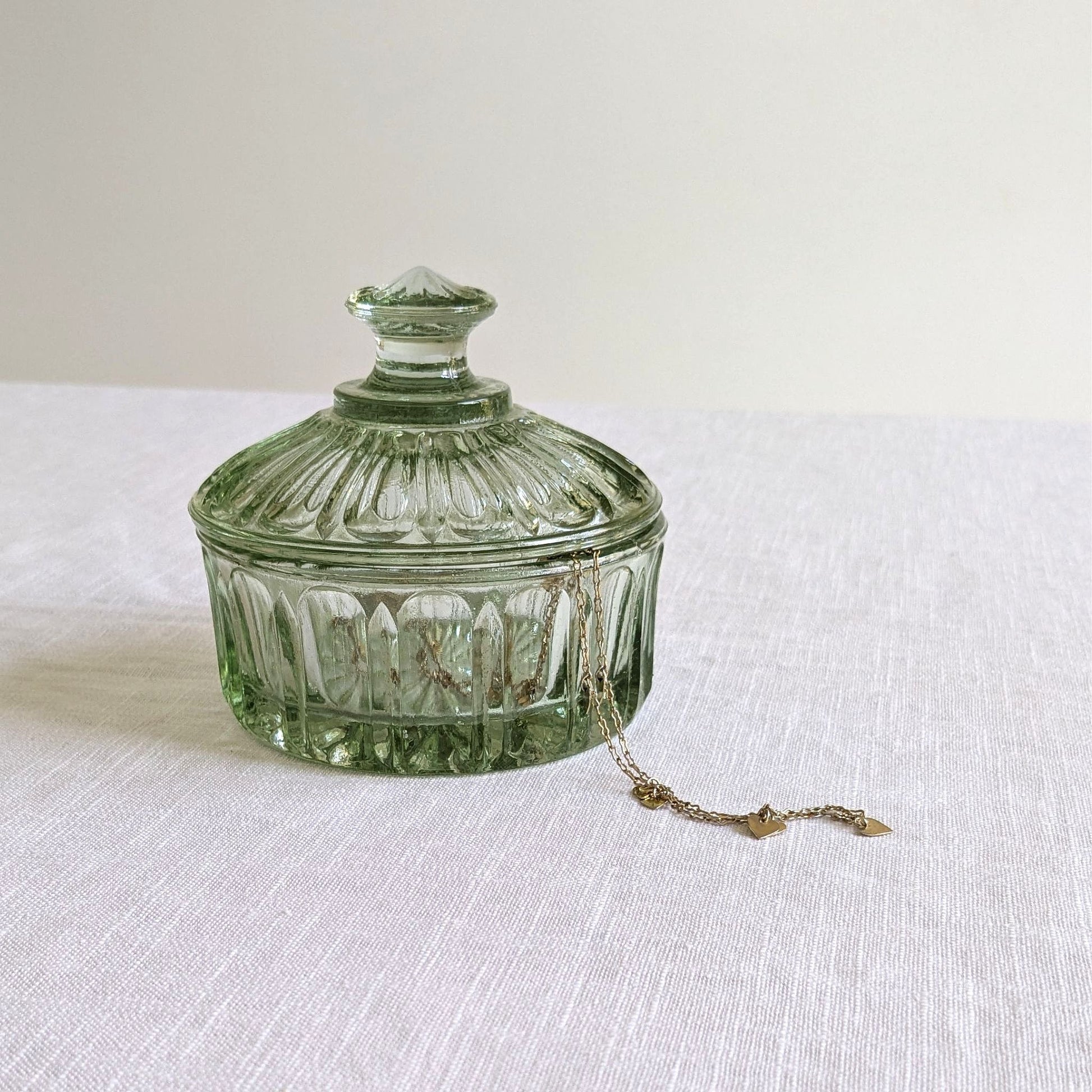 Pretty vintage trinket pot in pale green pressed glass with a chunky form. Ideal size to hold jewellery or small make up items.