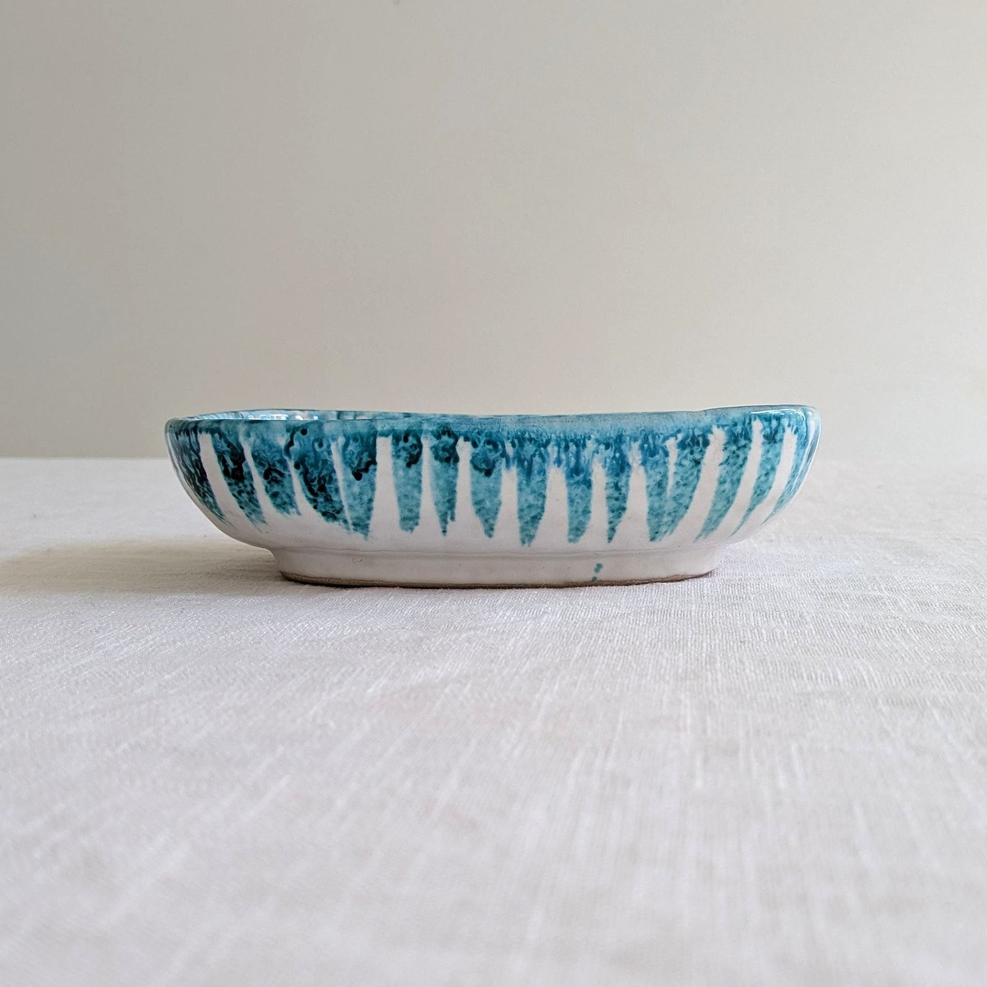 Majolica style serving dish decorated with a textured design of grapes and leaves. Dribbly turquoise blue edging.