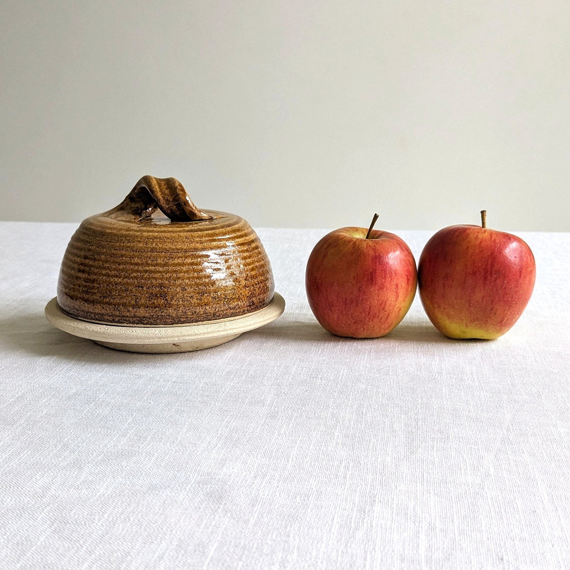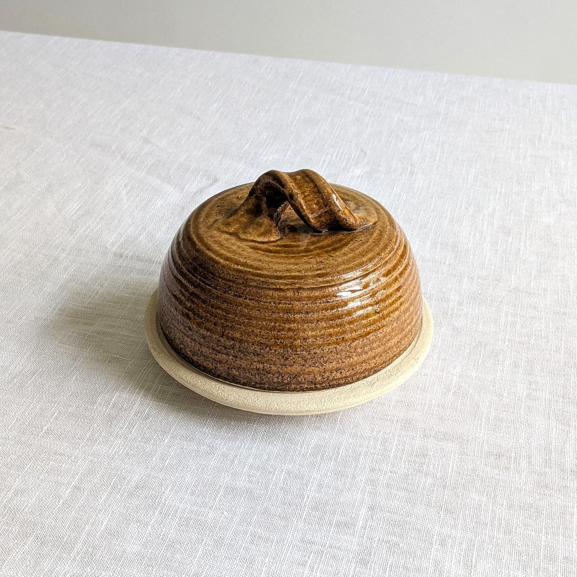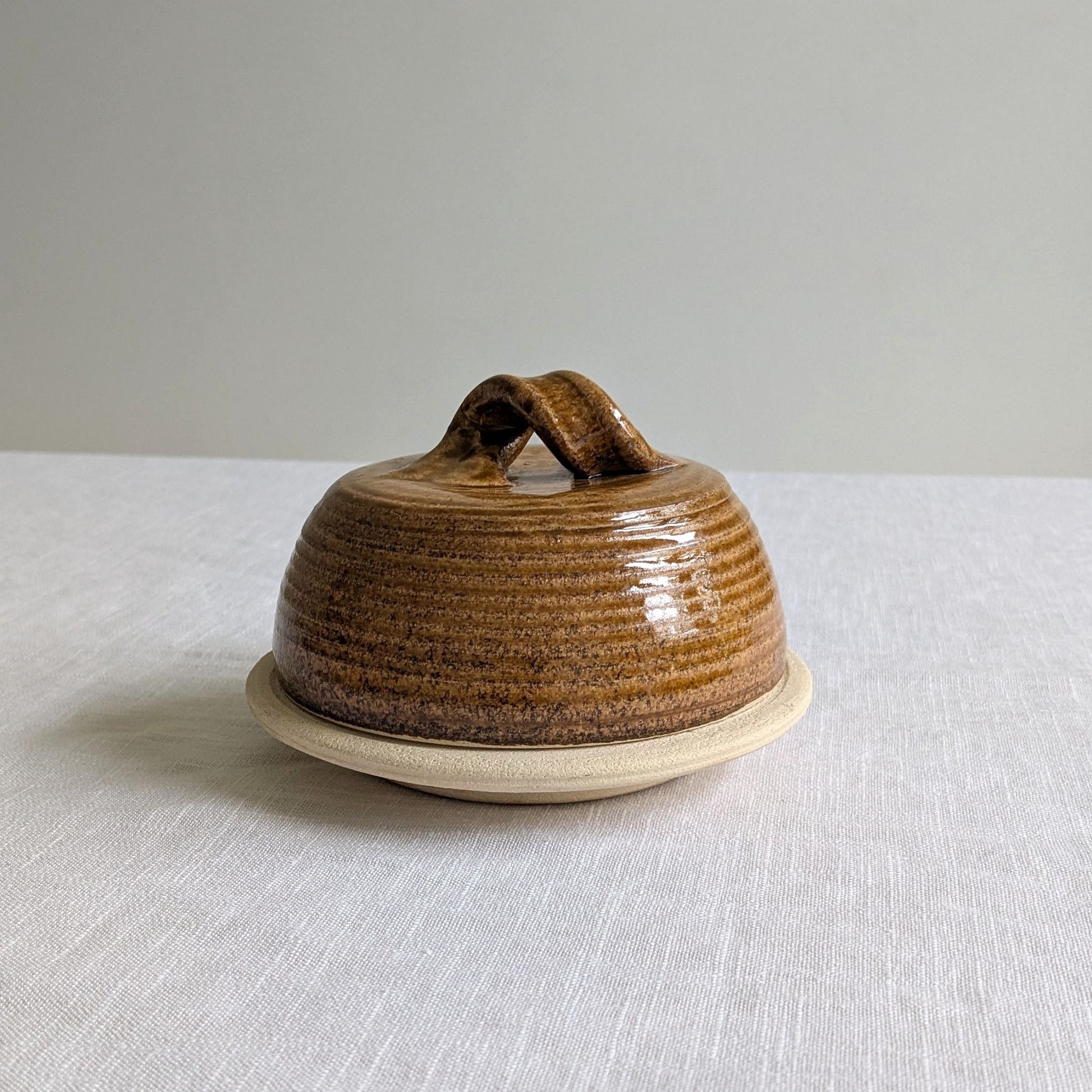 Scottish cheese or butter cloche with a glossy ochre glazed dome and contrasting beige base by Loch Tay Pottery.