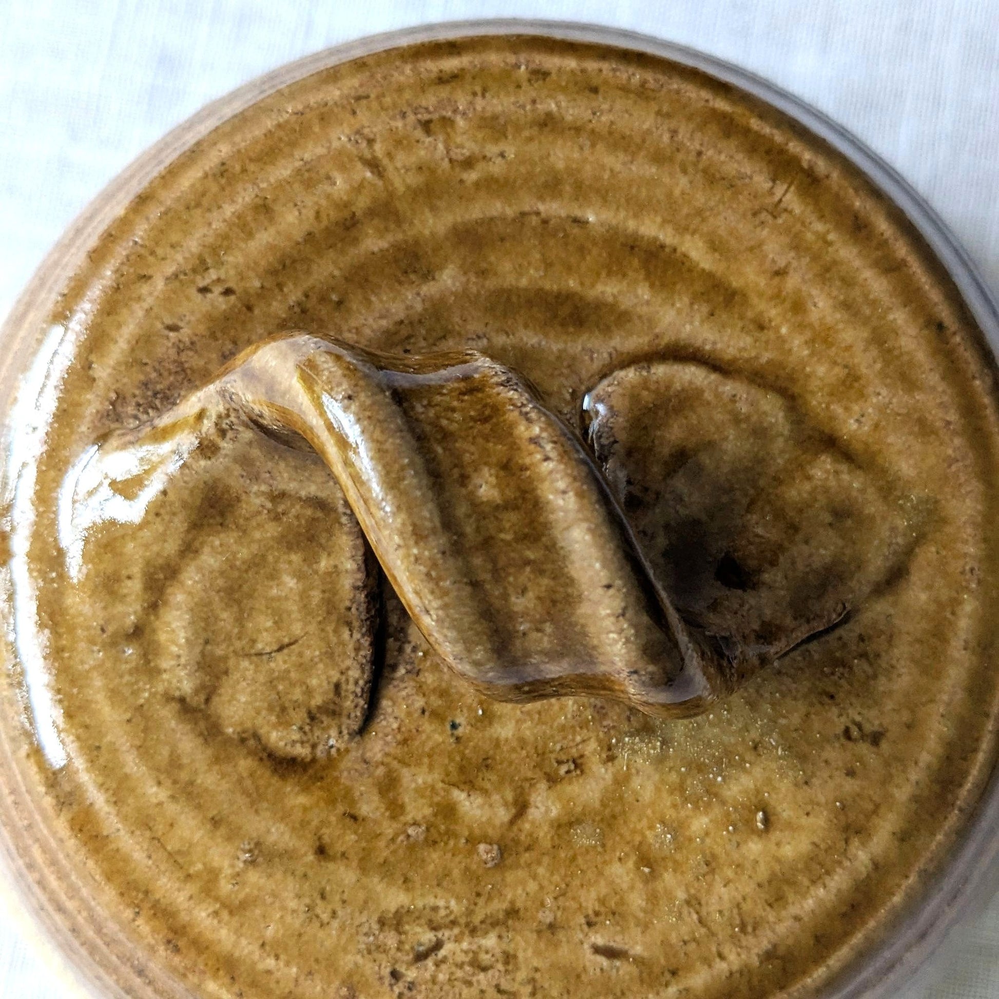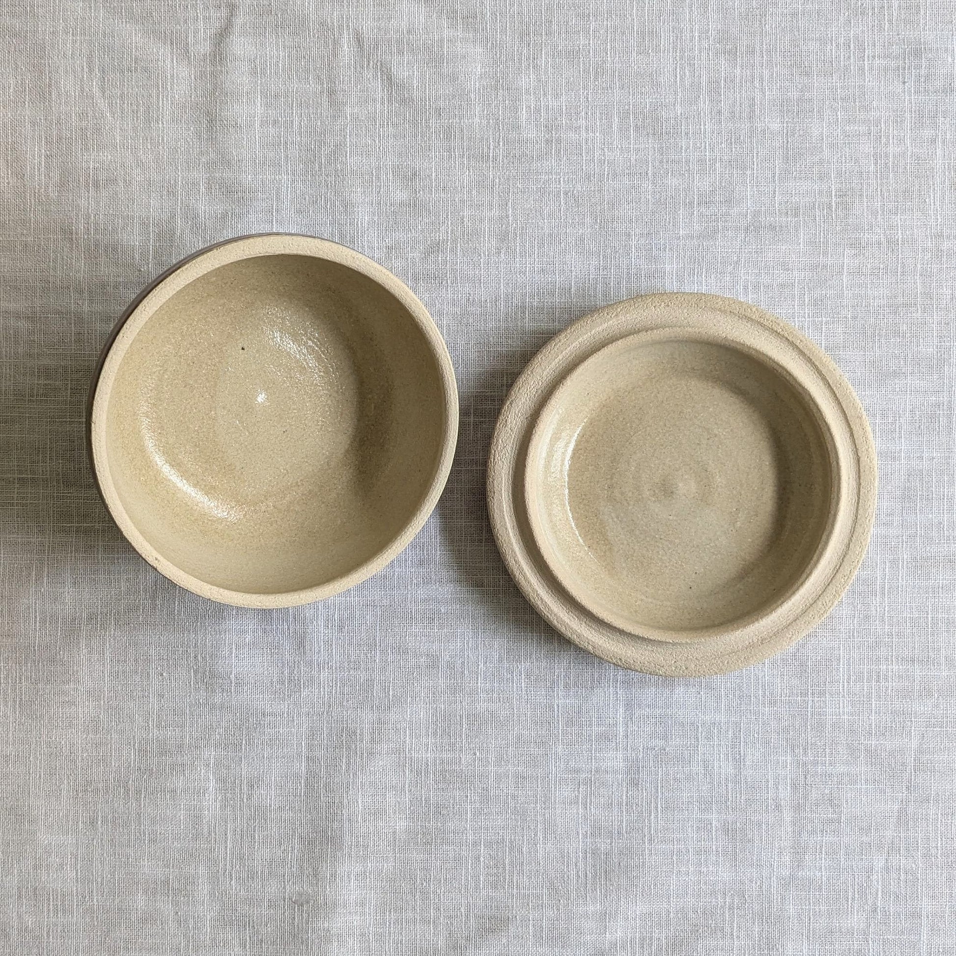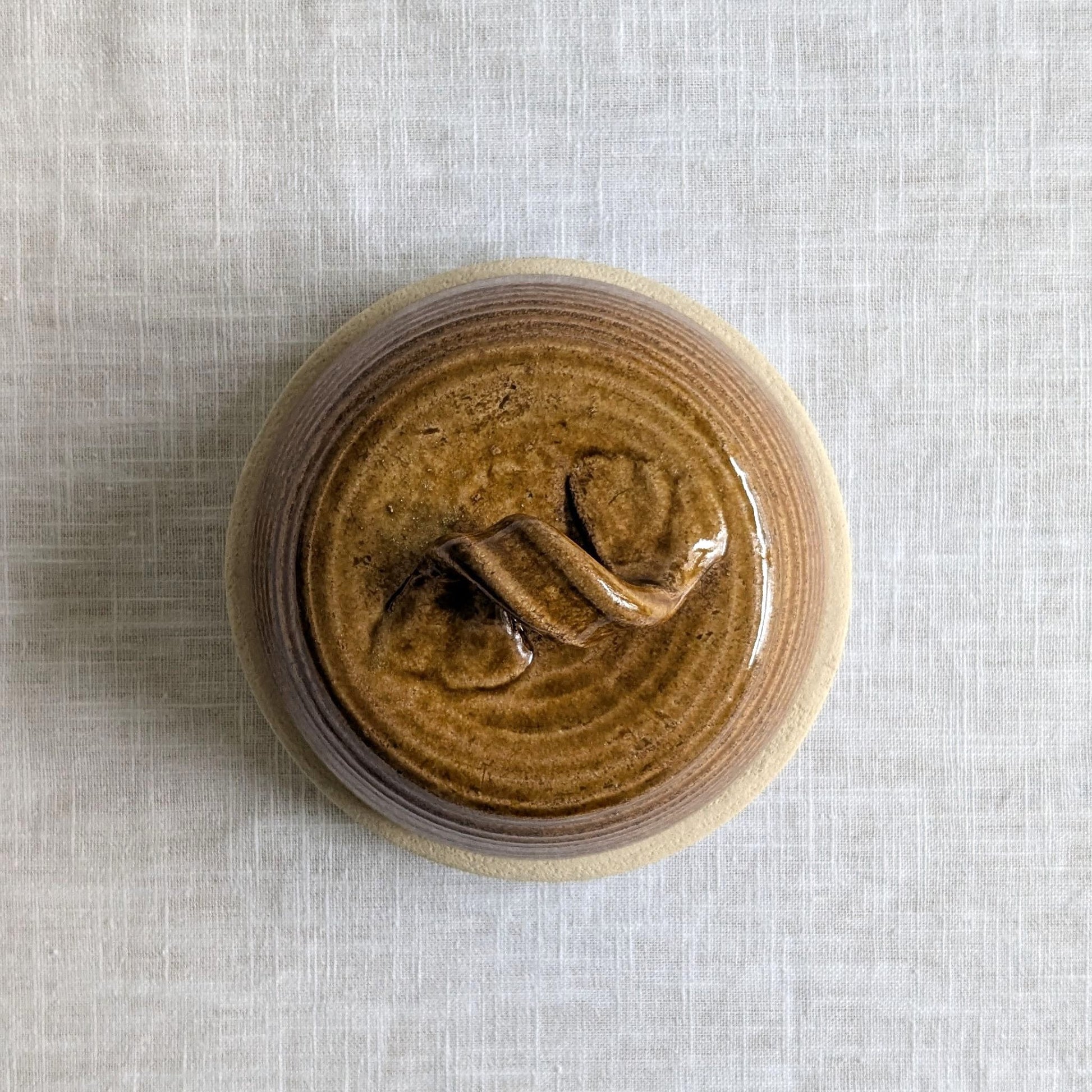 Scottish cheese or butter cloche with a glossy ochre glazed dome and contrasting beige base by Loch Tay Pottery.