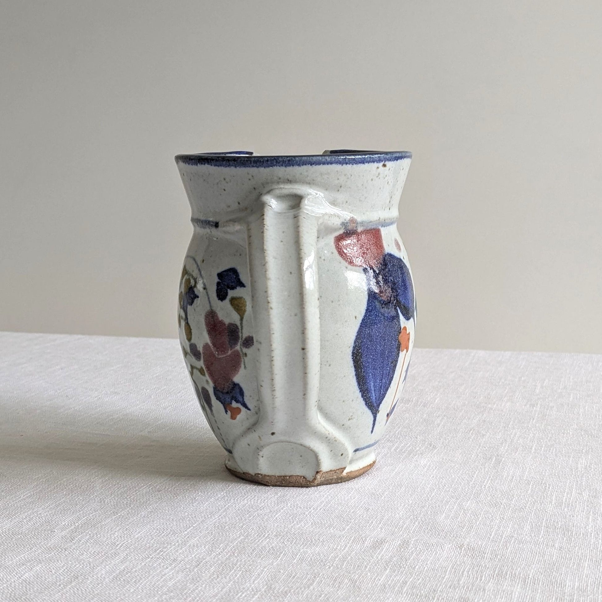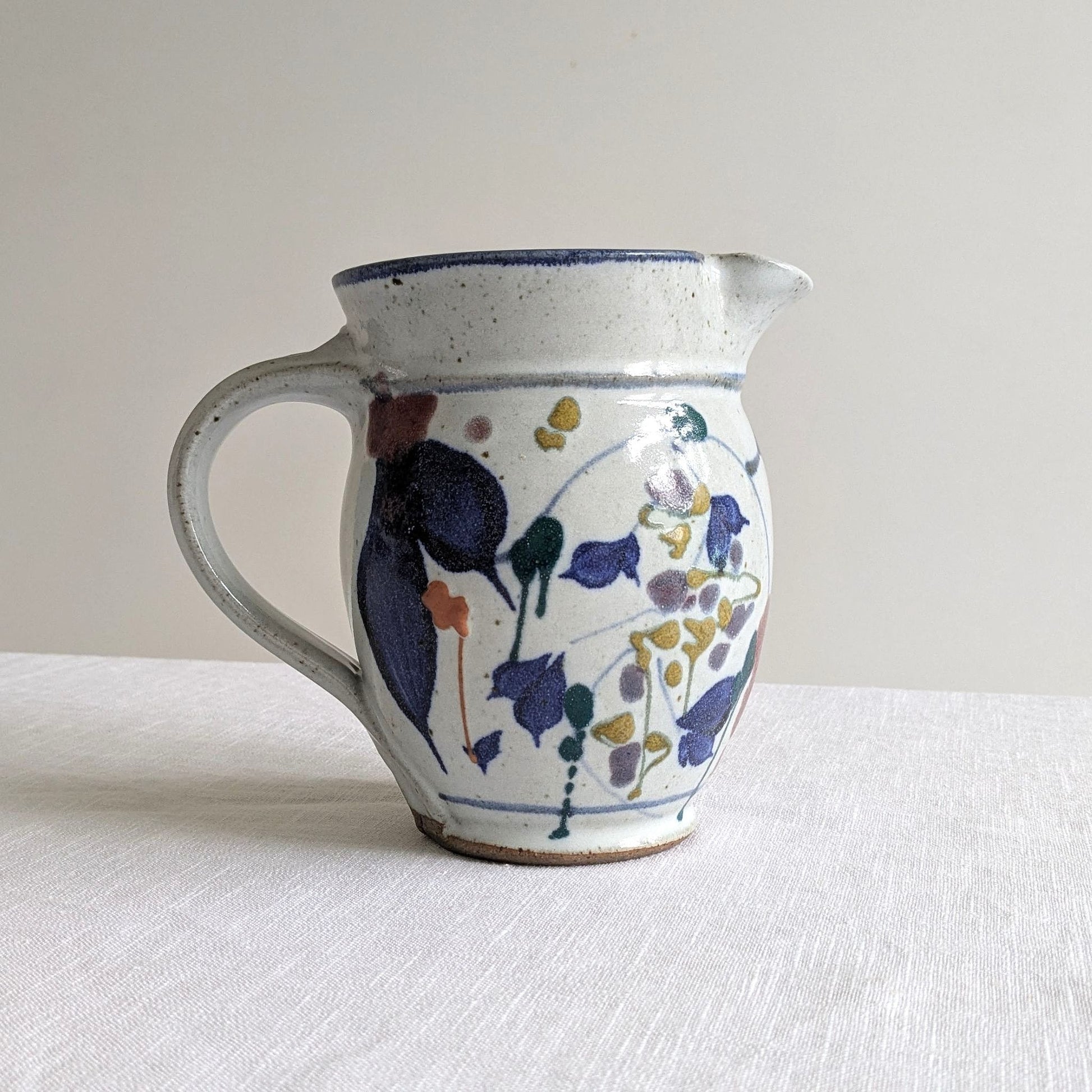 Handmade stoneware jug with a speckled grey glaze and colourful abstract splattered design in shades of blue, yellow, pink and orange.