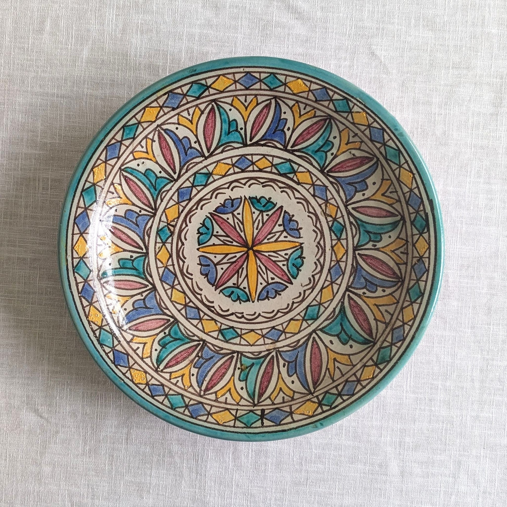 Beautiful decorative plate with an intricate hand-painted design in pastel shades of blue, turquoise, yellow and pink.
