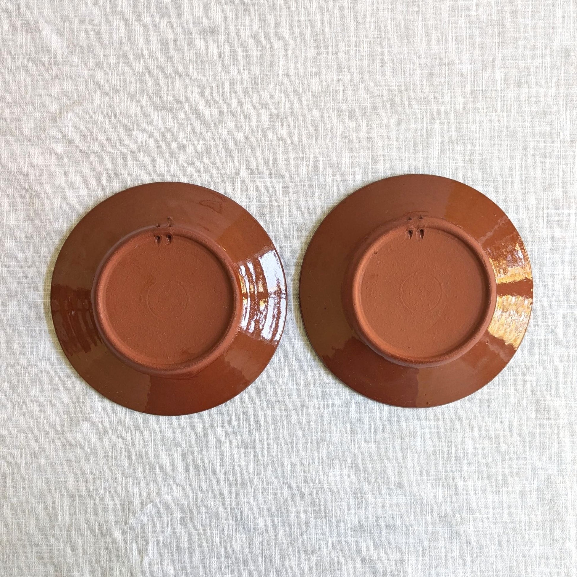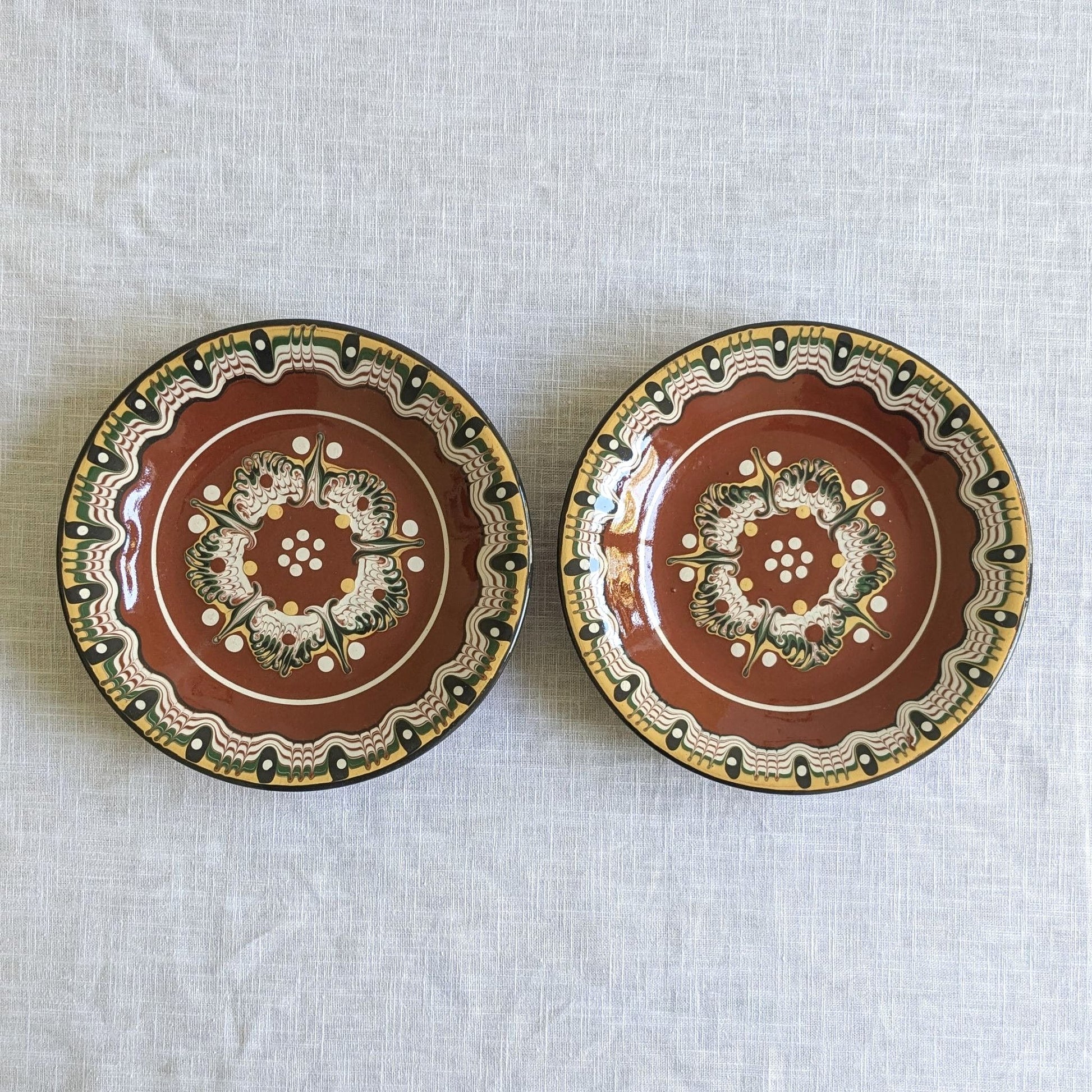 A pair of vintage Bulgarian plates in terracotta clay decorated in shades of brown, black, sand and emerald green. Finished with a clear glossy glaze.