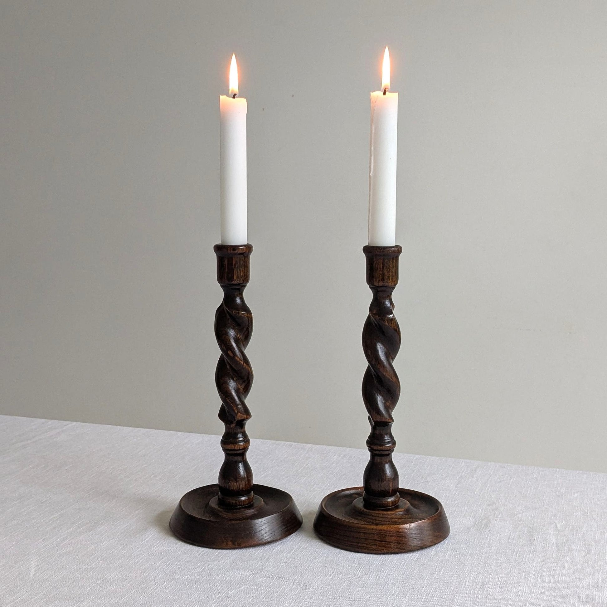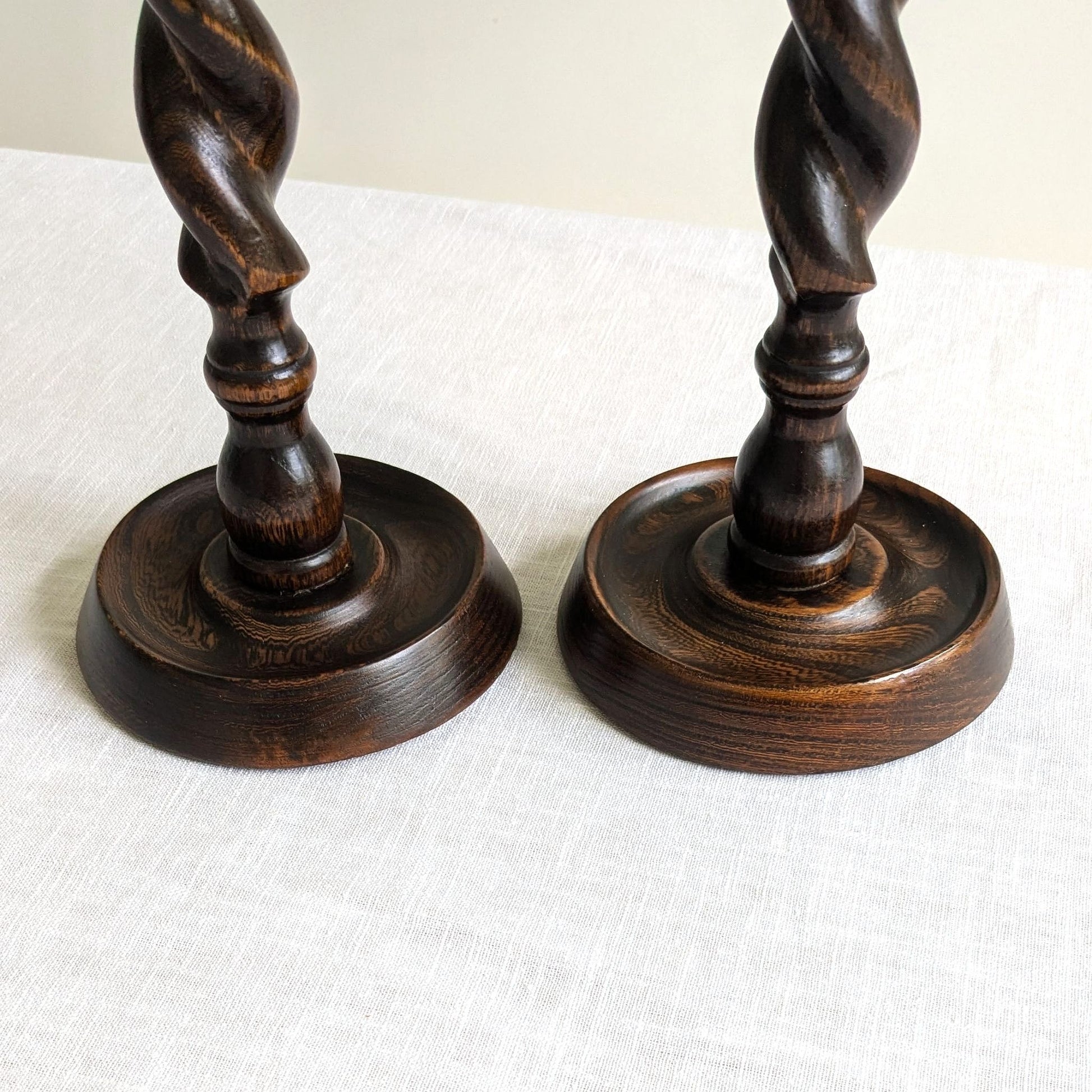Matching pair of early 20th century oak candle holders with hand-carved solid barley twist stems.