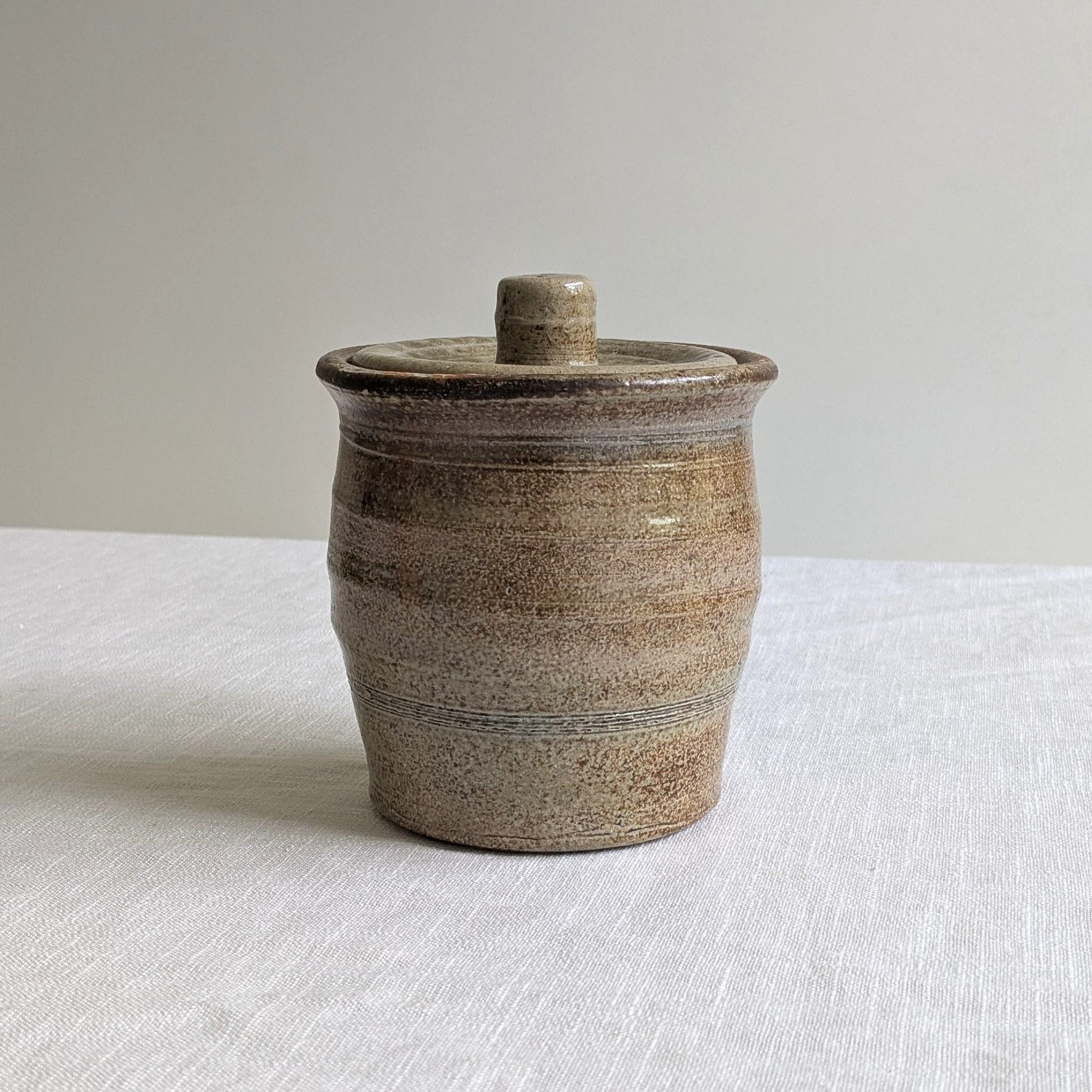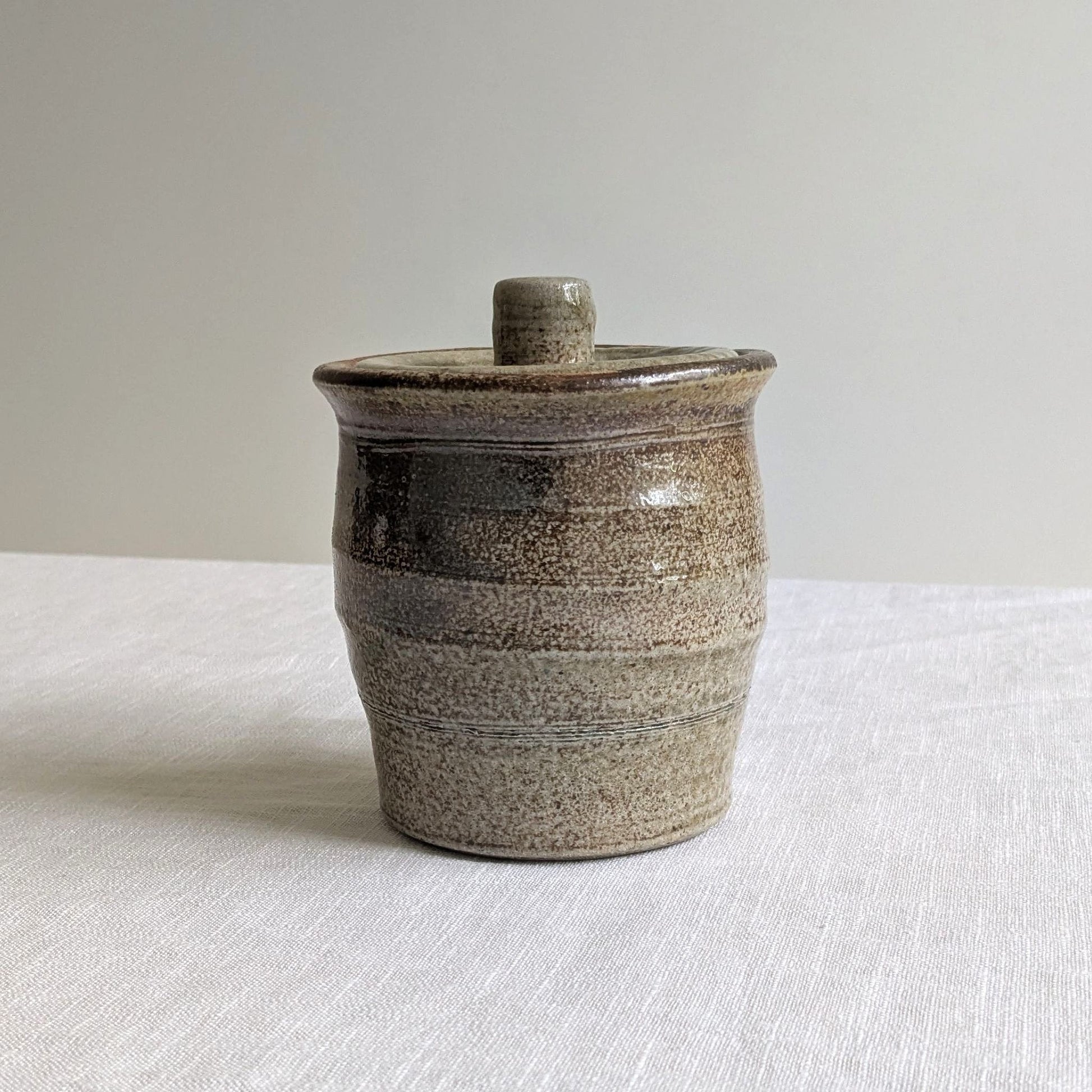 The jar is hand-thrown with a grey and brown speckled glaze and fitted lid with button-top handle. A lovely and slightly irregular form highlights its handmade nature.
