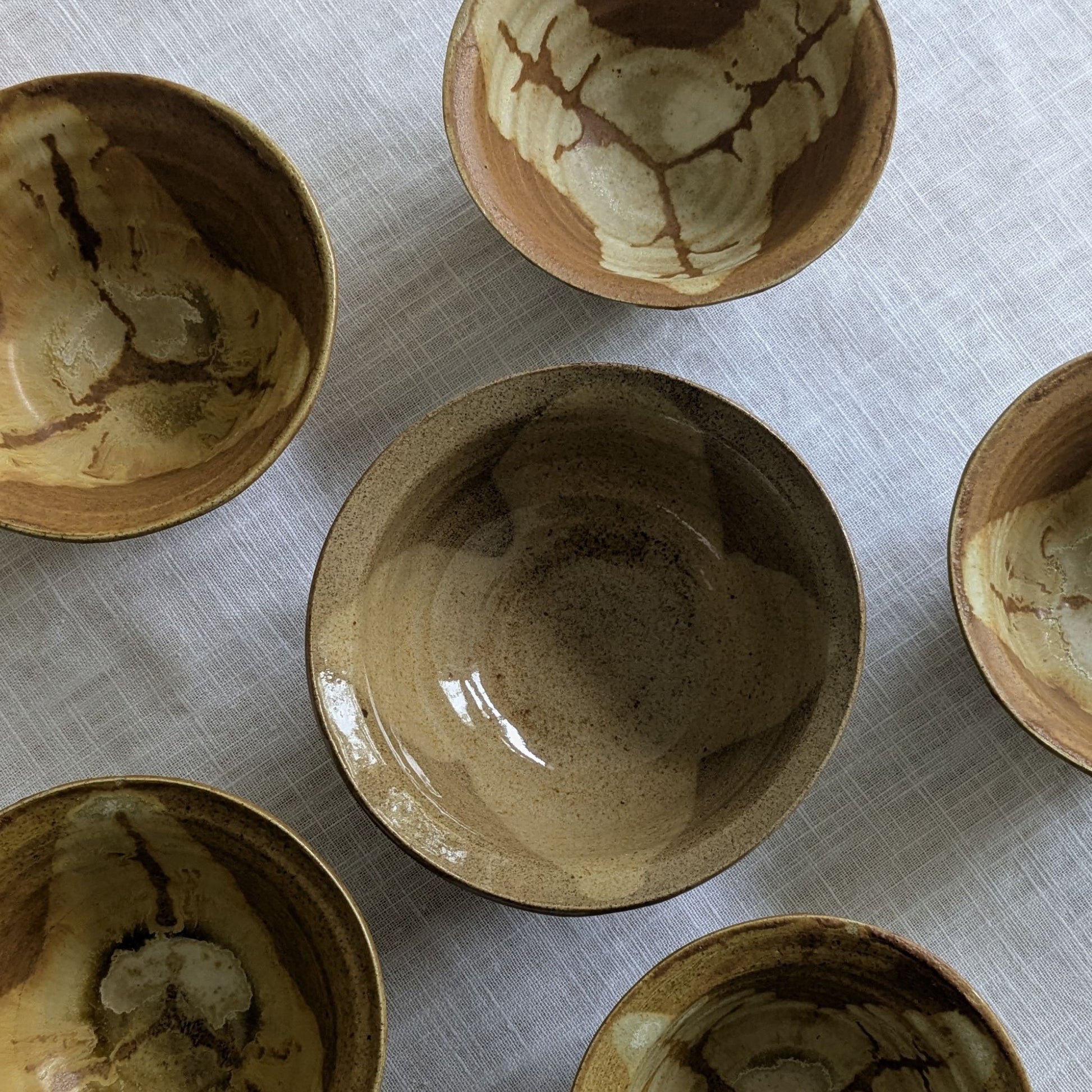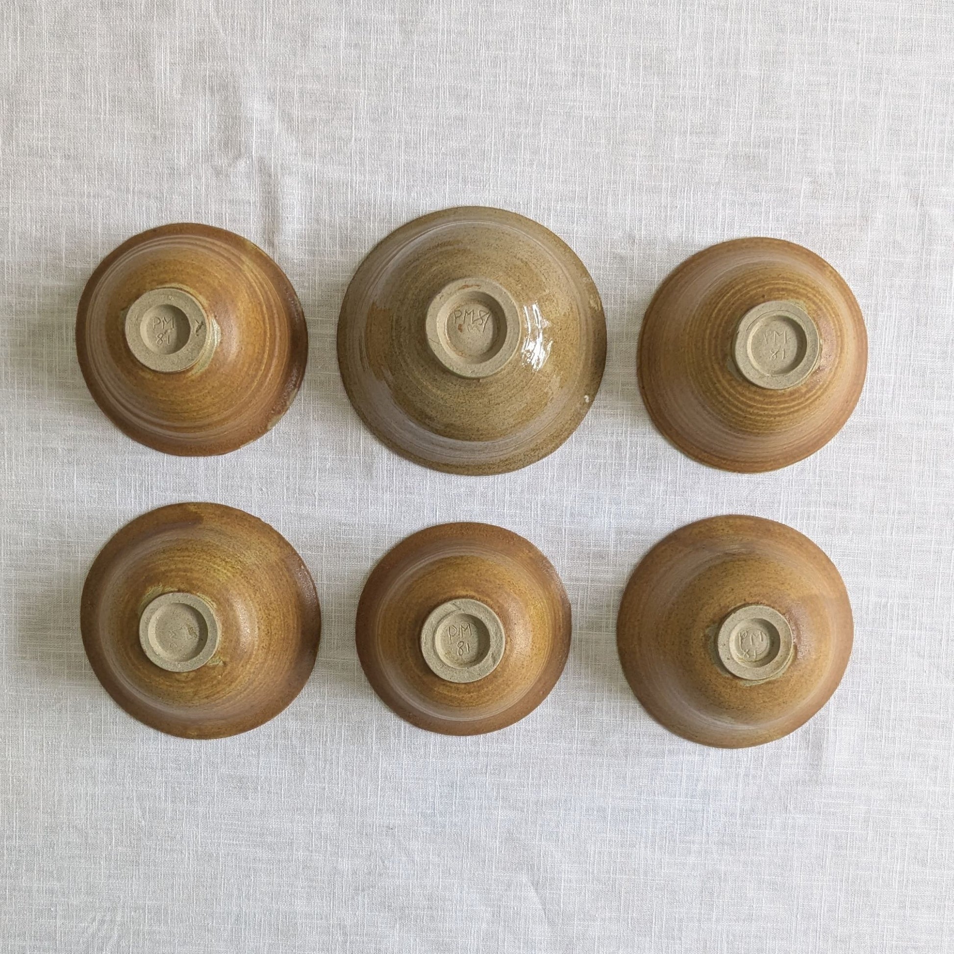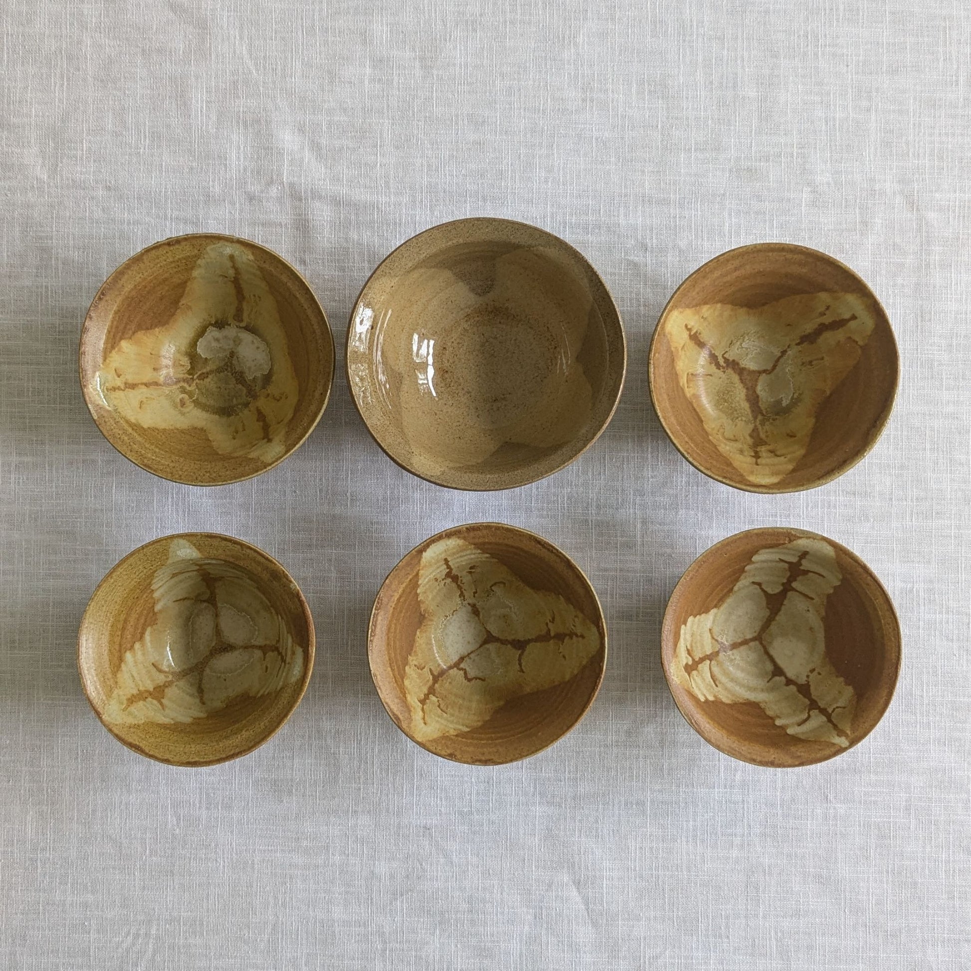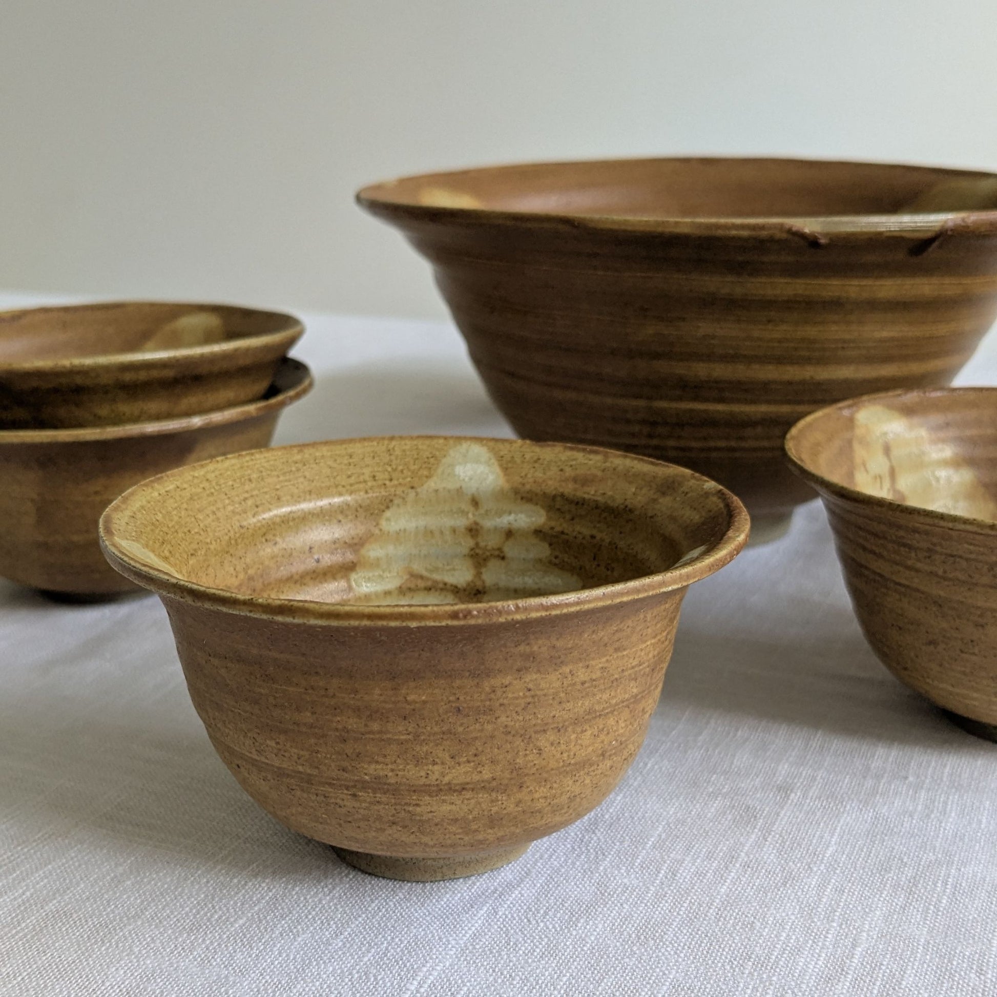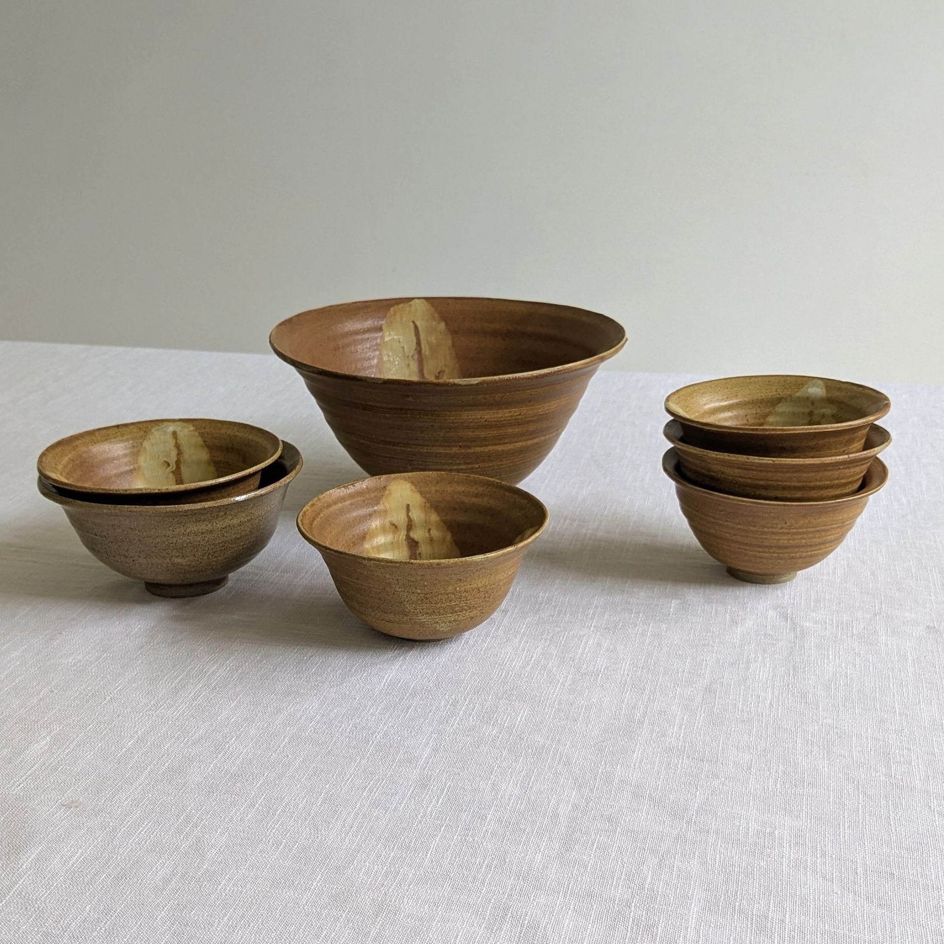 Very good vintage condition with a couple of very small chips, example photographed. The set is handmade and irregular in shape with one bowl having different colouring and a more glossy glaze.