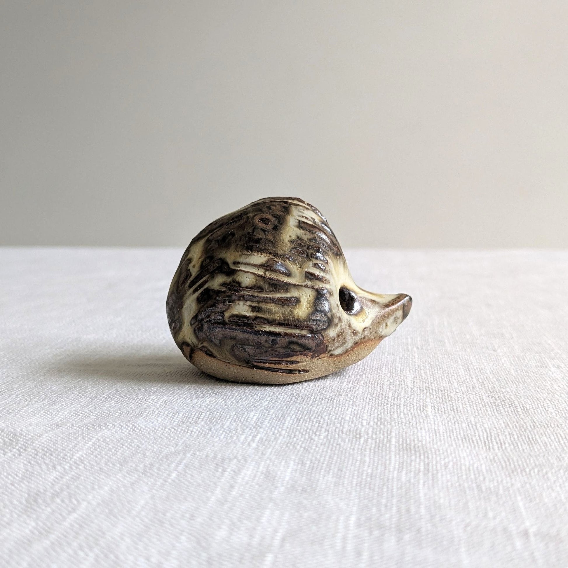 Small handmade hedgehog figure in beige stoneware with a cute, rounded form and pointed snout. Markings scratched into the clay to indicate prickles.