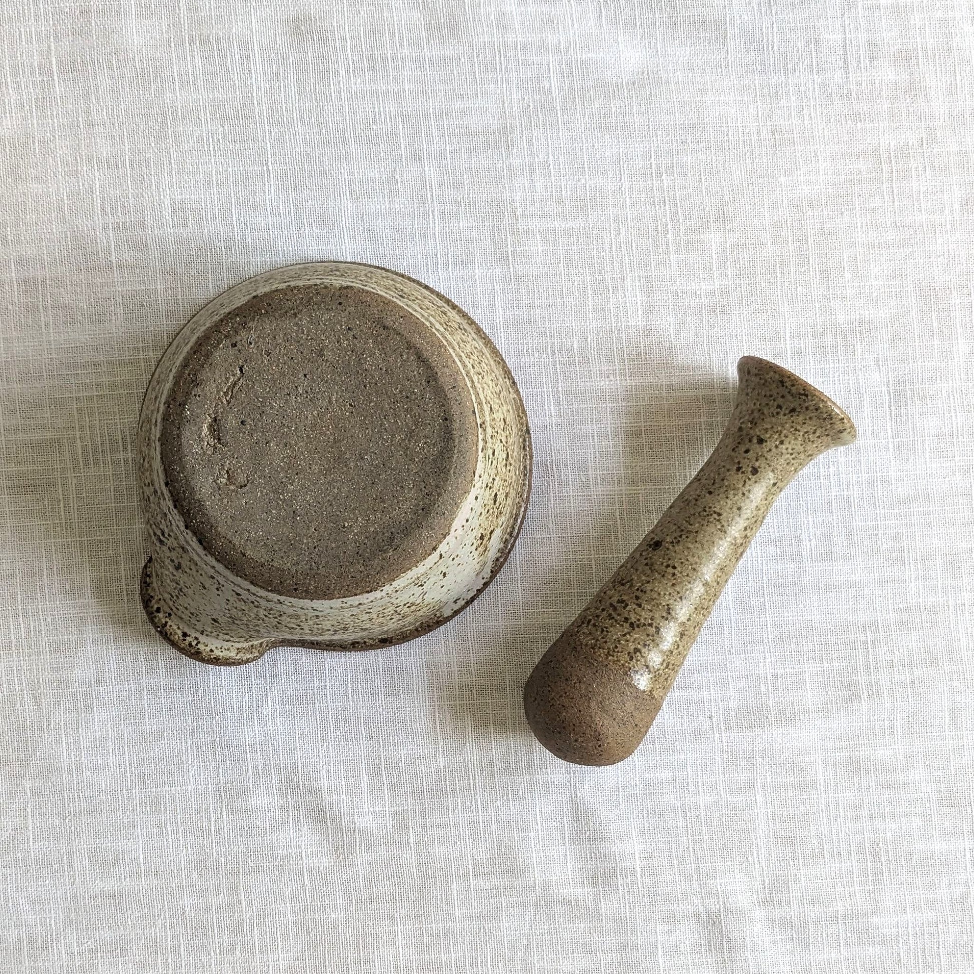 Handmade vintage pestle and mortar in coarse dark-brown stoneware with a speckled brown and beige glaze with grey drips. Shaped spout to the mortar.