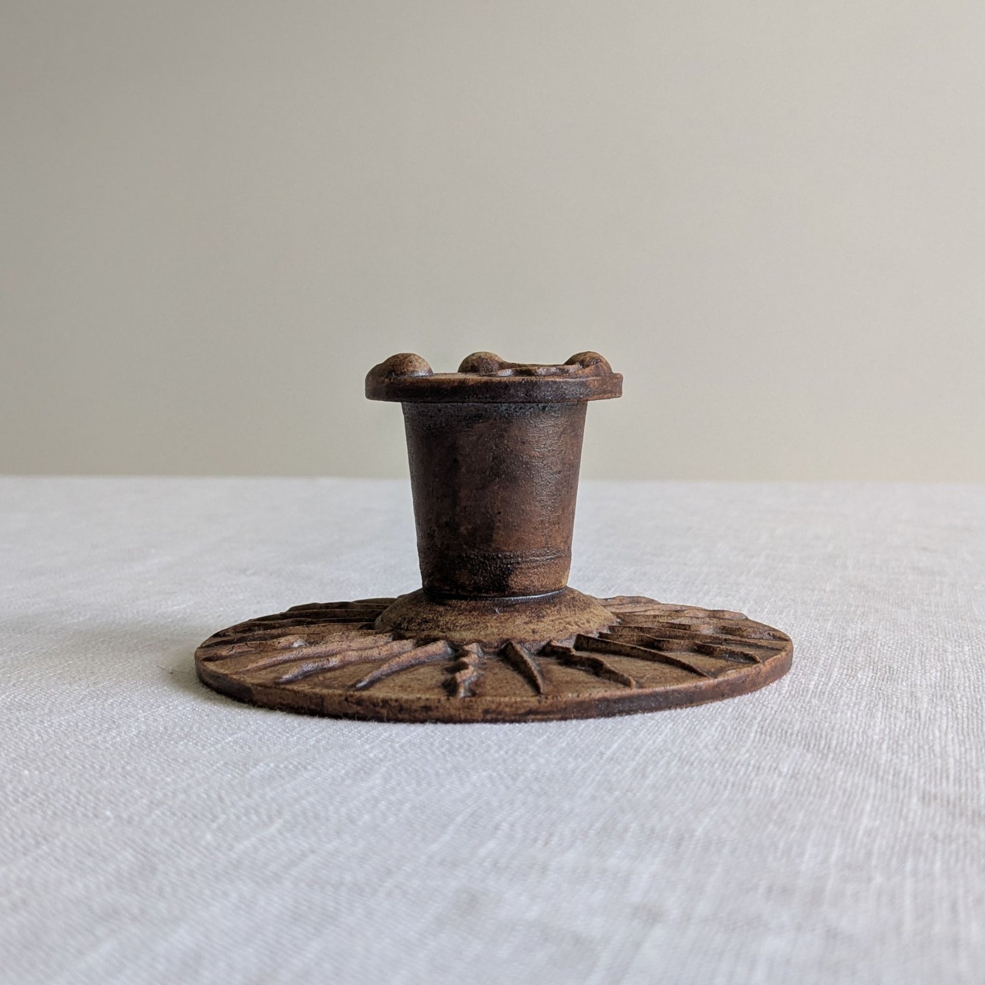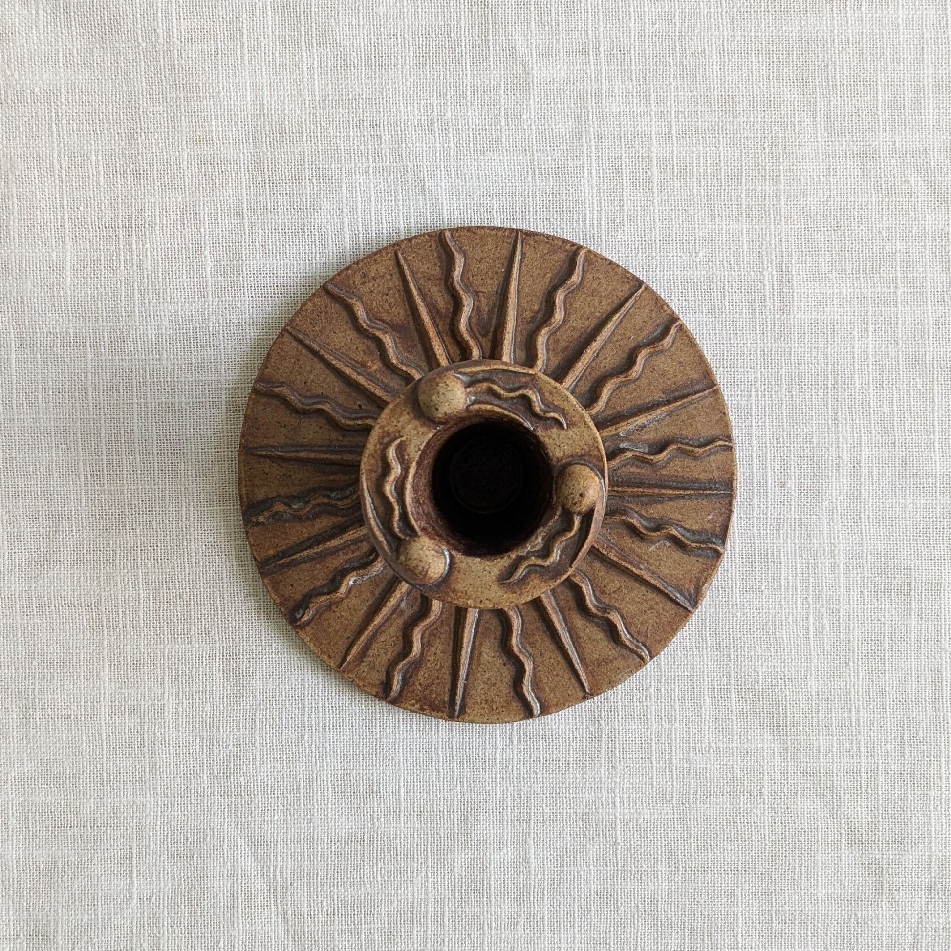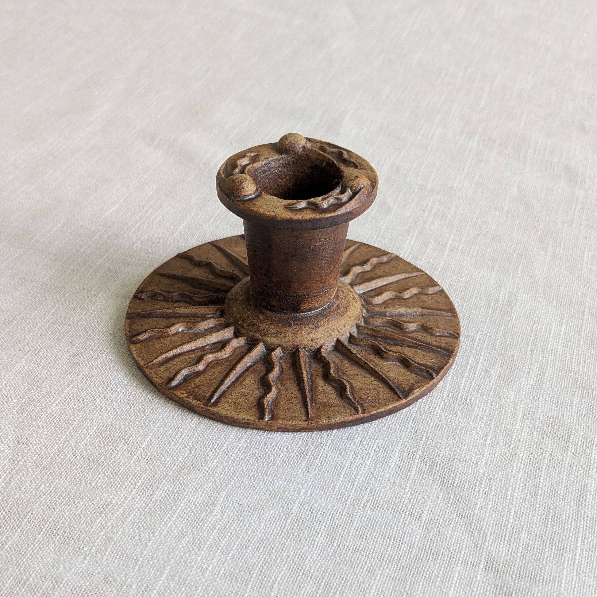 Vintage stoneware candle holder with a sunburst style design to the base and little squiggles around the candle opening.