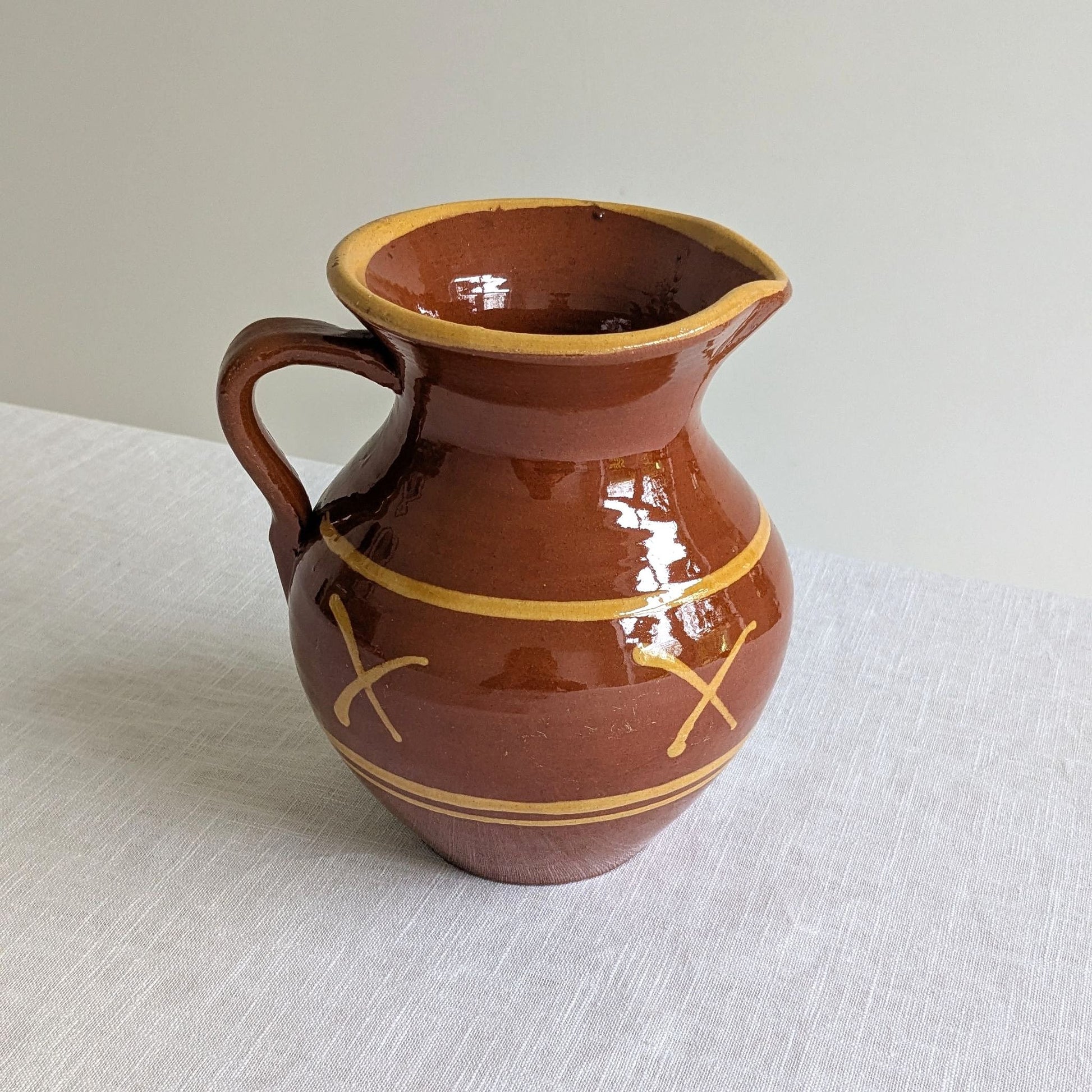 Wonderful hand-formed jug in rich terracotta clay with a painted design of yellow crosses and bands and a clear glossy glaze.