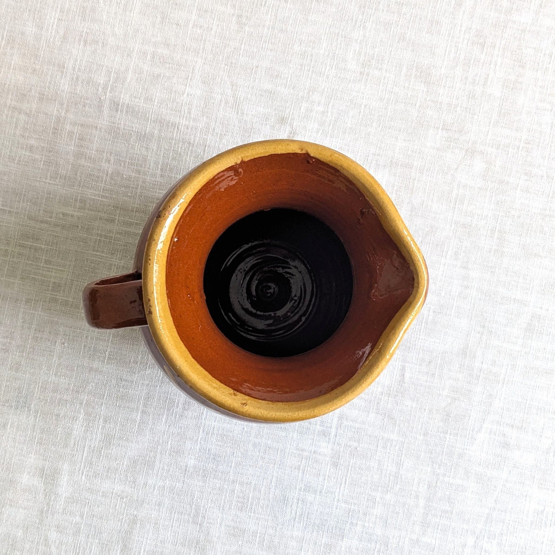 Rustic in appearance with a pinched spout and simple handle roughly pressed into the body of the jug. Likely a Spanish wine / Sangria jug.