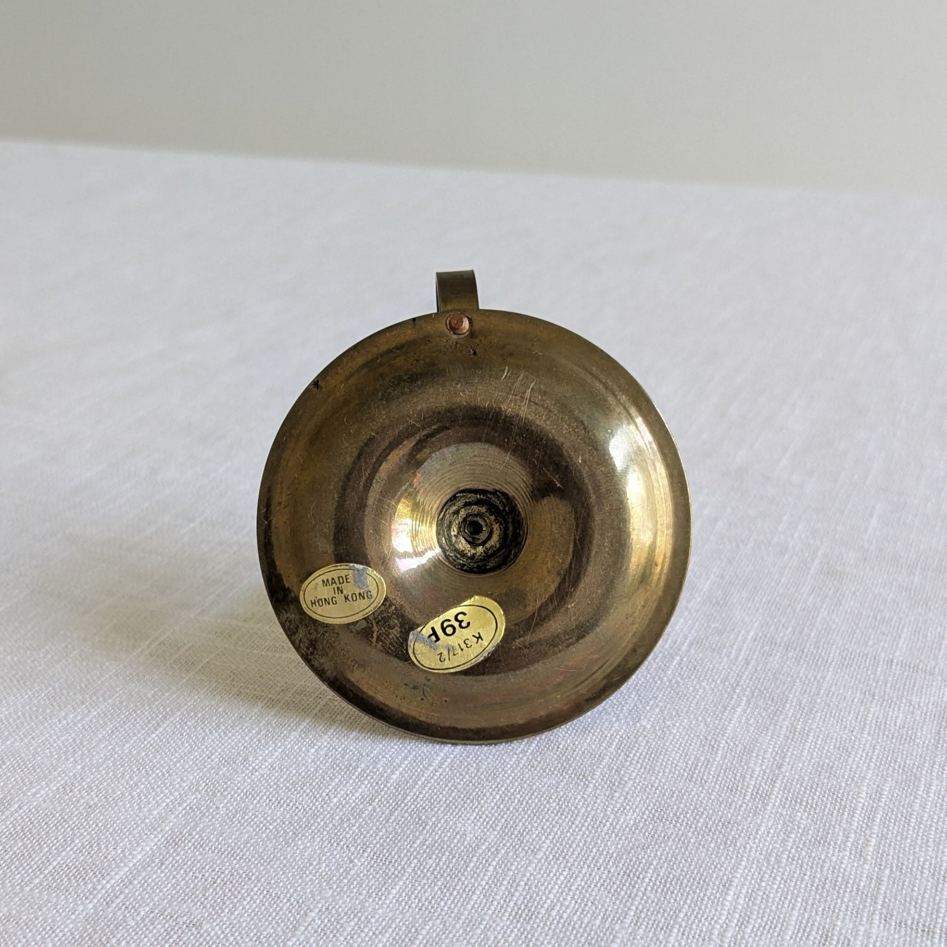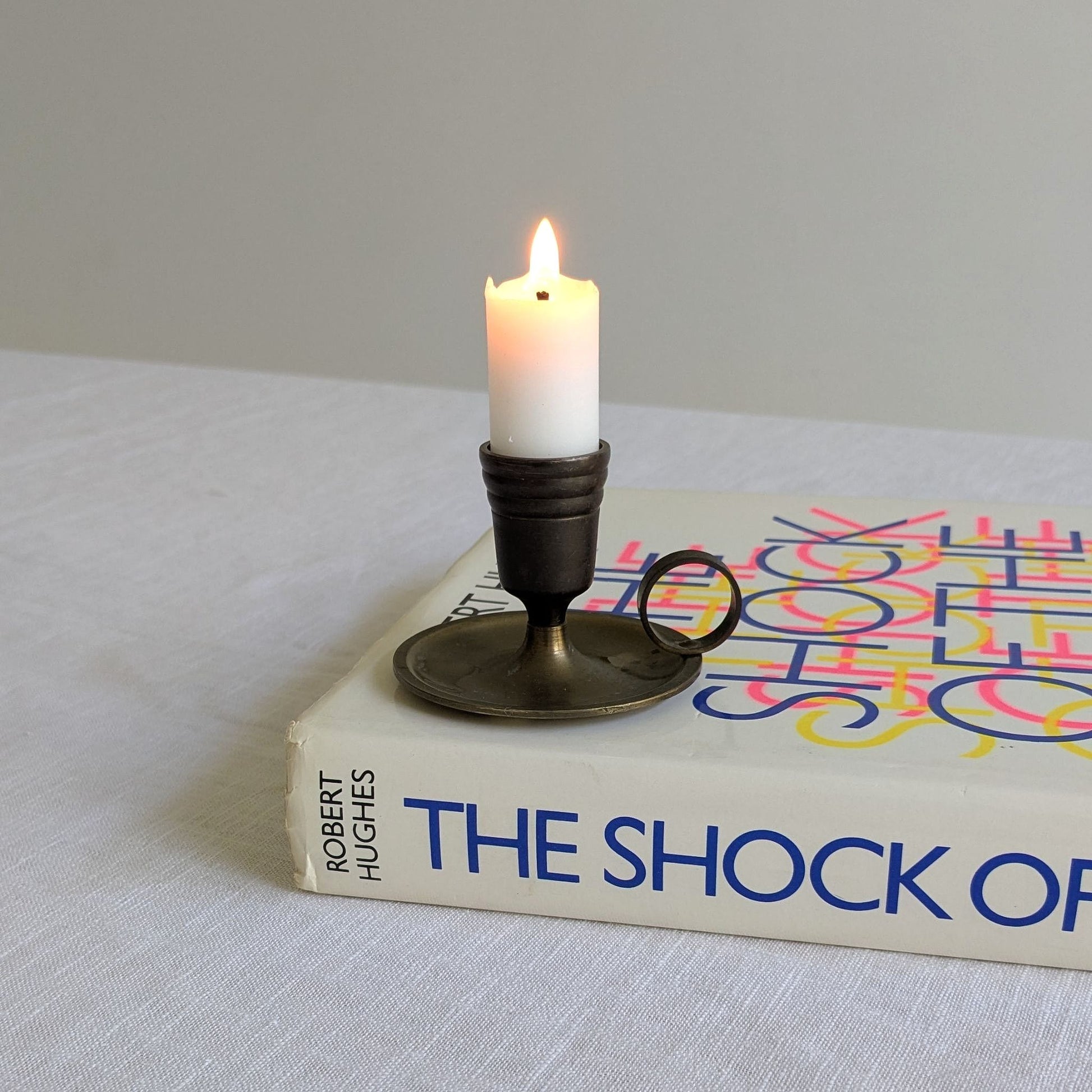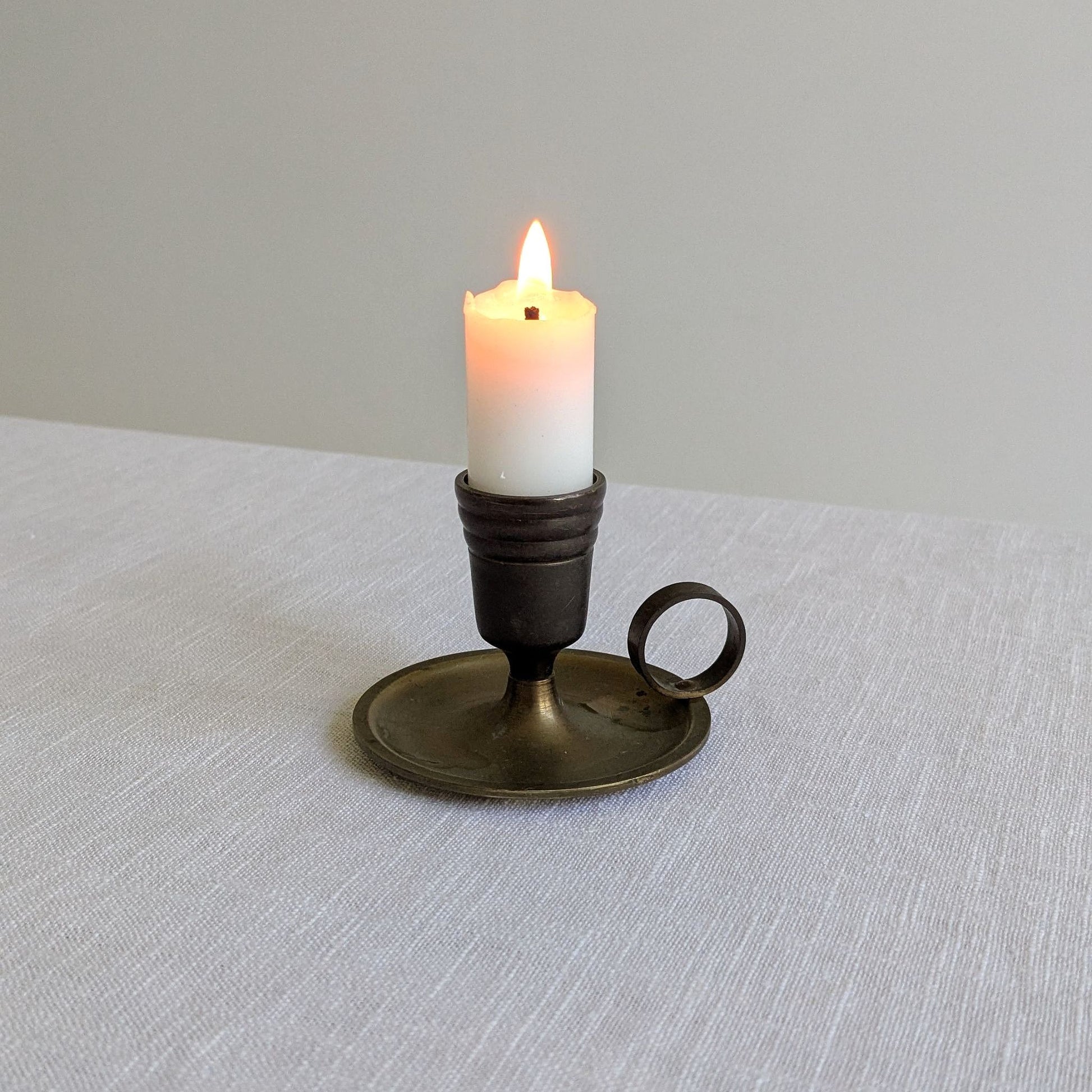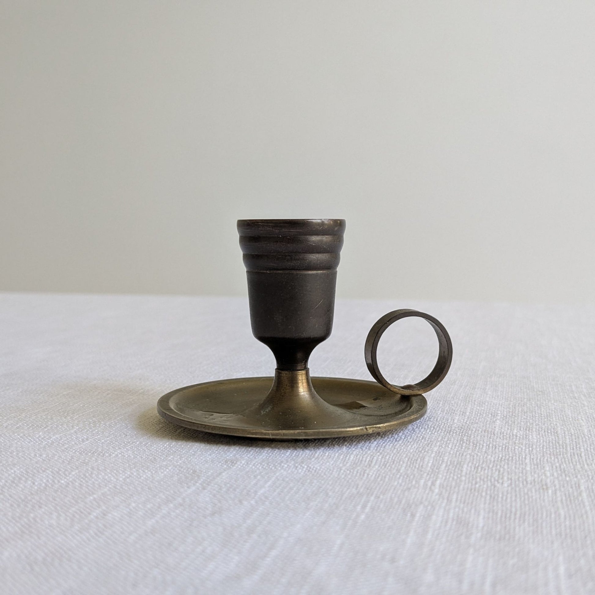 Cute little rustic chamberstick in brass. The socket and circular finger-loop handle are subtly painted bronze which adds contrast to the natural brass drip tray.
