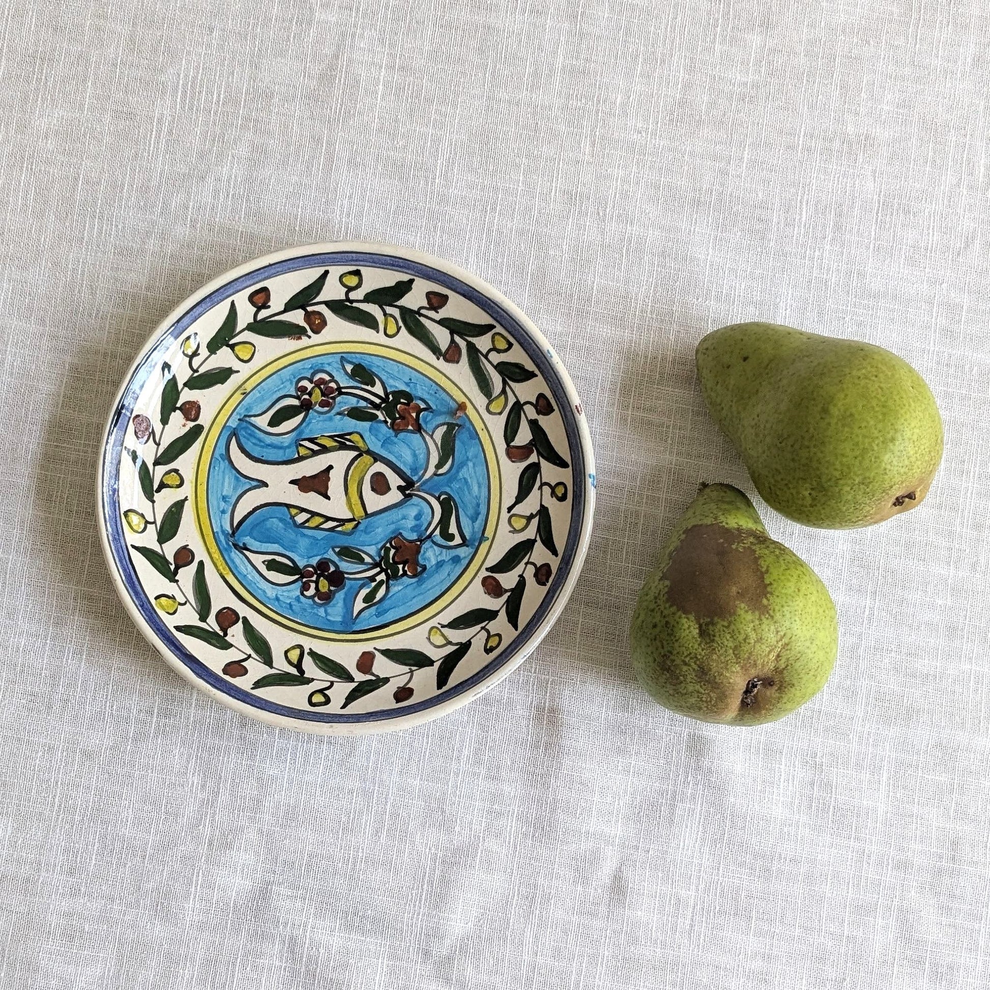 Small folk art plate from Tunisia with a hand-painted design of a fish in a blue pool surrounded by flowers and a border of foliage.