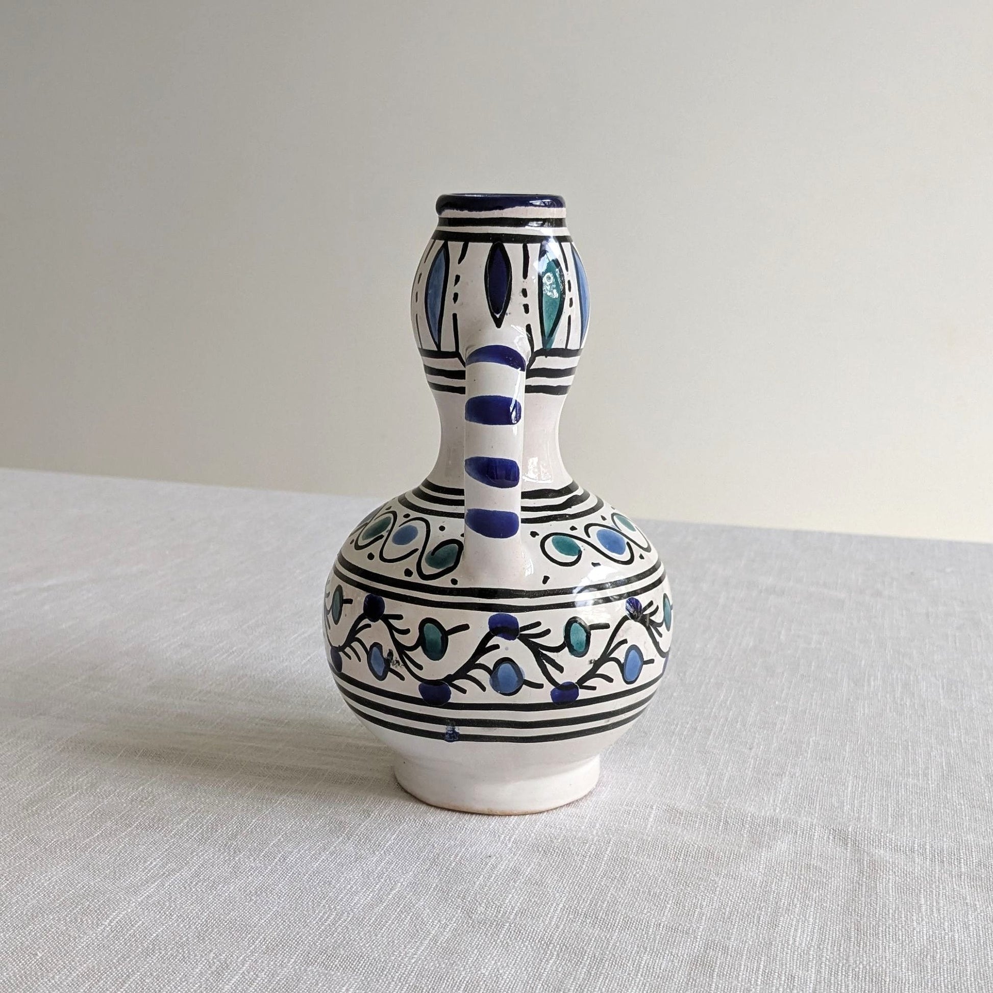Vintage amphora style vase from Tunisia with a slightly rustic appearance and twin arching handles.