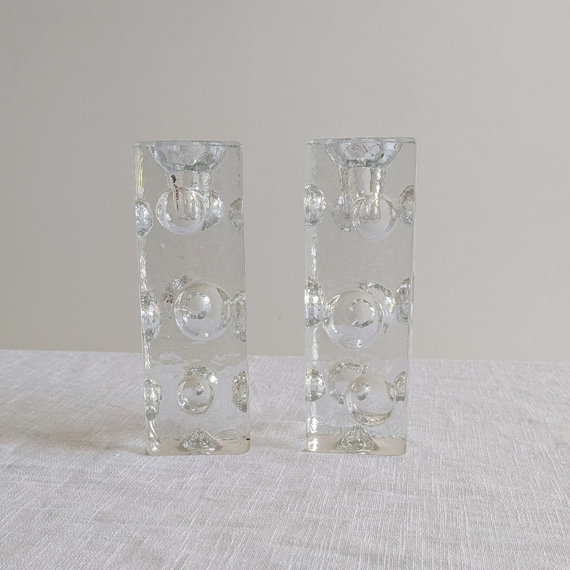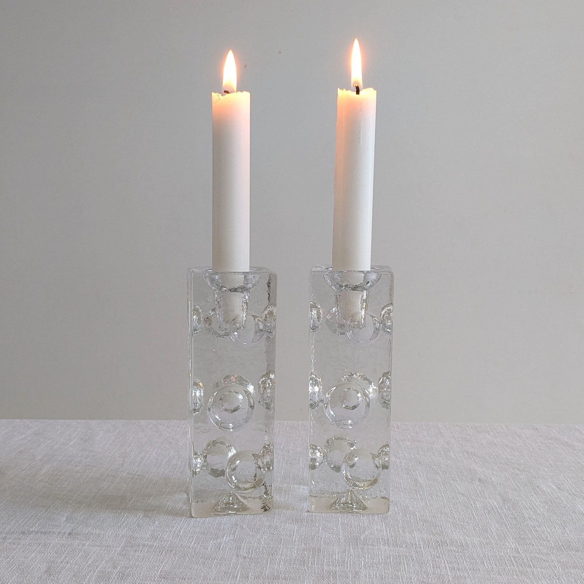 Very good vintage condition with light scratches, air bubbles and ridges in the glass. A small inclusion in the glass to the base of one candlestick from the time of manufacture, as photographed.